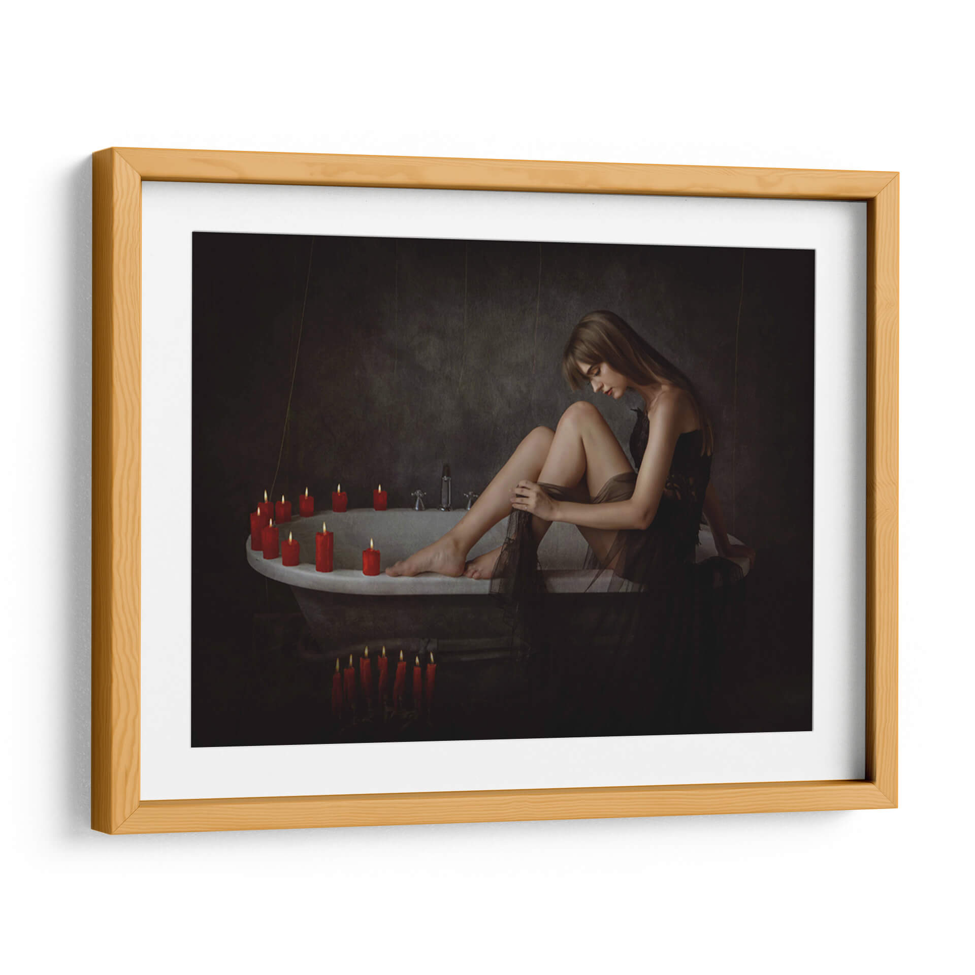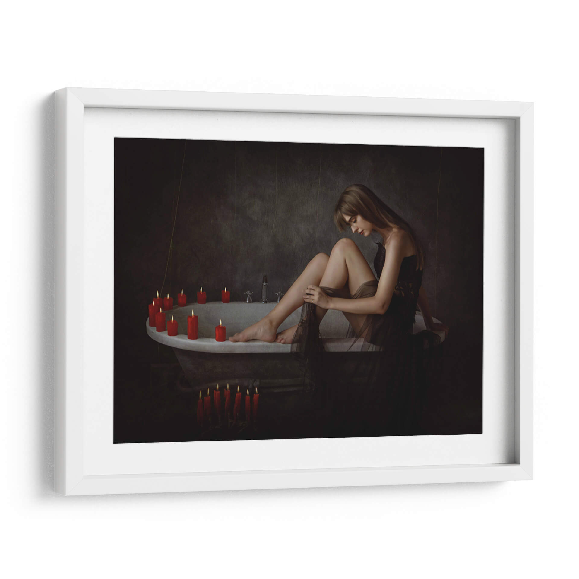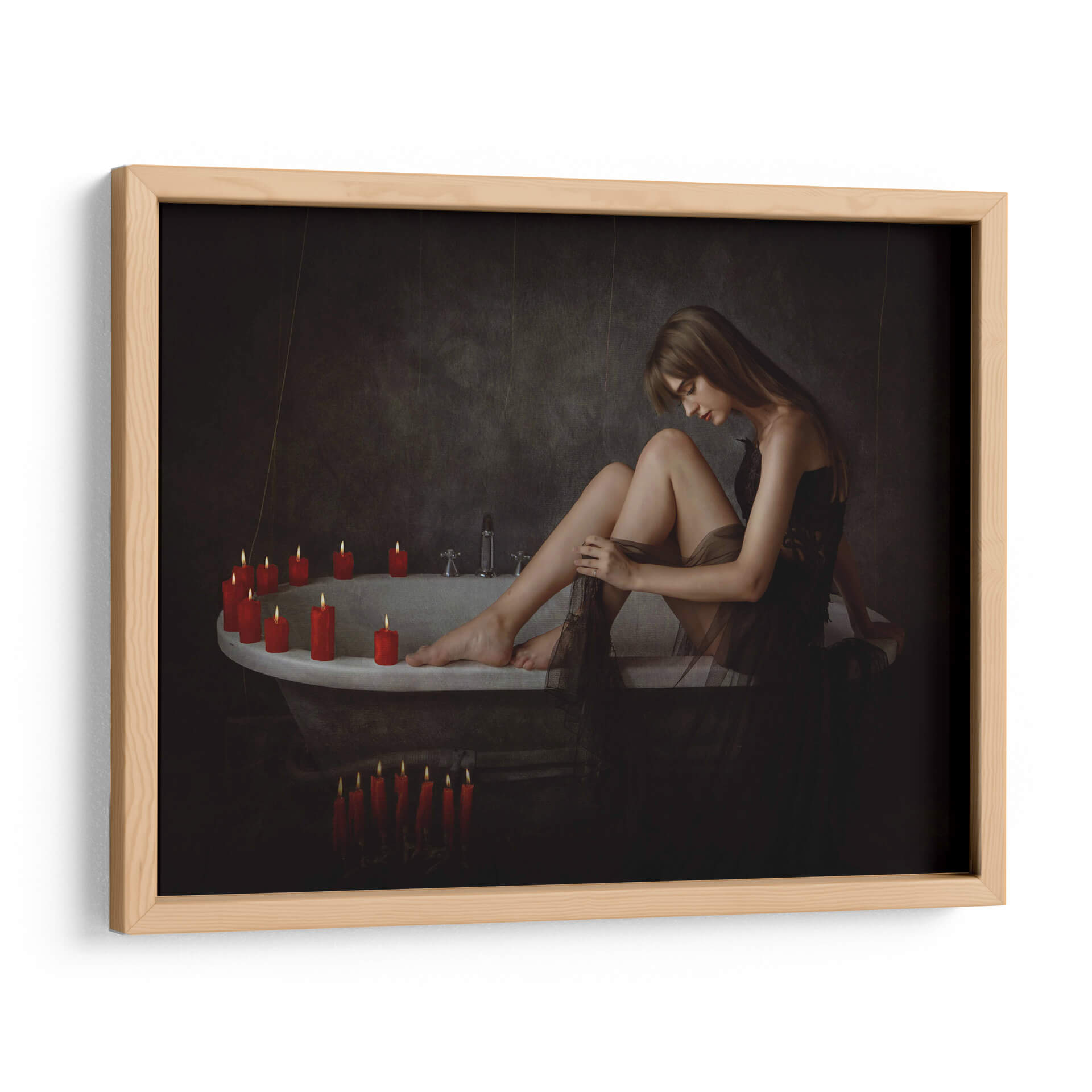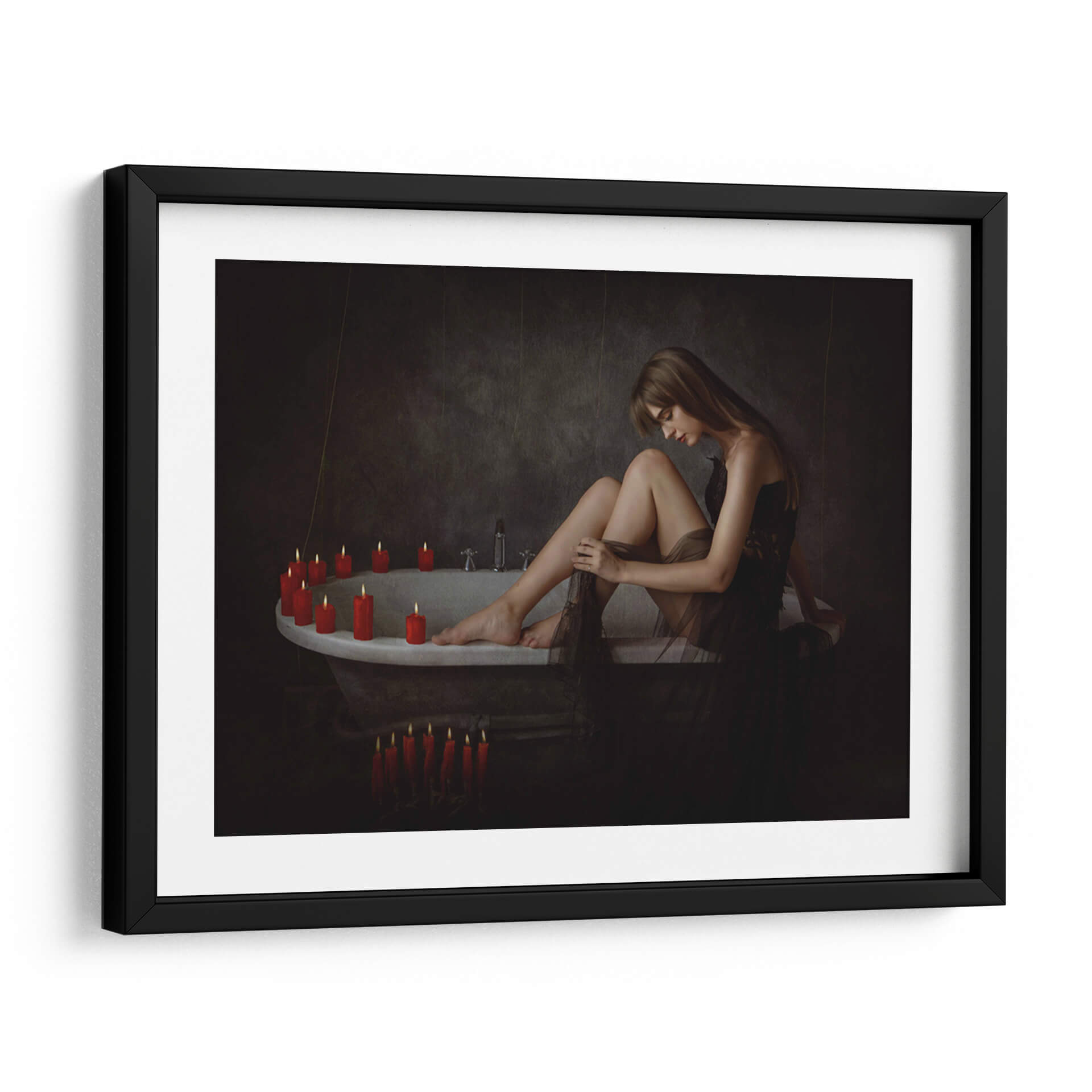 Sumérgete en la atmósfera íntima y enigmática de "Tori sobre la tina", una obra maestra del artista Sebastian Kisworo. Este cuadro decorativo captura un momento de introspección femenina, donde la suave luz de las velas ilumina la serenidad y la vulnerabilidad de una mujer en un baño antiguo. La paleta de colores, dominada por tonos oscuros y contrastada por el cálido resplandor de las velas rojas, crea un ambiente de calma y misterio, ideal para espacios que buscan un toque de sofisticación y profundidad emocional. La composición cuidadosa y el estilo realista-cinematográfico de Kisworo invitan a la contemplación, haciendo de esta pieza un punto focal cautivador para tu hogar u oficina. Transforma tus paredes en una galería personal con esta evocadora representación de la quietud y la belleza efímera. "Tori sobre la tina" es más que una simple imagen; es una invitación a la reflexión y a la conexión con uno mismo, perfecta para añadir un aire de elegancia atemporal a cualquier decoración.