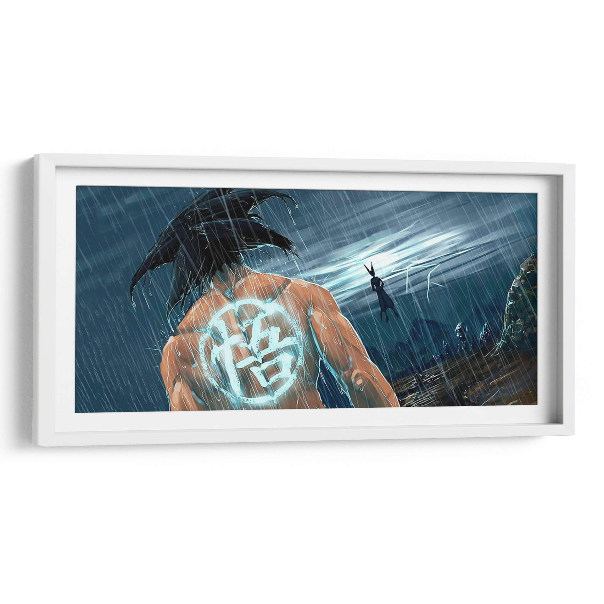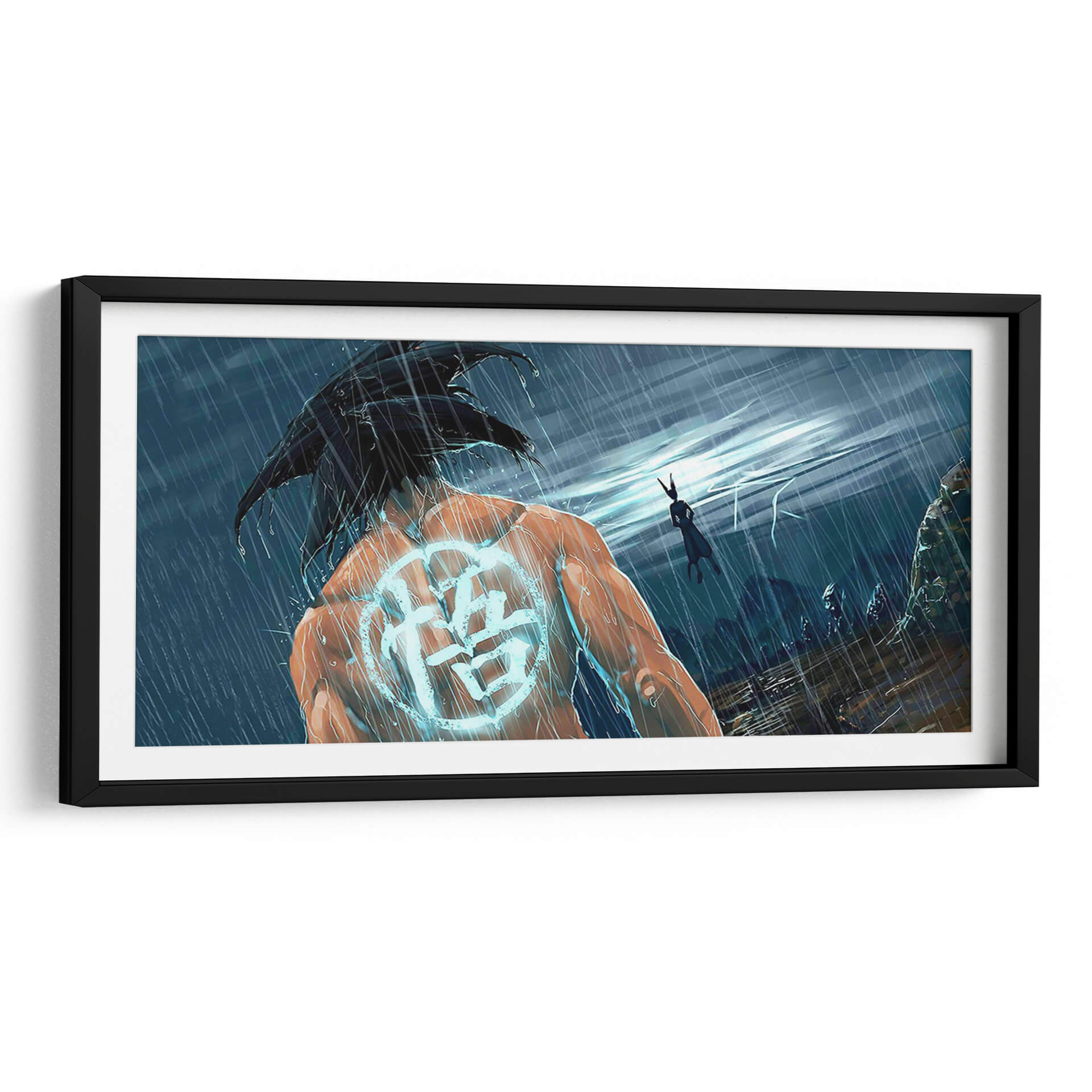 Sumérgete en la intensidad de 'Goku bajo la lluvia', una obra de arte digital que captura un momento de profunda reflexión y poder latente. La escena se desarrolla en un ambiente nocturno y lluvioso, donde las gotas de agua caen con fuerza, creando una atmósfera sombría pero cargada de energía. El protagonista, visto desde atrás, revela un símbolo brillante en su espalda que irradia una luz azulada, contrastando con los tonos oscuros y fríos del entorno. La composición enfatiza la soledad y la preparación, con una figura secundaria silueteada en la distancia, sugiriendo un conflicto inminente o un destino por alcanzar. Los detalles de la piel mojada, el cabello alborotado por el viento y la iluminación dramática transmiten una sensación de realismo fantástico. Este cuadro decorativo es perfecto para los amantes del anime y el arte con un toque épico, ideal para espacios masculinos, salas de juegos o estudios, aportando un punto focal dinámico y evocador. Su estilo artístico único y su temática de superación lo convierten en una pieza inspiradora para cualquier pared.
