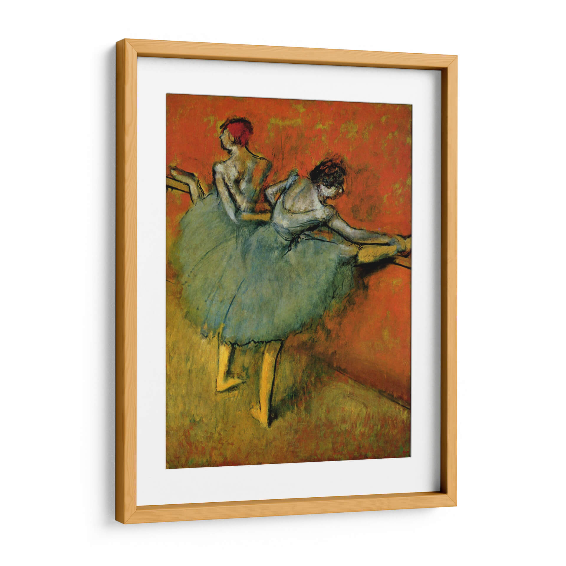 Sumérgete en el mundo de la danza con este cautivador cuadro decorativo que captura la esencia de 'Bailarinas en la barra' de Edgar Degas. La obra maestra presenta dos bailarinas en un momento de intensa concentración y gracia, con sus cuerpos esbeltos delineados contra un vibrante fondo naranja y texturizado. Los delicados tutús en tonos verde azulado contrastan maravillosamente con el cálido entorno, mientras que la técnica impresionista de Degas, con sus pinceladas visibles y la sugerencia de movimiento, aporta una atmósfera de dinamismo y vida. Los tonos terrosos y ocres en el suelo añaden profundidad y realismo a la escena. Este cuadro decorativo es ideal para infundir elegancia y pasión en cualquier espacio, ya sea una sala de estar moderna, un estudio de danza o un dormitorio que busque un toque de sofisticación artística. Permite que la belleza etérea y la energía palpable de estas bailarinas transformen tu hogar en una galería personal, evocando disciplina, arte y la fugacidad del movimiento. Es una pieza que invita a la contemplación y admira la disciplina del ballet.