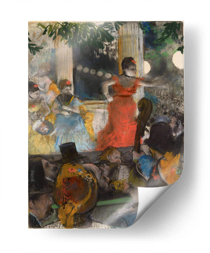Sumérgete en la vibrante atmósfera de "El café-concierto en Les Ambassadeurs", una obra maestra que captura la esencia de la vida nocturna parisina de finales del siglo XIX. Edgar Degas, con su característico estilo impresionista, nos transporta a un momento fugaz lleno de movimiento y color. La composición, rica en detalles, presenta figuras elegantes en un entorno social animado, destacando la gracia de una mujer con un vestido rojo intenso, rodeada por la sutil energía de la audiencia y los músicos. La paleta de colores, que combina tonos cálidos y fríos, crea una sensación de profundidad y dinamismo, mientras que la técnica del pastel aporta una textura única y una luminosidad envolvente. Este cuadro decorativo es ideal para añadir un toque de sofisticación y vitalidad a tu sala de estar, comedor o estudio. Su capacidad para evocar la alegría y la efervescencia de una velada, lo convierte en una pieza inspiradora que dialoga con el espectador, invitándolo a formar parte de la escena.