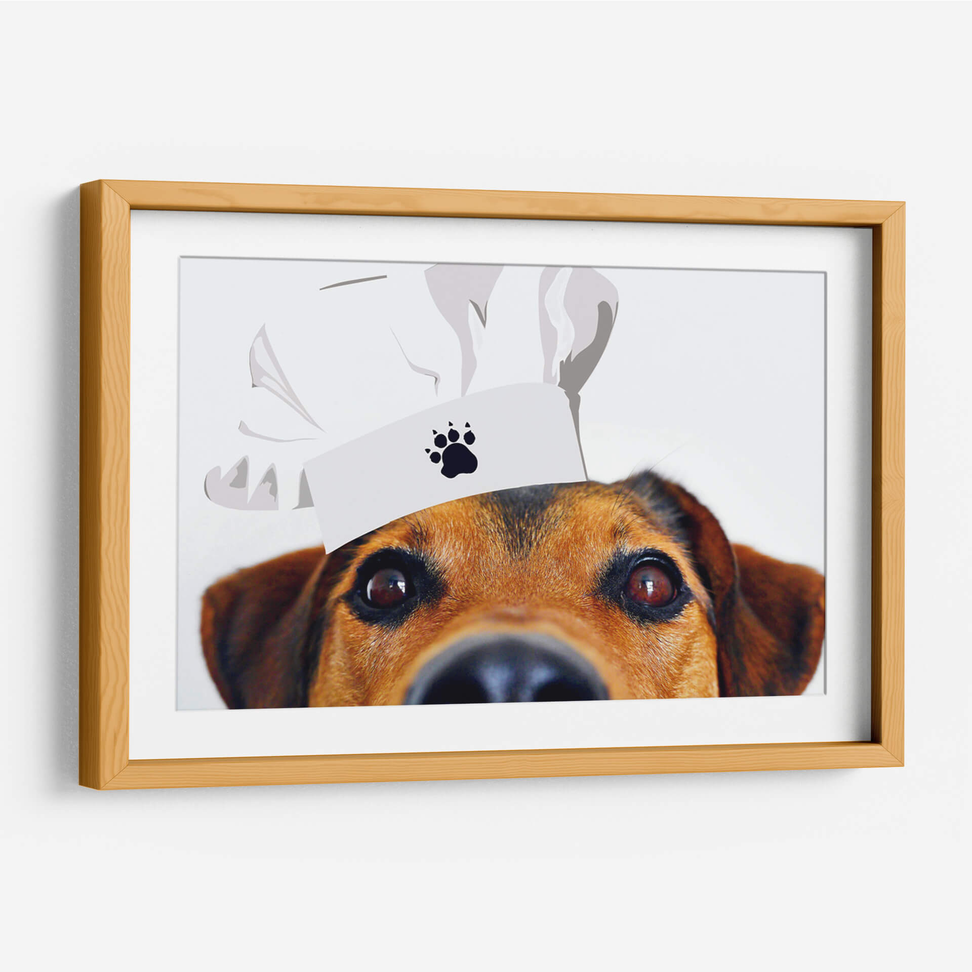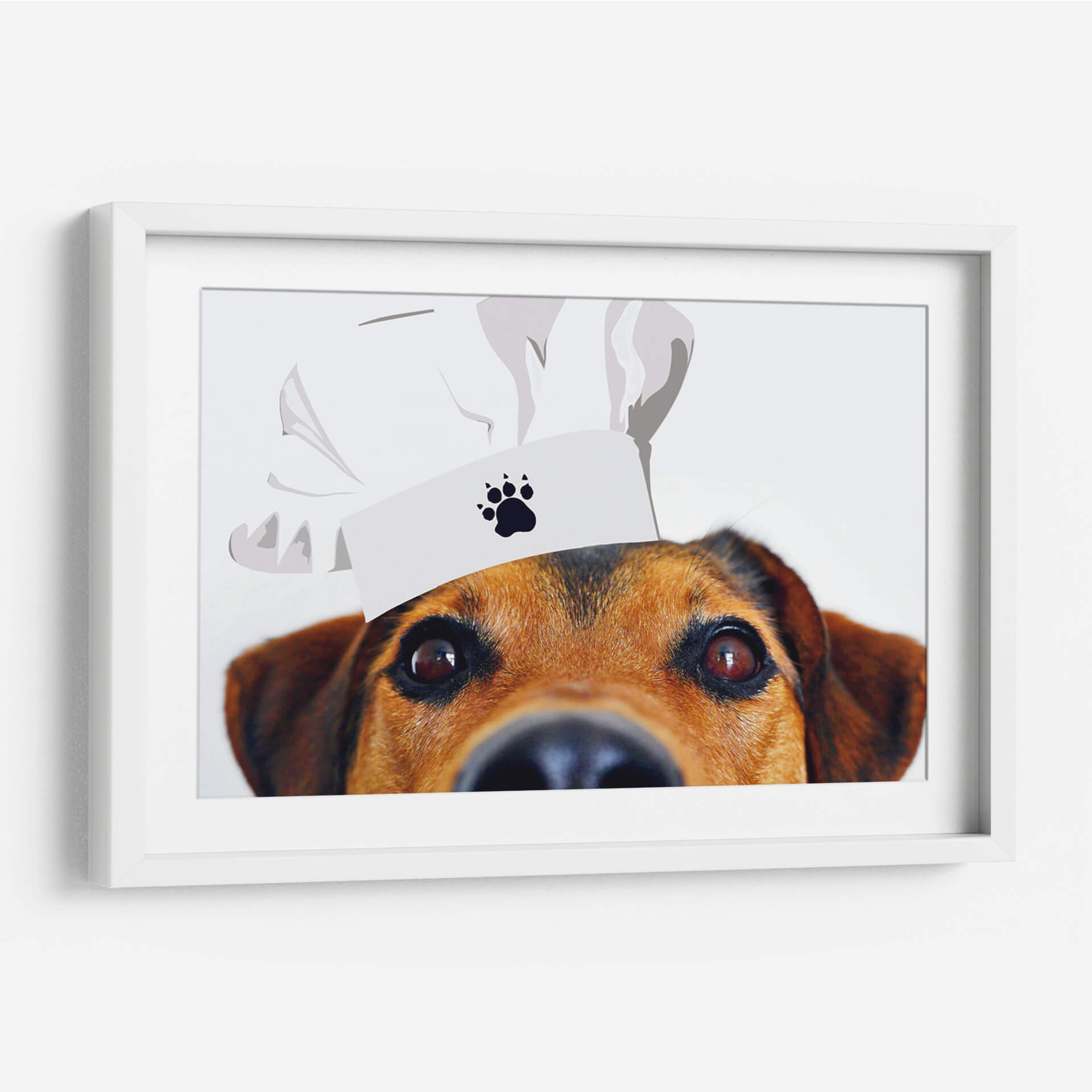 Este cautivador cuadro decorativo, titulado "Perro Chef" por Eduardo Hernández, es una obra de arte que inyectará una dosis de humor y personalidad a cualquier espacio. La imagen presenta un primer plano íntimo de un perro de pelaje marrón y ojos expresivos, luciendo un gorro de chef blanco con una huella de pata impresa. El fondo minimalista y blanco realza la figura del perro, creando un punto focal instantáneo. El estilo, una mezcla de realismo fotográfico en el rostro del animal y una ilustración gráfica en el gorro, le confiere un carácter moderno y juguetón. La paleta de colores se centra en los tonos cálidos del pelaje del perro contrastando con el blanco puro del gorro y el fondo, lo que resulta en una atmósfera acogedora y amigable. Ideal para cocinas, comedores, o cualquier rincón que necesite un toque de alegría y originalidad, este cuadro decorativo es perfecto para amantes de los animales y gourmets. Su diseño único lo convierte en un excelente tema de conversación y una adición encantadora para hogares contemporáneos, oficinas o establecimientos de comida. Añade un toque de humor y estilo a tu decoración con esta pieza distintiva.