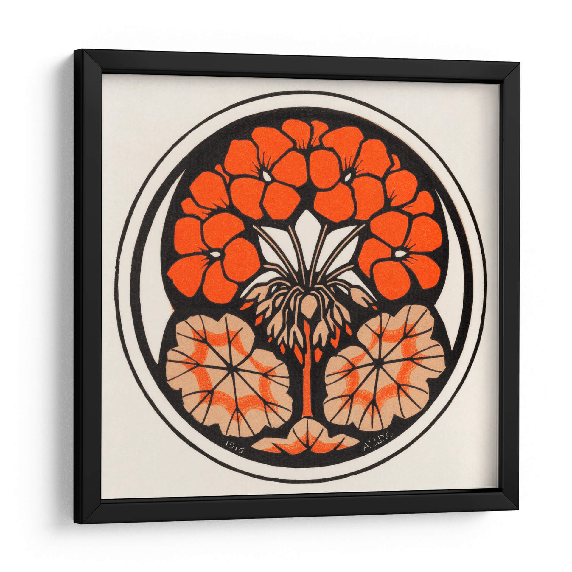Este cautivador cuadro decorativo de Julie de Graag, titulado 'Cereza de las Indias Orientales - II', es una obra maestra de estilo Art Nouveau que evoca la belleza botánica con un toque moderno. La composición circular presenta vibrantes flores de color naranja intenso, dispuestas con simetría y elegancia, rodeadas por hojas estilizadas en tonos tierra y ocre. El contraste entre las formas orgánicas y las líneas limpias, junto con el uso audaz del negro y los naranjas, crea un impacto visual dinámico y sofisticado. La paleta de colores, aunque limitada, es rica y expresiva, aportando calidez y un aire de vitalidad a cualquier espacio. El diseño, con sus influencias de la naturaleza y su ejecución gráfica, lo convierte en una pieza ideal para añadir un punto focal de interés a salones, comedores o estudios. Su estilo atemporal y su atmósfera enérgica pero equilibrada invitan a la contemplación y a la apreciación del arte decorativo, transformando cualquier pared en una declaración de estilo y buen gusto. Es una pieza que combina la delicadeza de la ilustración botánica con la fuerza del diseño gráfico, perfecta para quienes buscan arte contemporáneo con carácter.