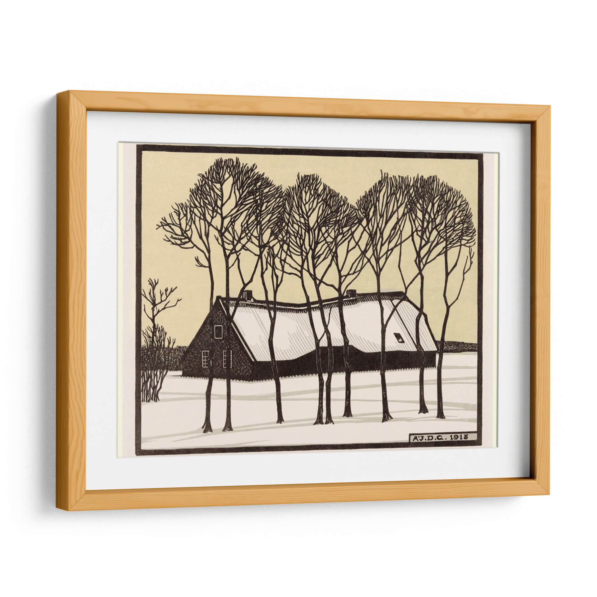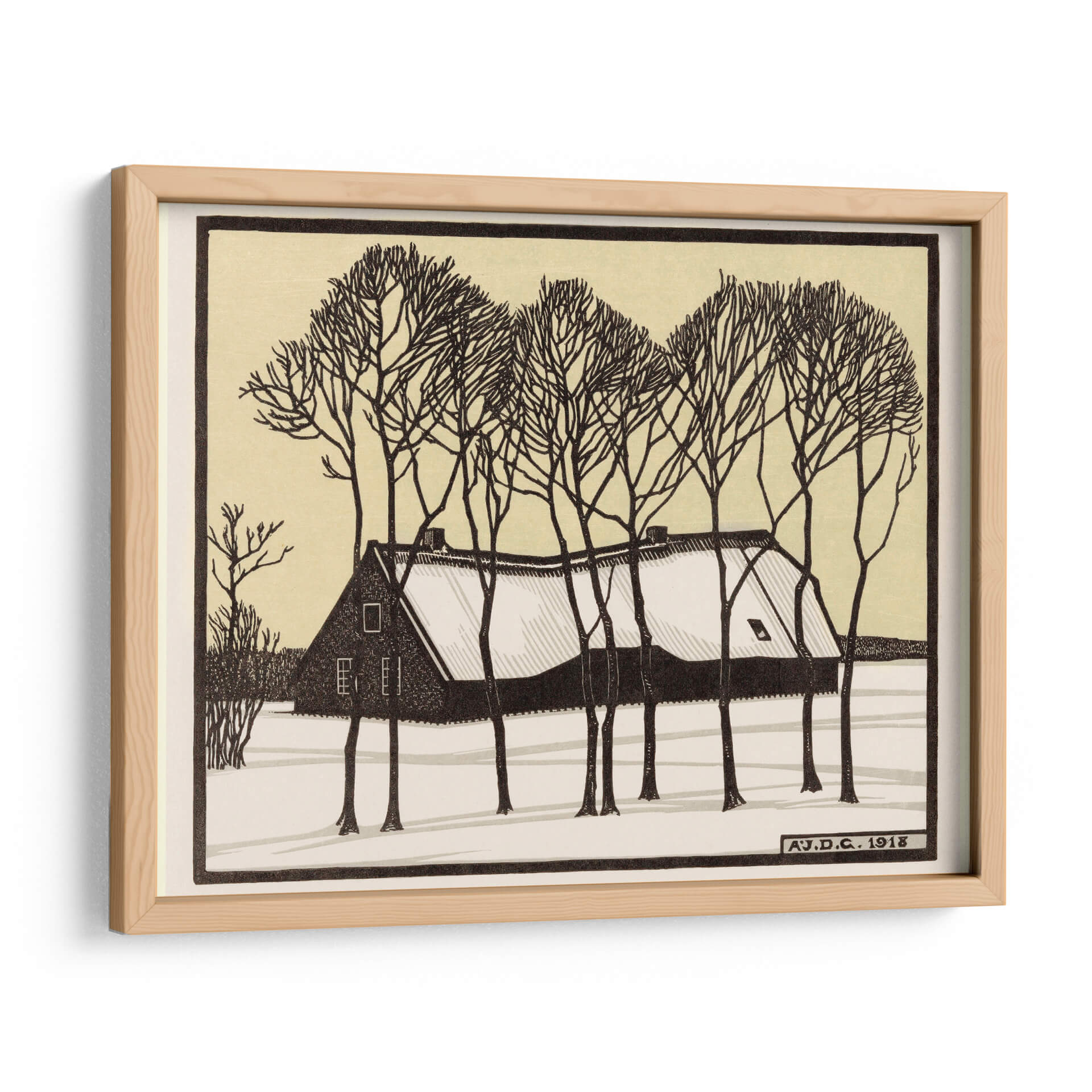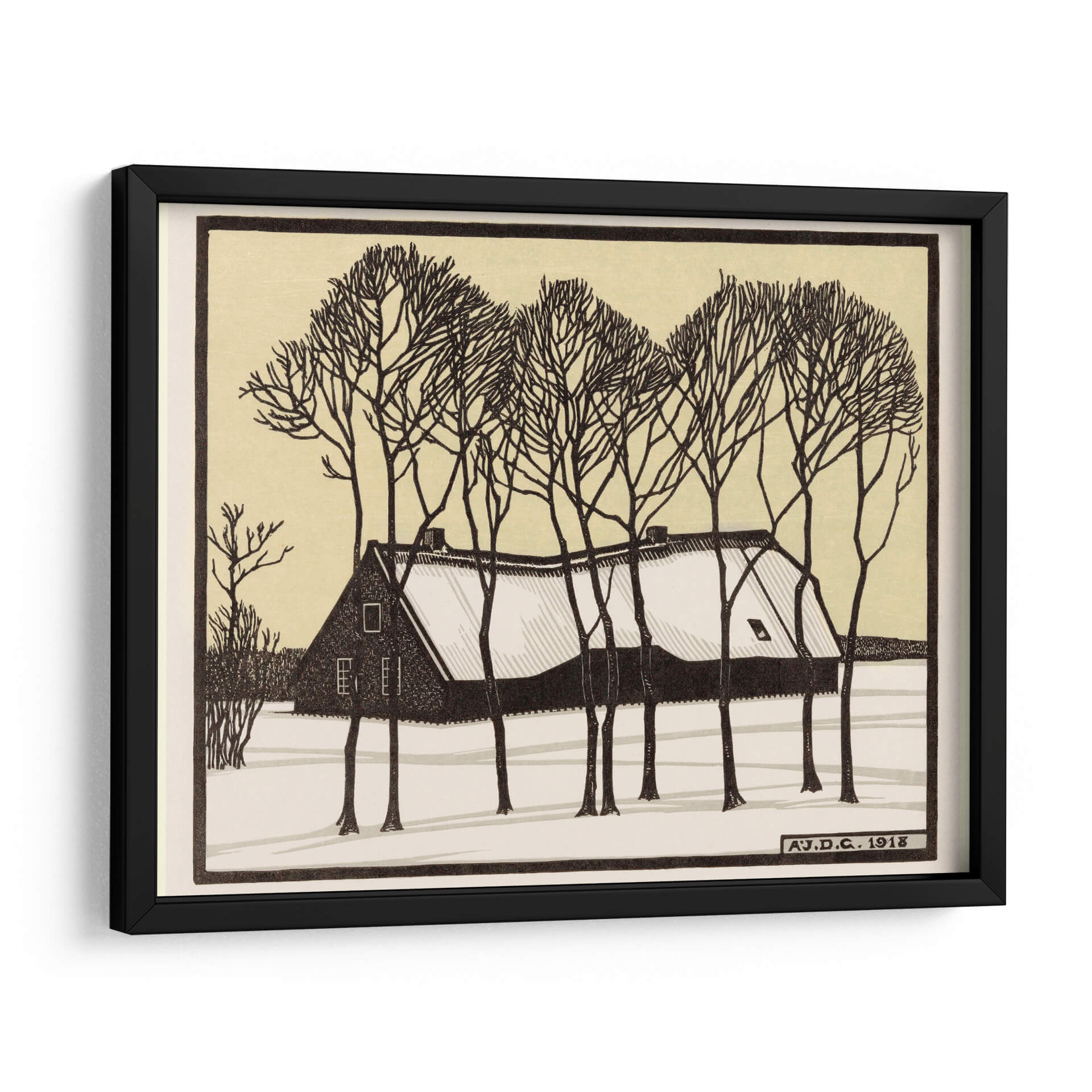 Sumérgete en la serena belleza de "Granja en la nieve", una obra de arte evocadora de Julie de Graag. Esta pieza captura la quietud y el encanto de un paisaje invernal, con una casa acogedora cubierta de nieve y rodeada de árboles desnudos cuyas ramas trazan delicados patrones contra un cielo pálido. La paleta de colores, dominada por tonos tierra, ocres y contrastes nítidos en blanco y negro, crea una atmósfera de calma y nostalgia. El estilo gráfico y las líneas definidas aportan una cualidad atemporal a la escena, invitando a la contemplación. Ideal para añadir un toque de tranquilidad y sofisticación a tu hogar u oficina, este cuadro decorativo es perfecto para espacios que buscan transmitir paz y un sentido de conexión con la naturaleza. Su composición equilibrada y su tema invernal lo convierten en una adición encantadora a cualquier colección de arte, añadiendo calidez y carácter a tu decoración.