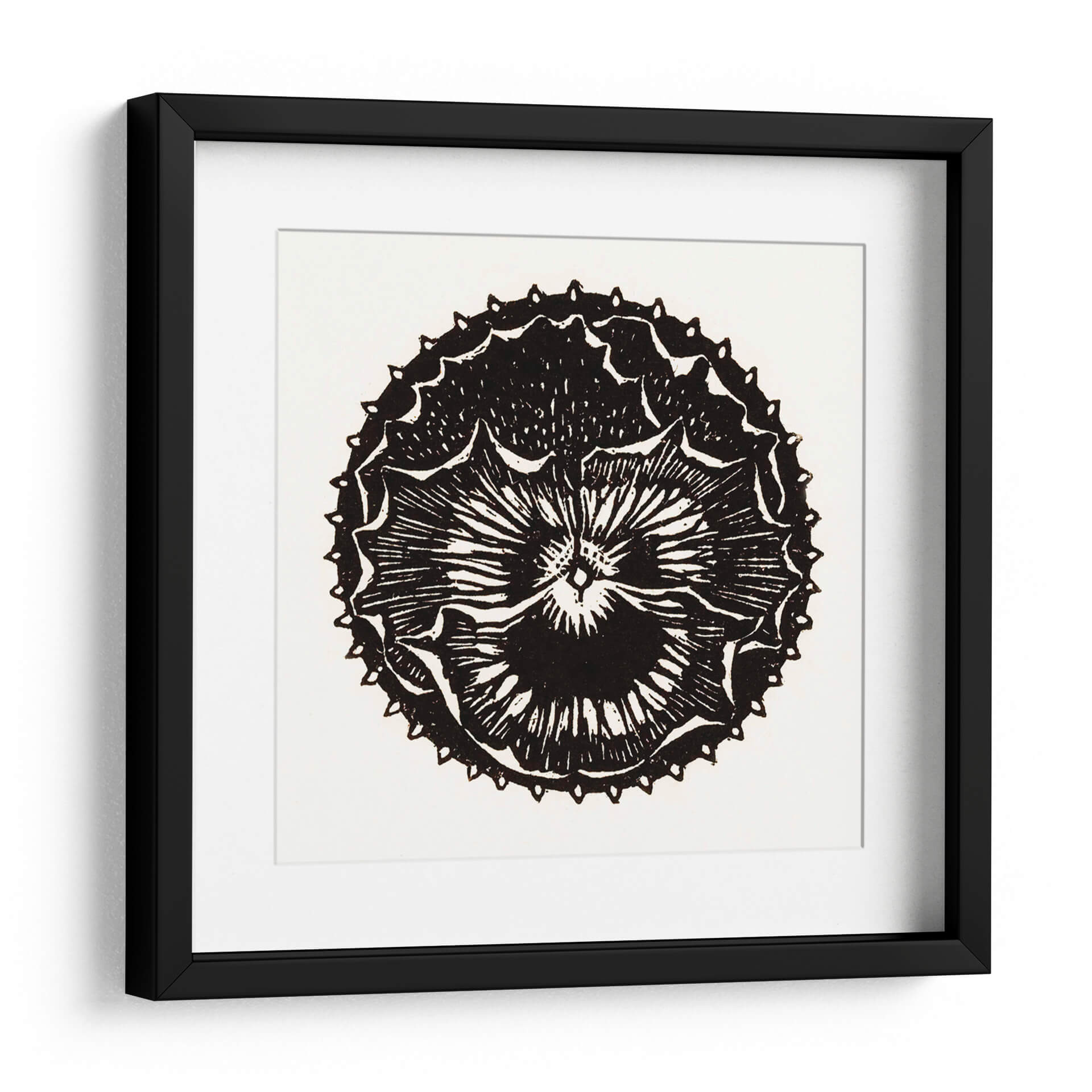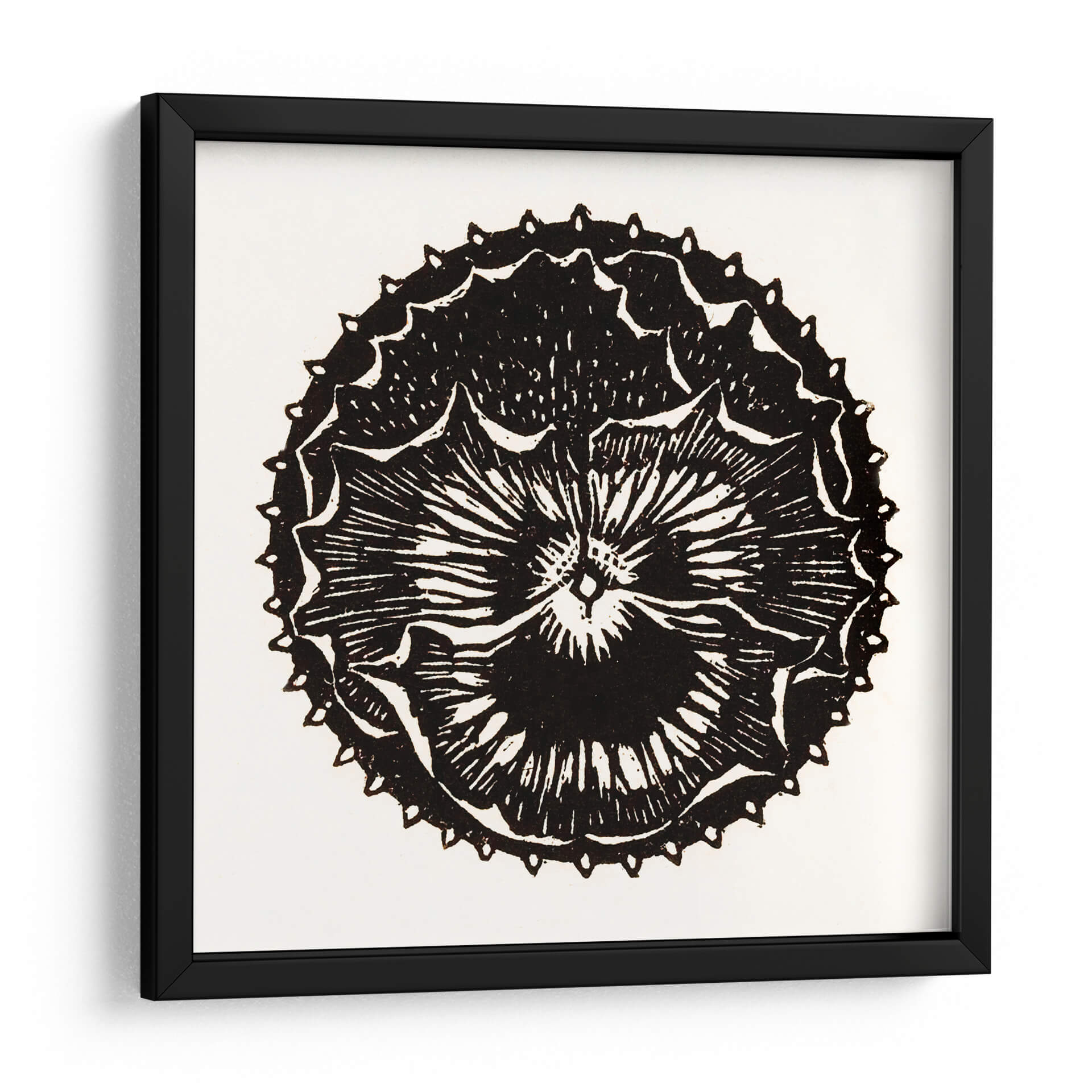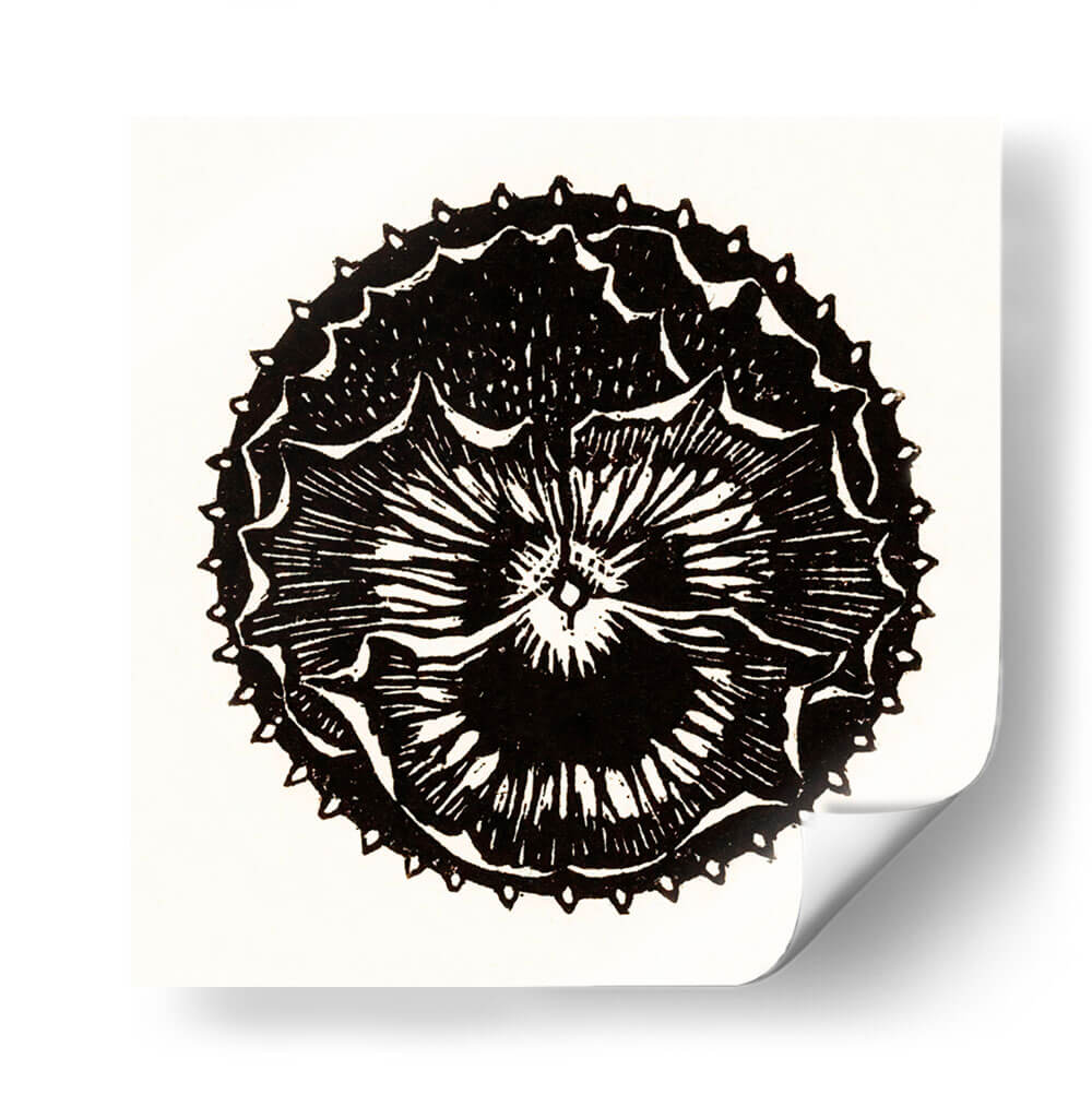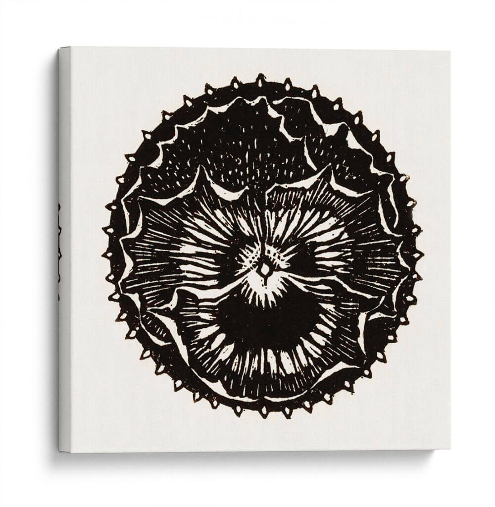 Descubre la cautivadora obra de arte "Insignia de flor" de Julie de Graag, una pieza que fusiona la delicadeza botánica con un diseño gráfico audaz. Este cuadro decorativo en blanco y negro presenta una representación estilizada de una flor, evocando la estética de un grabado o xilografía. Las líneas nítidas y el contraste dramático entre el negro intenso y el fondo neutro crean una imagen impactante y atemporal. La intrincada simetría de los pétalos y los detalles de las puntas alrededor del borde exterior aportan una sensación de orden y complejidad, invitando a la contemplación. "Insignia de flor" es ideal para añadir un toque de elegancia minimalista y un punto de interés visual a cualquier espacio. Su diseño versátil lo convierte en una adición perfecta para salas de estar modernas, dormitorios serenos, estudios creativos u oficinas, aportando un aire de sofisticación artística y un guiño a la naturaleza reimaginada. Esta pieza es una excelente opción para quienes buscan arte decorativo que sea a la vez sutil y memorable, capaz de complementar una amplia gama de estilos de decoración, desde lo contemporáneo hasta lo más tradicional.