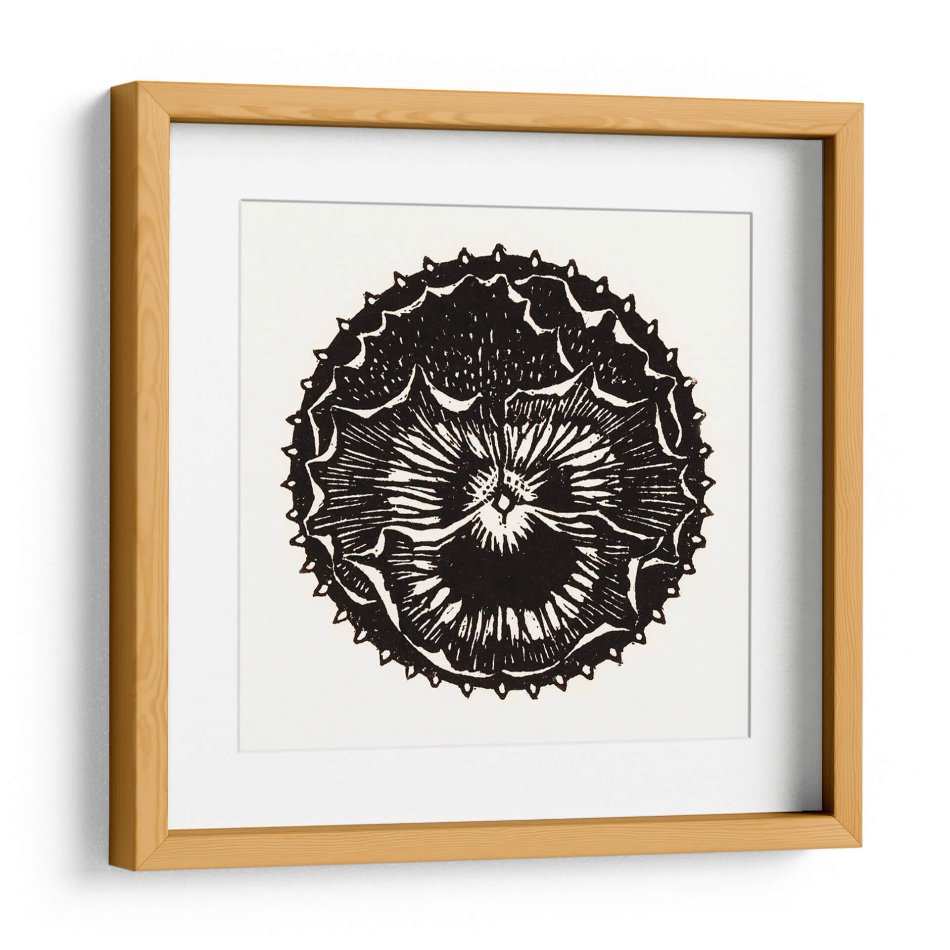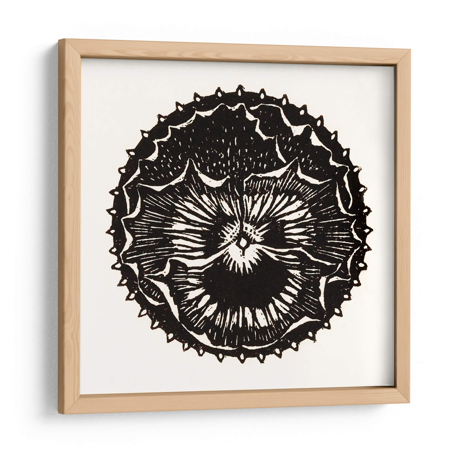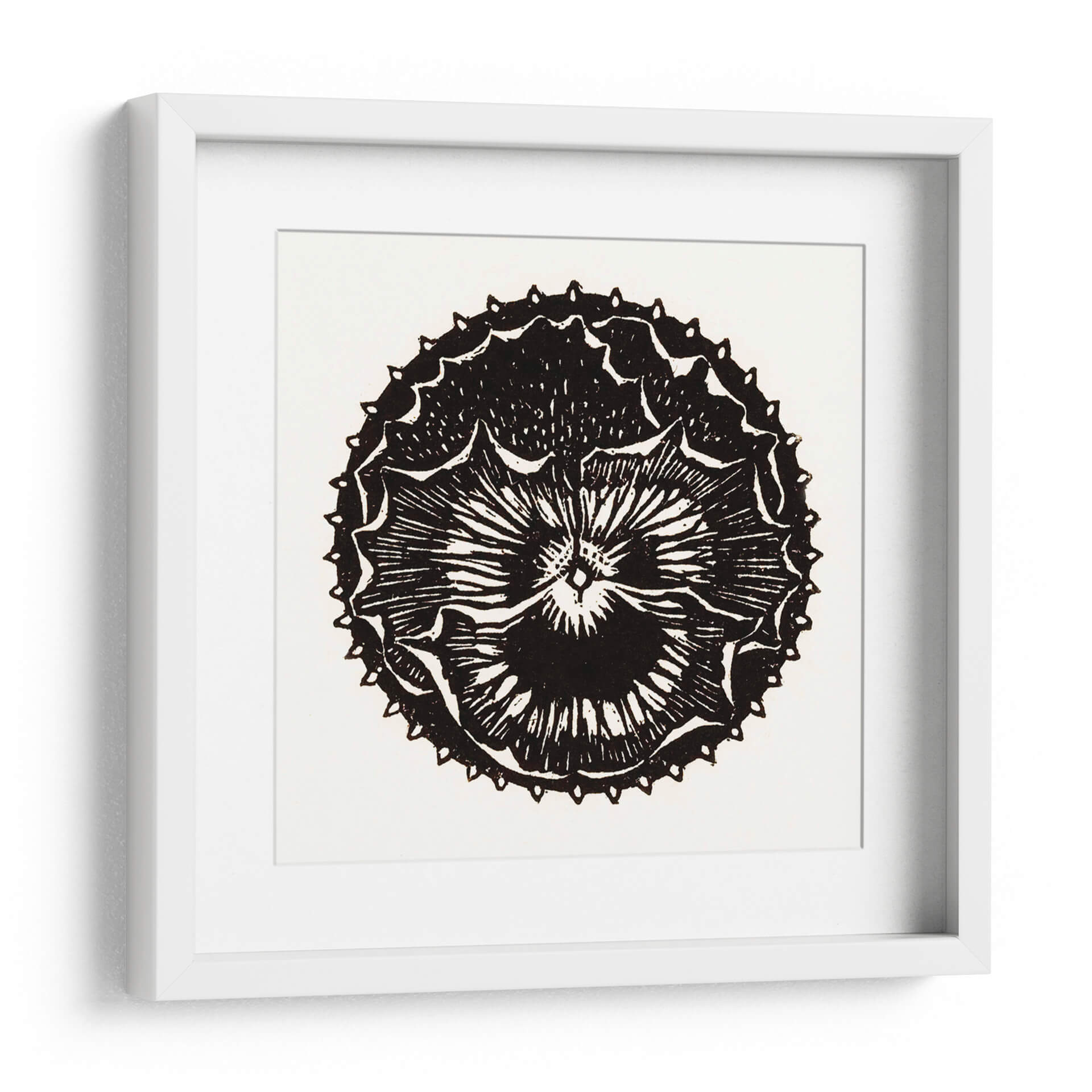 Descubre la cautivadora obra de arte "Insignia de flor" de Julie de Graag, una pieza que fusiona la delicadeza botánica con un diseño gráfico audaz. Este cuadro decorativo en blanco y negro presenta una representación estilizada de una flor, evocando la estética de un grabado o xilografía. Las líneas nítidas y el contraste dramático entre el negro intenso y el fondo neutro crean una imagen impactante y atemporal. La intrincada simetría de los pétalos y los detalles de las puntas alrededor del borde exterior aportan una sensación de orden y complejidad, invitando a la contemplación. "Insignia de flor" es ideal para añadir un toque de elegancia minimalista y un punto de interés visual a cualquier espacio. Su diseño versátil lo convierte en una adición perfecta para salas de estar modernas, dormitorios serenos, estudios creativos u oficinas, aportando un aire de sofisticación artística y un guiño a la naturaleza reimaginada. Esta pieza es una excelente opción para quienes buscan arte decorativo que sea a la vez sutil y memorable, capaz de complementar una amplia gama de estilos de decoración, desde lo contemporáneo hasta lo más tradicional.