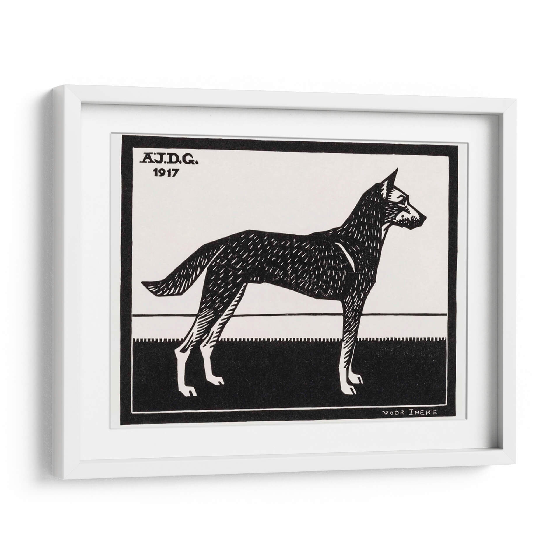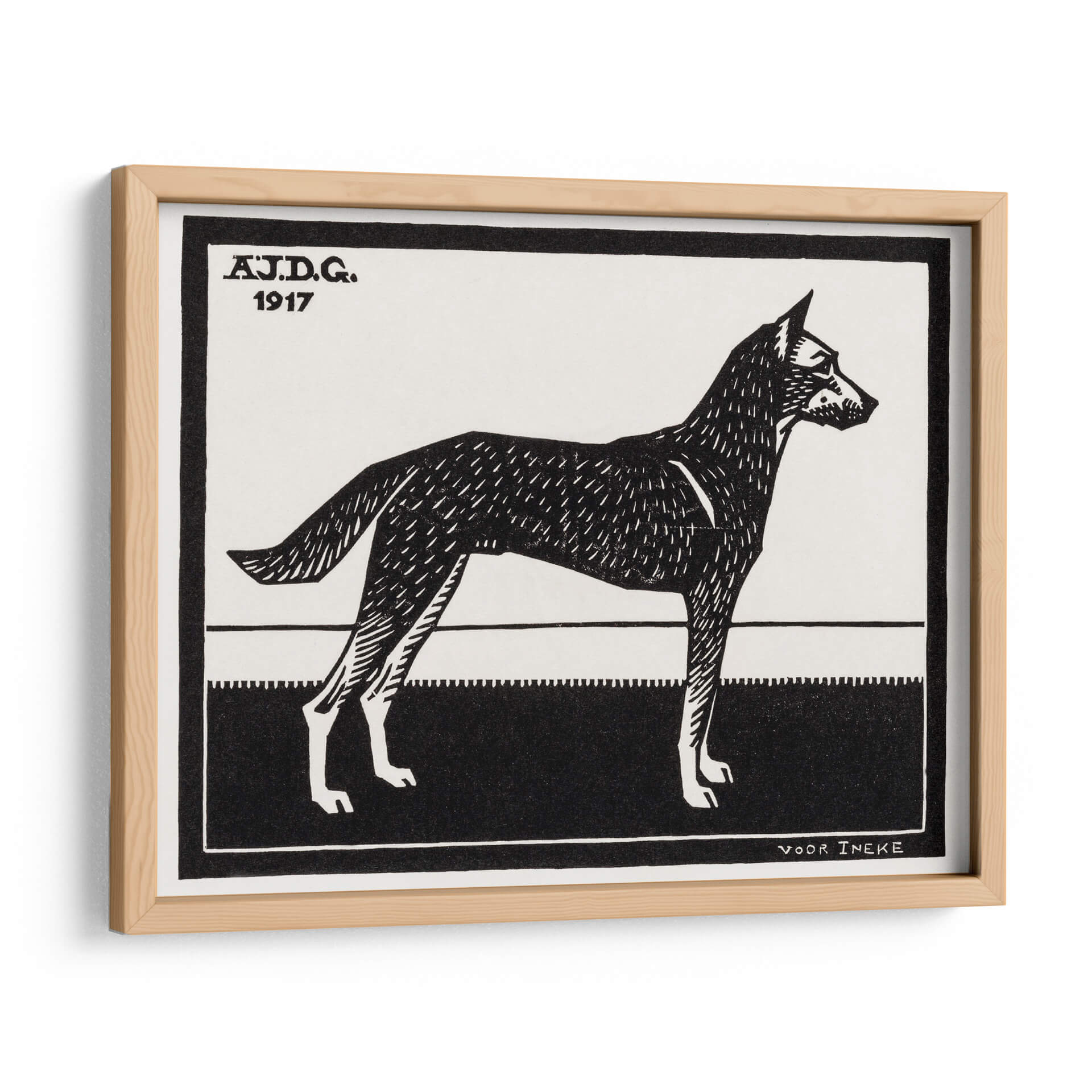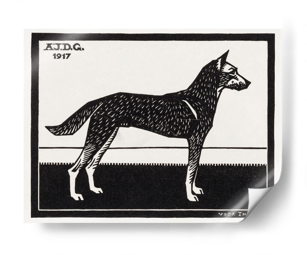 Este cuadro decorativo, titulado 'Perro' y creado por la talentosa artista Julie de Graag en 1917, es una obra maestra del arte gráfico que evoca una elegancia atemporal. La pieza presenta la figura estilizada de un perro en una pose alerta, capturada con líneas audaces y un contraste impactante entre blanco y negro. La técnica utilizada, reminiscente del grabado o la xilografía, dota a la imagen de una textura rica y una profundidad visual que atrae la mirada. El artista ha empleado un enfoque minimalista pero expresivo, destacando la silueta del animal contra un fondo limpio y delimitado por un borde grueso, lo que realza su presencia. La obra transmite una sensación de dignidad y calma, con un toque de misterio inherente a su estilo lineal. Este cuadro decorativo es ideal para añadir un toque de sofisticación clásica y un punto de interés visual a cualquier espacio, ya sea una sala de estar moderna, un estudio profesional o un dormitorio tranquilo. Su diseño monocromático y su composición equilibrada lo convierten en una adición versátil y elegante a cualquier decoración, permitiendo que su fuerza expresiva hable por sí misma y aporte carácter a tus paredes.