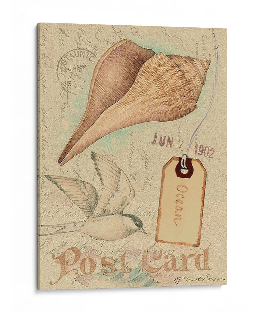 Evoca la nostalgia y la belleza del mar con "Cáscaras De Postal IV", una obra de arte decorativo que transporta a playas lejanas y recuerdos de verano. Esta pieza captura la esencia de un día junto al océano a través de una delicada ilustración de conchas marinas y un ave en pleno vuelo, todo sobre un fondo que imita el encanto de una postal antigua. La paleta de colores cálidos y terrosos, salpicada de sutiles toques de azul aguamarina, crea una atmósfera serena y evocadora, perfecta para añadir un aire de tranquilidad y elegancia a cualquier espacio. El estilo, que fusiona lo vintage con un toque de arte contemporáneo, lo convierte en un punto focal ideal para salones, dormitorios o incluso estudios de diseño que buscan inspiración costera. Cada detalle, desde la textura de las conchas hasta la caligrafía que sugiere mensajes perdidos en el tiempo, invita a la contemplación y al ensueño. Ideal para amantes de la naturaleza, el mar y el arte con historia.