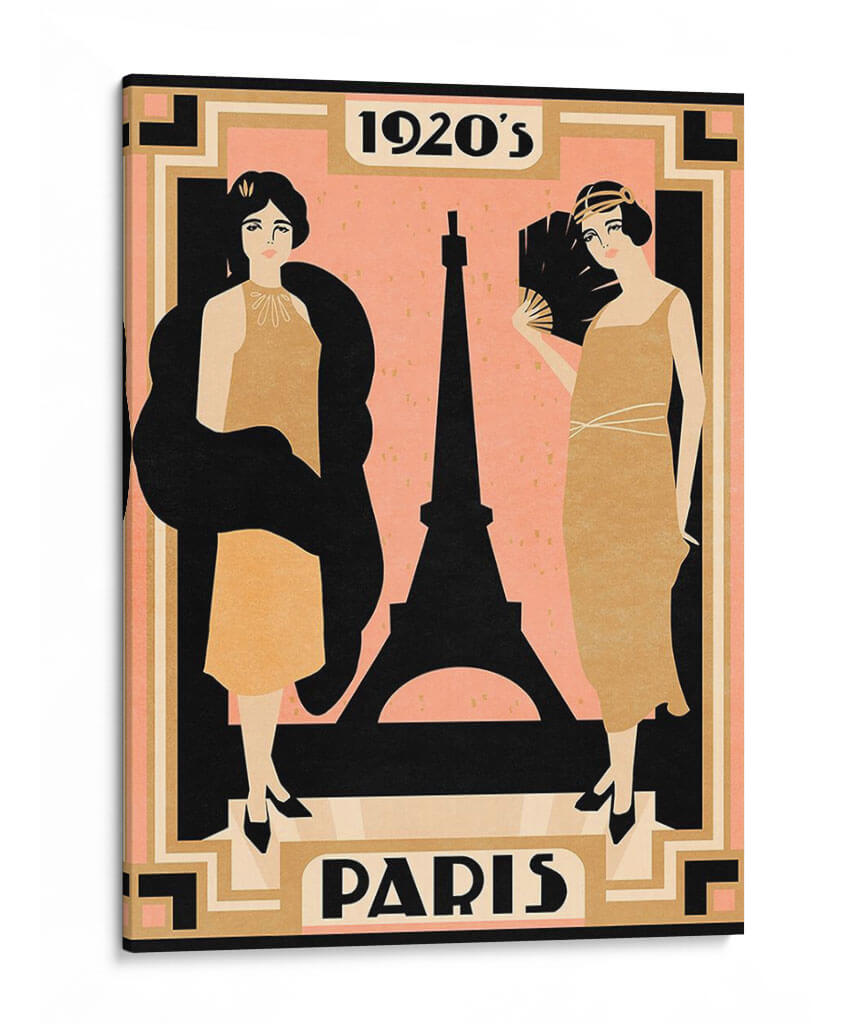 Sumérgete en la elegancia y el glamour de la Belle Époque con este evocador cuadro decorativo "1920s Paris I" de Jacob Green. La obra captura la esencia de una era dorada con una paleta de colores sofisticada que combina tonos melocotón suaves, negros profundos y detalles en dorado y beige, creando una atmósfera nostálgica y chic. Se presentan dos figuras femeninas estilizadas, vestidas con la moda característica de los años 20, con siluetas elegantes y accesorios como un abanico, evocando el espíritu de la capital francesa en su apogeo. La icónica Torre Eiffel se erige como telón de fondo, un símbolo perdurable de París, añadiendo un toque de monumentalidad a la composición. El estilo gráfico y lineal, reminiscentes de los carteles art déco, confiere a la pieza una estética moderna y atemporal. Este cuadro decorativo es perfecto para quienes buscan añadir un toque de sofisticación vintage y un aire de romance parisino a su hogar u oficina. Ideal para salones, recibidores o estudios que deseen un punto focal con carácter y una narrativa visual cautivadora. Transforma tu espacio con esta pieza que celebra la moda, la cultura y el encanto de una década inolvidable, aportando una dosis de estilo y clase que nunca pasa de moda.