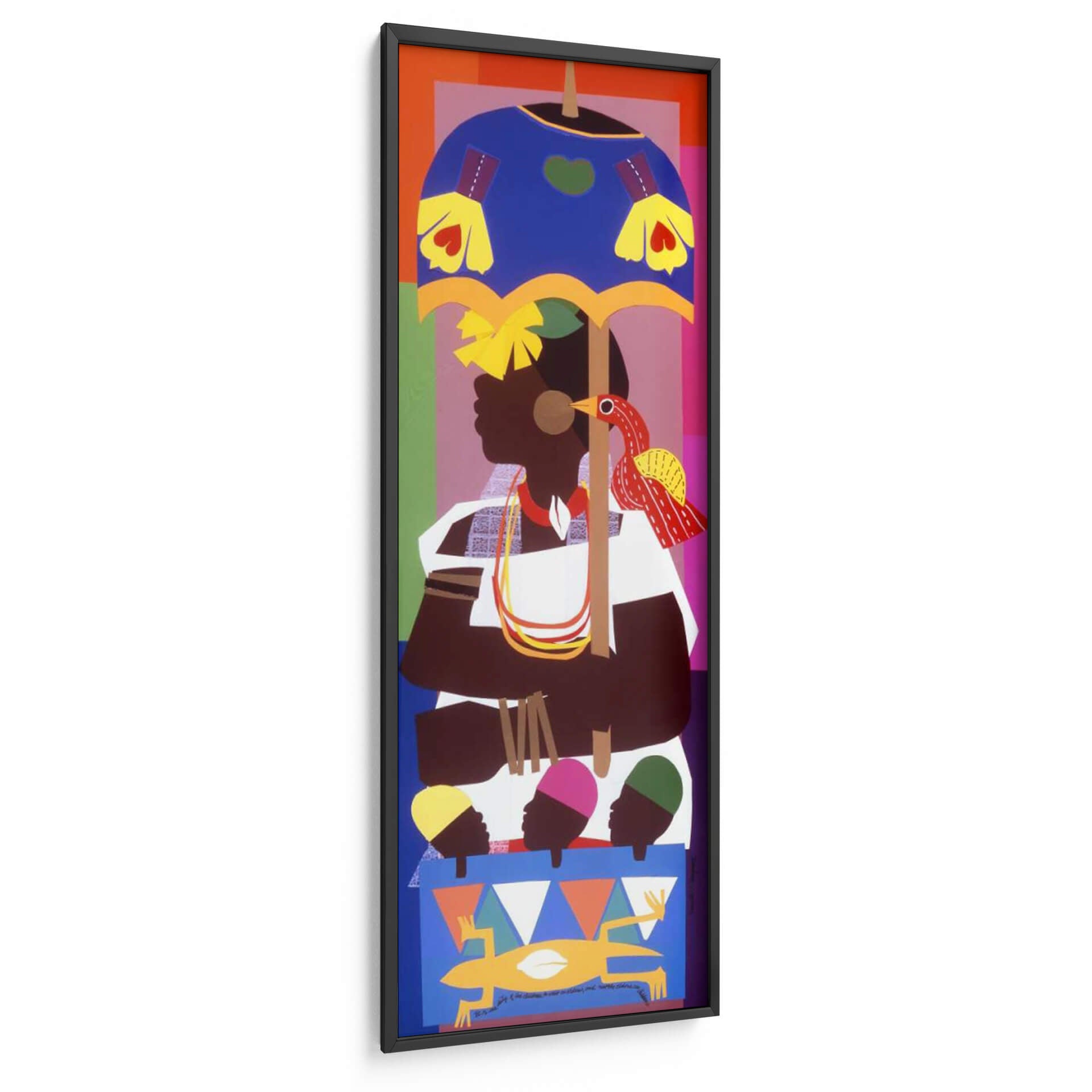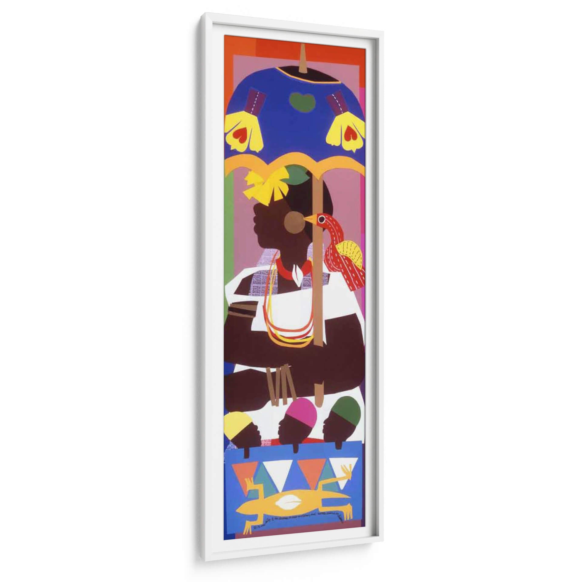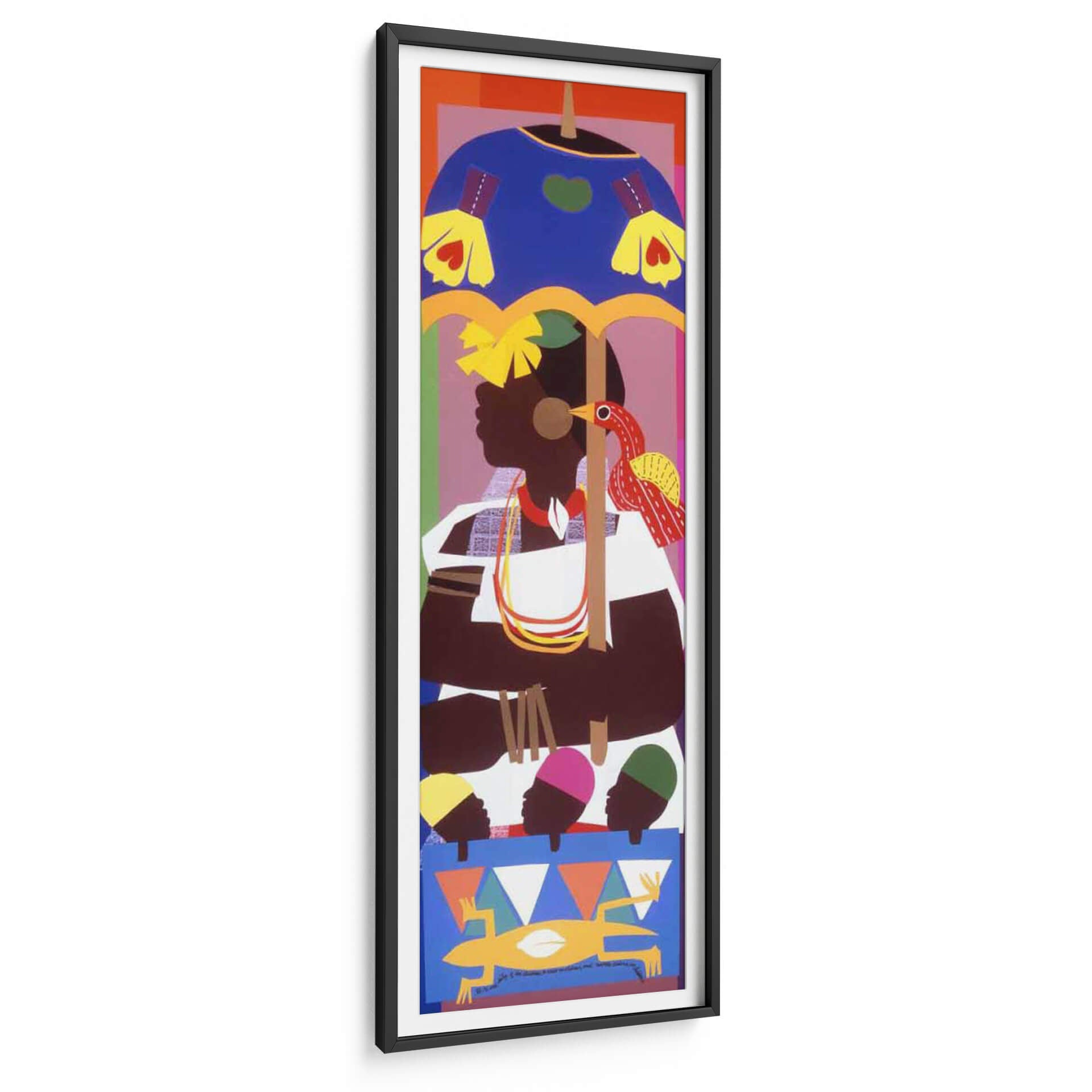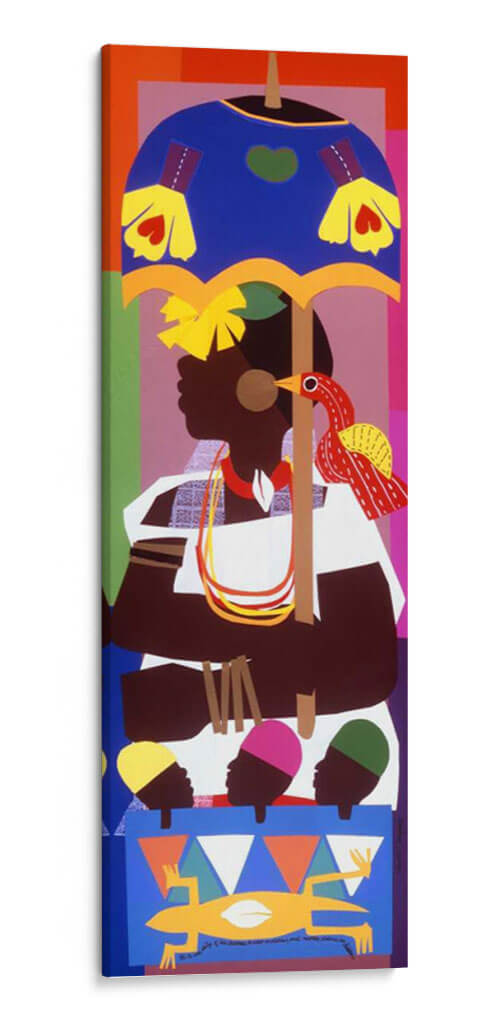 Sumérgete en la vibrante y cautivadora obra de arte "Ashanti" de Varnette Honeywood. Este cuadro decorativo es una explosión de color y cultura, presentando una figura central con un gran paraguas azul adornado con motivos florales amarillos y verdes. La paleta de colores es audaz y saturada, dominada por azules intensos, amarillos brillantes, naranjas cálidos y rosas vibrantes, creando una atmósfera llena de energía y alegría. El estilo distintivo de Honeywood, caracterizado por sus formas simplificadas y figuras audaces, da vida a esta escena con una narrativa visual cautivadora. Se aprecian detalles como collares llamativos, un ave roja estilizada y rostros en silueta que añaden profundidad y significado a la composición. "Ashanti" es más que una simple decoración; es una pieza que celebra la herencia y la identidad, capaz de transformar cualquier espacio en un lugar lleno de carácter y conversación. Ideal para salas de estar, comedores o estudios que buscan un toque de arte contemporáneo con un trasfondo cultural rico, este cuadro decorativo se convertirá en un punto focal que inspira y eleva el espíritu.