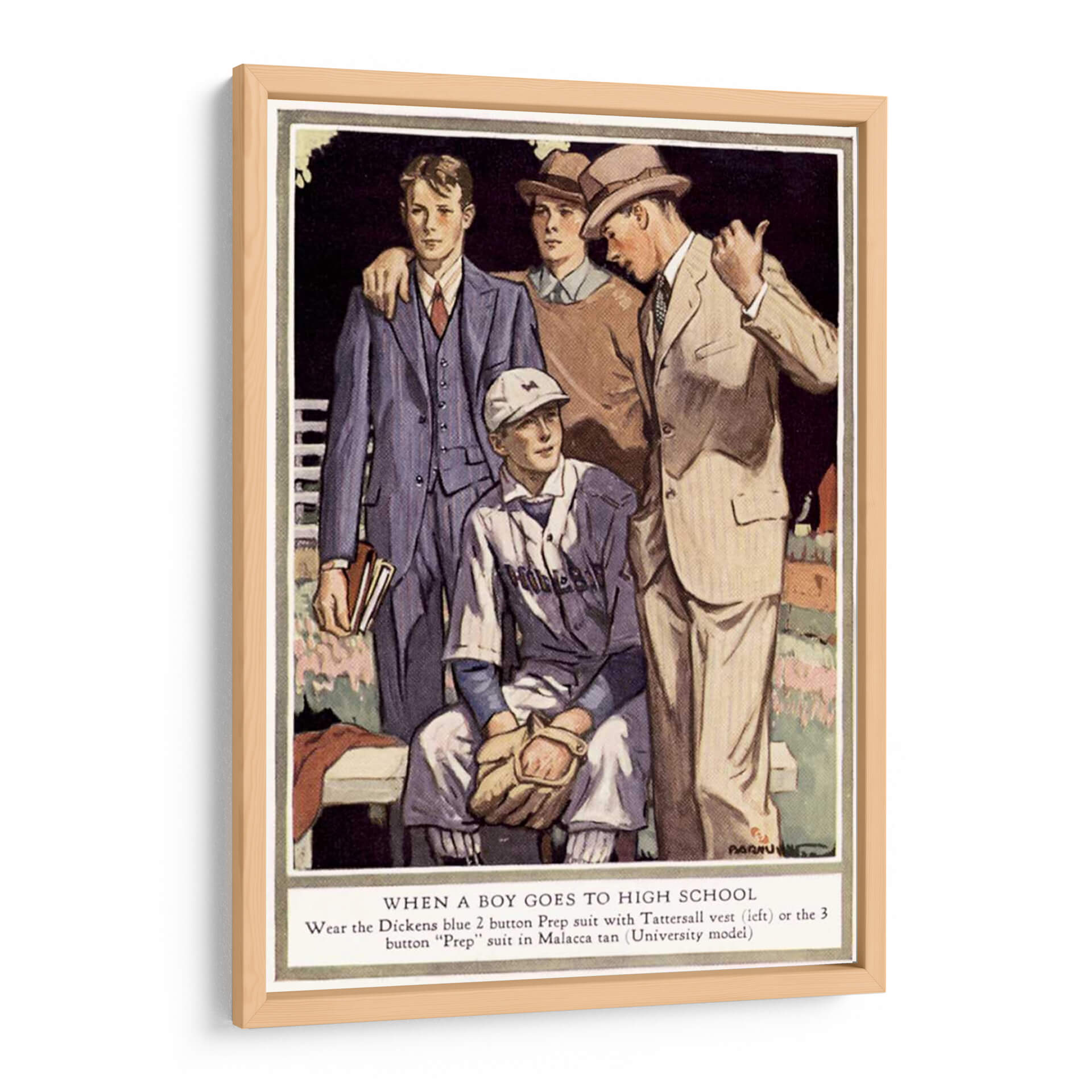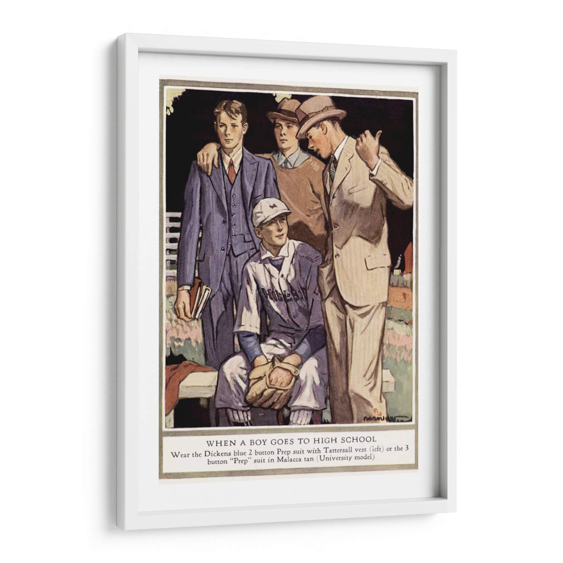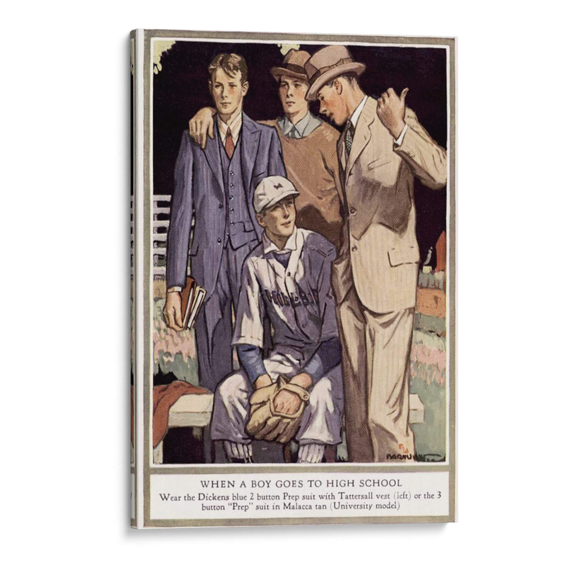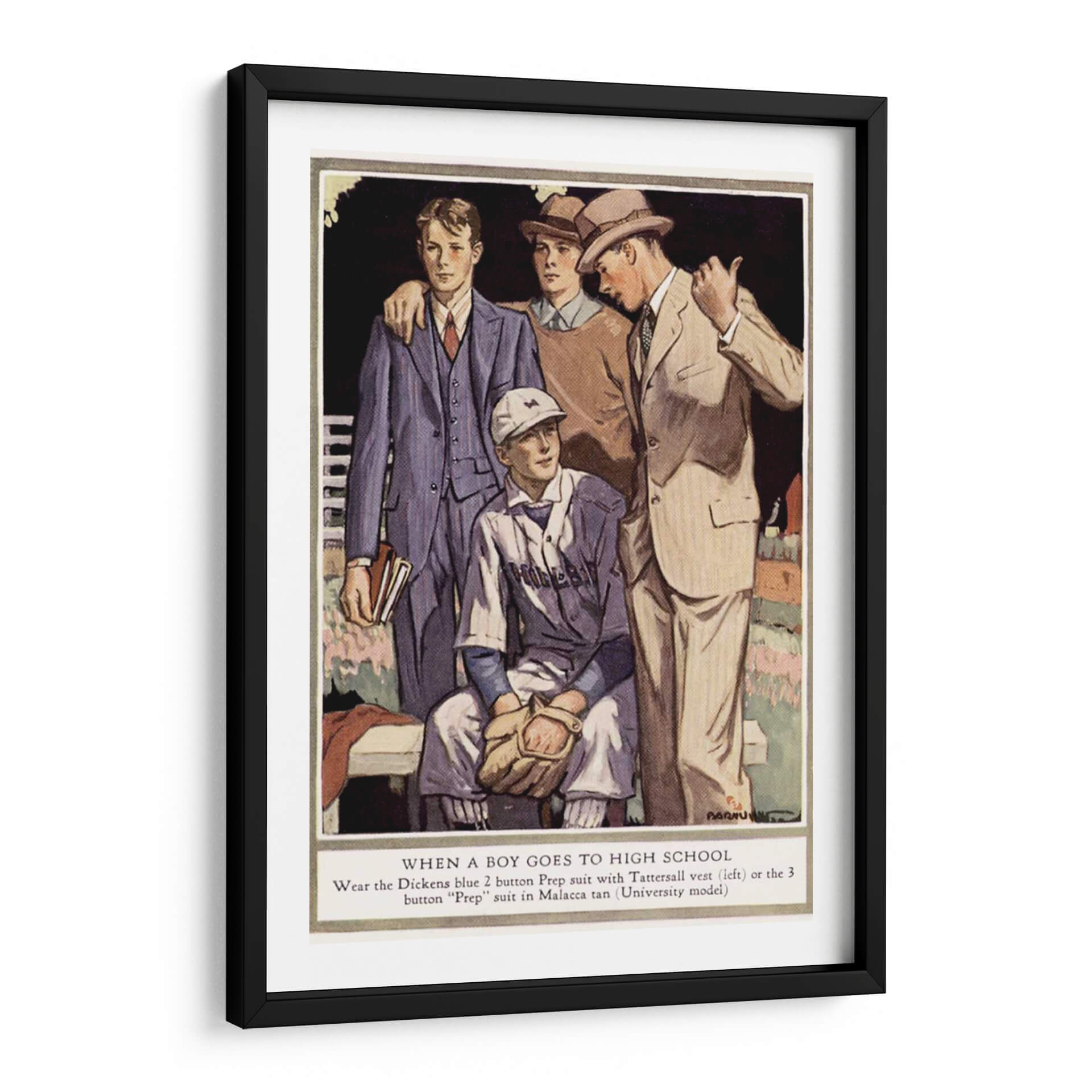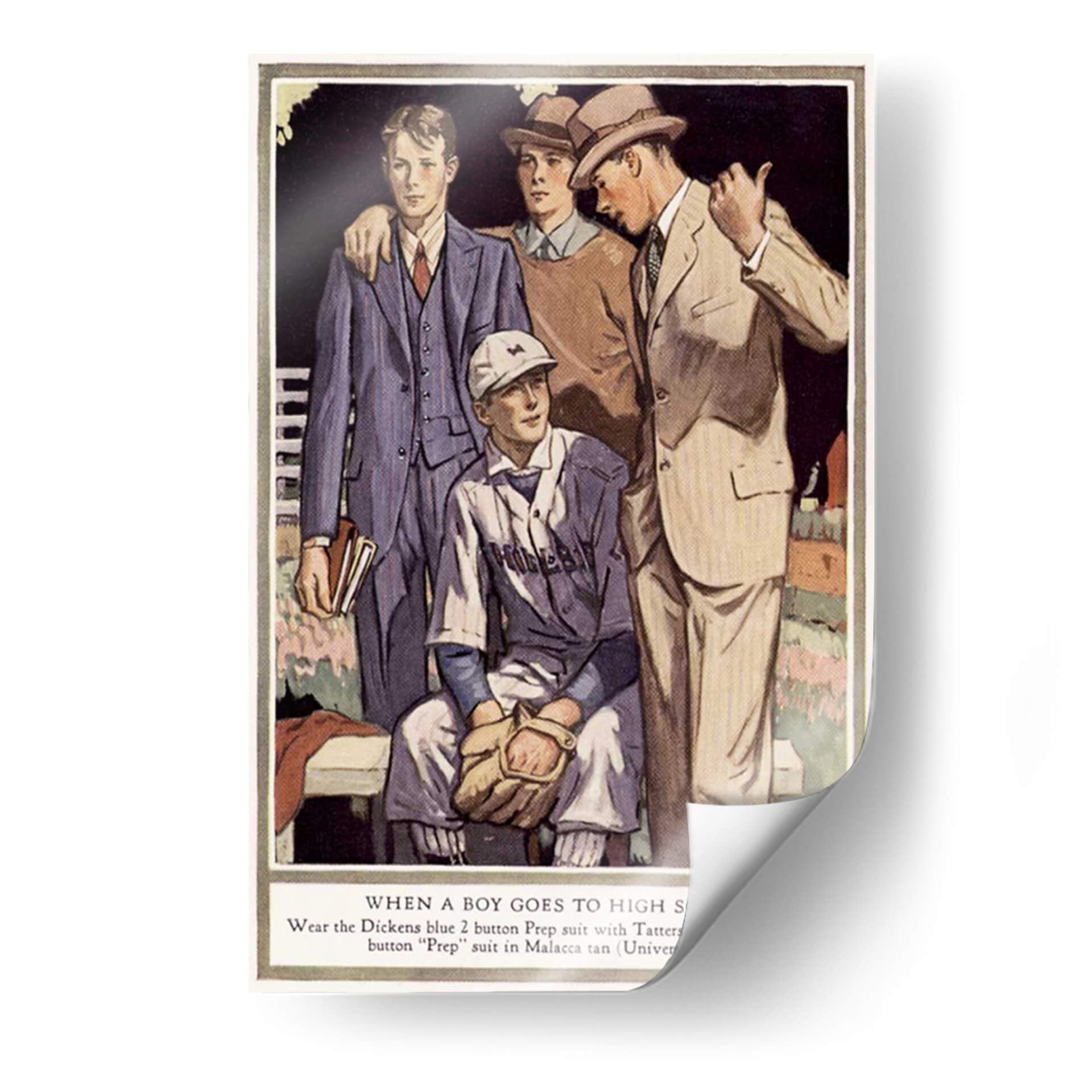 Revive la nostalgia de la moda masculina de antaño con este cautivador cuadro decorativo, "Baskins Fashions V". La obra de arte, que representa a un grupo de jóvenes hombres en un entorno que evoca los años dorados de la escuela secundaria, es una ventana a una época de estilo y camaradería. La paleta de colores, dominada por tonos tierra, azules serenos y toques de beige, crea una atmósfera cálida y reflexiva. La composición se centra en las figuras masculinas, vestidas con trajes clásicos y sombreros, capturando un momento de transición y madurez. Este cuadro es perfecto para añadir un aire de sofisticación retro y un toque de cuento a tu hogar u oficina, evocando recuerdos de tiempos pasados y el encanto del estilo académico. Ideal para salones, estudios o espacios que busquen una conexión con la historia y la elegancia atemporal.