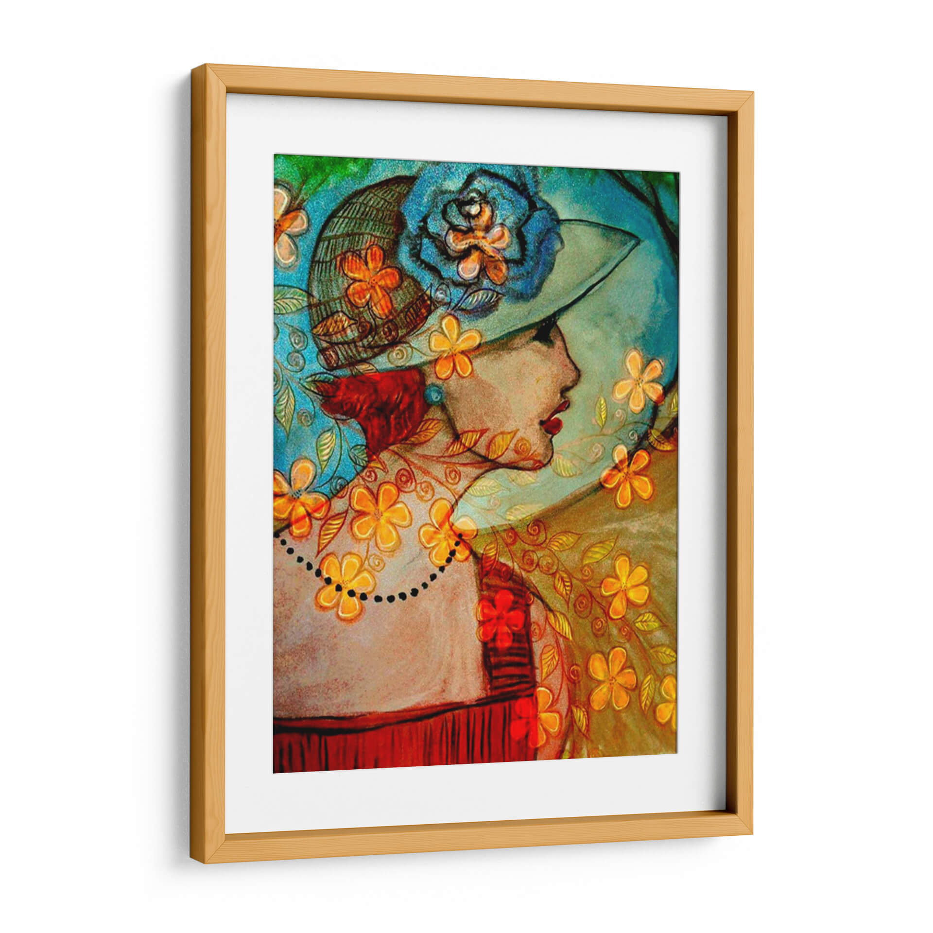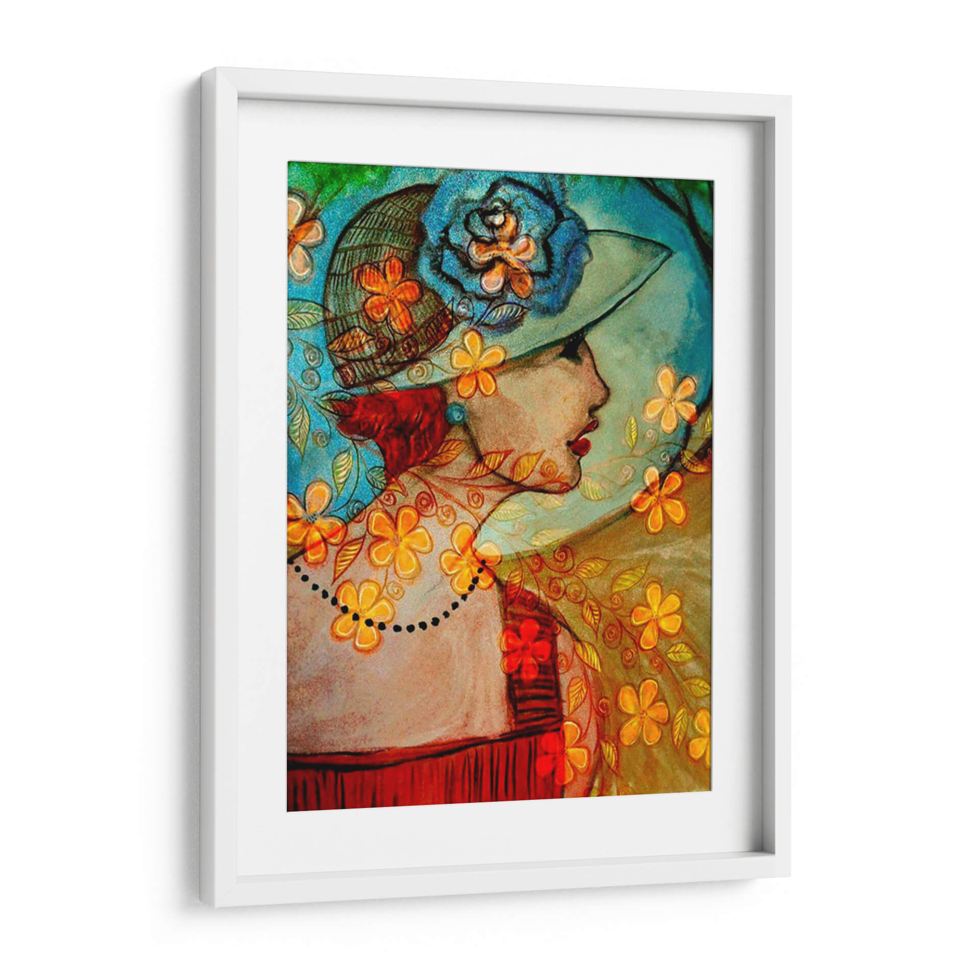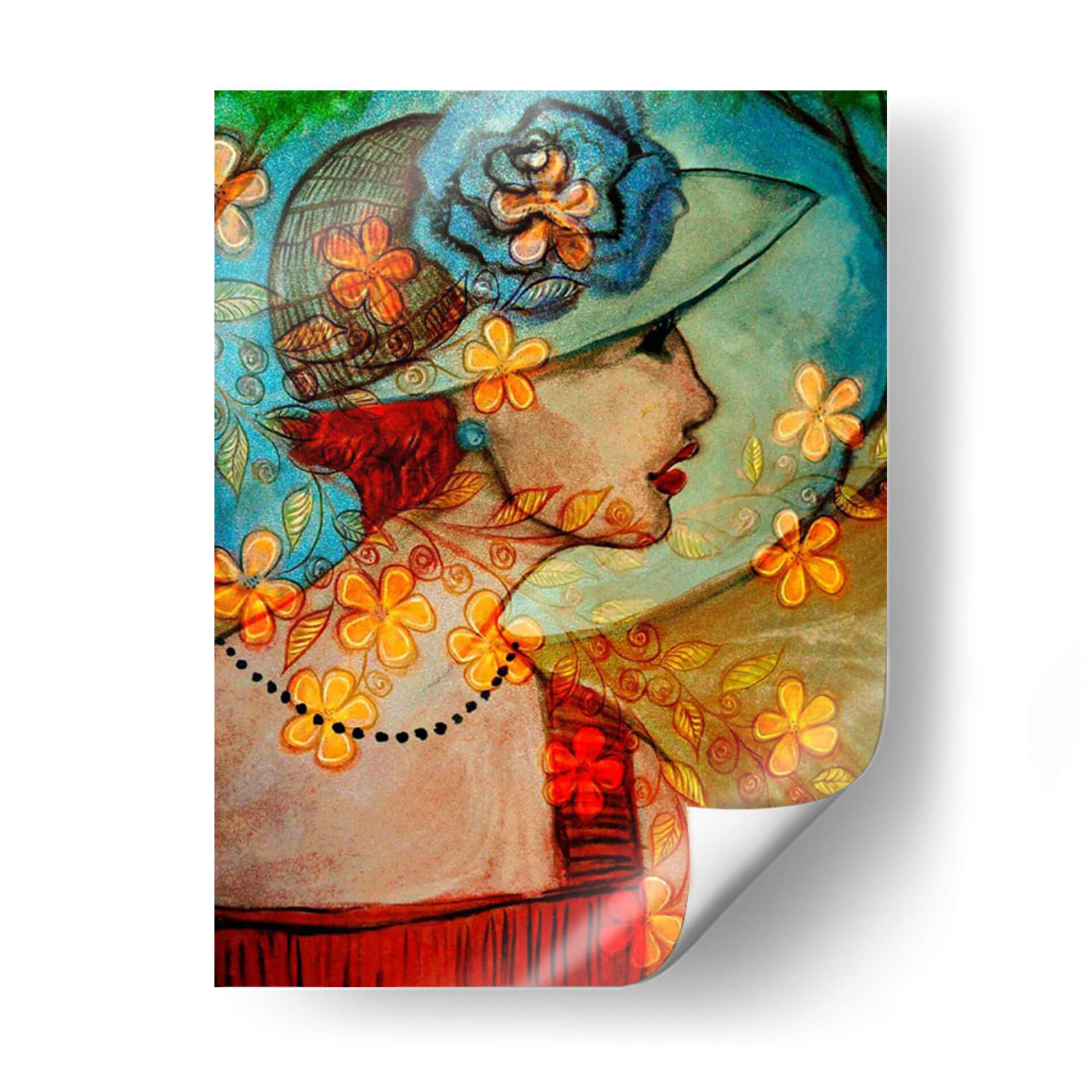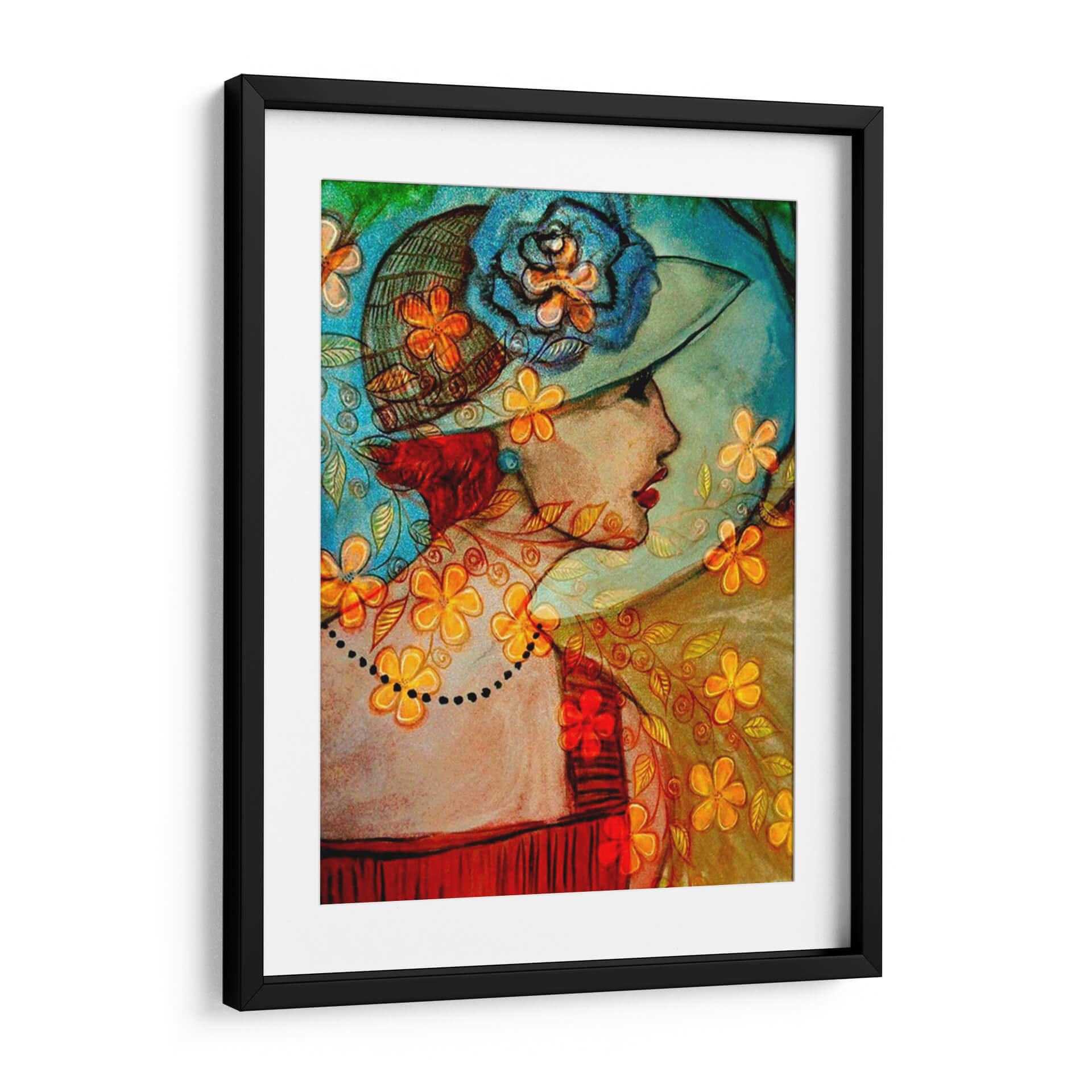 Sumérgete en la elegancia atemporal de 'Bella II', una cautivadora obra de arte digital de Danielle Harrington que evoca la sofisticación y el encanto de épocas pasadas. Esta pieza presenta el perfil de una mujer adornada con un sombrero de ala ancha, decorado con una voluminosa flor azul y detalles florales vibrantes. La paleta de colores es una fusión armoniosa de tonos cálidos y fríos, donde los azules profundos y turquesas del fondo y el sombrero contrastan con los toques anaranjados y dorados de las flores y los motivos ornamentales que envuelven a la figura. El estilo combina elementos figurativos con un tratamiento casi abstracto en el fondo y los detalles, creando una textura visual rica y una atmósfera onírica. La delicada línea de puntos que simula un collar añade un toque de misterio y refinamiento. 'Bella II' es ideal para añadir un punto de interés artístico a salones modernos, tocadores o incluso oficinas, aportando una dosis de carácter y una sensación de belleza clásica. Esta obra decorativa es perfecta para quienes buscan una pieza que sea a la vez elegante y expresiva, capaz de iniciar conversaciones y embellecer cualquier espacio con su singularidad.