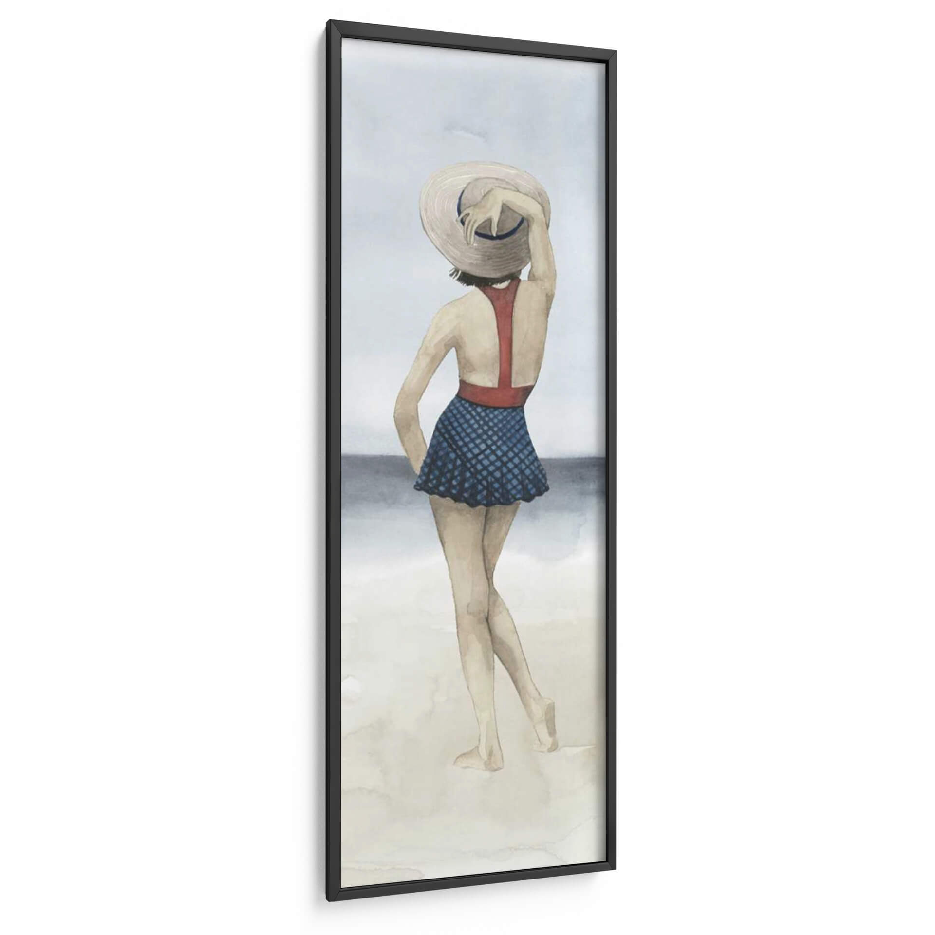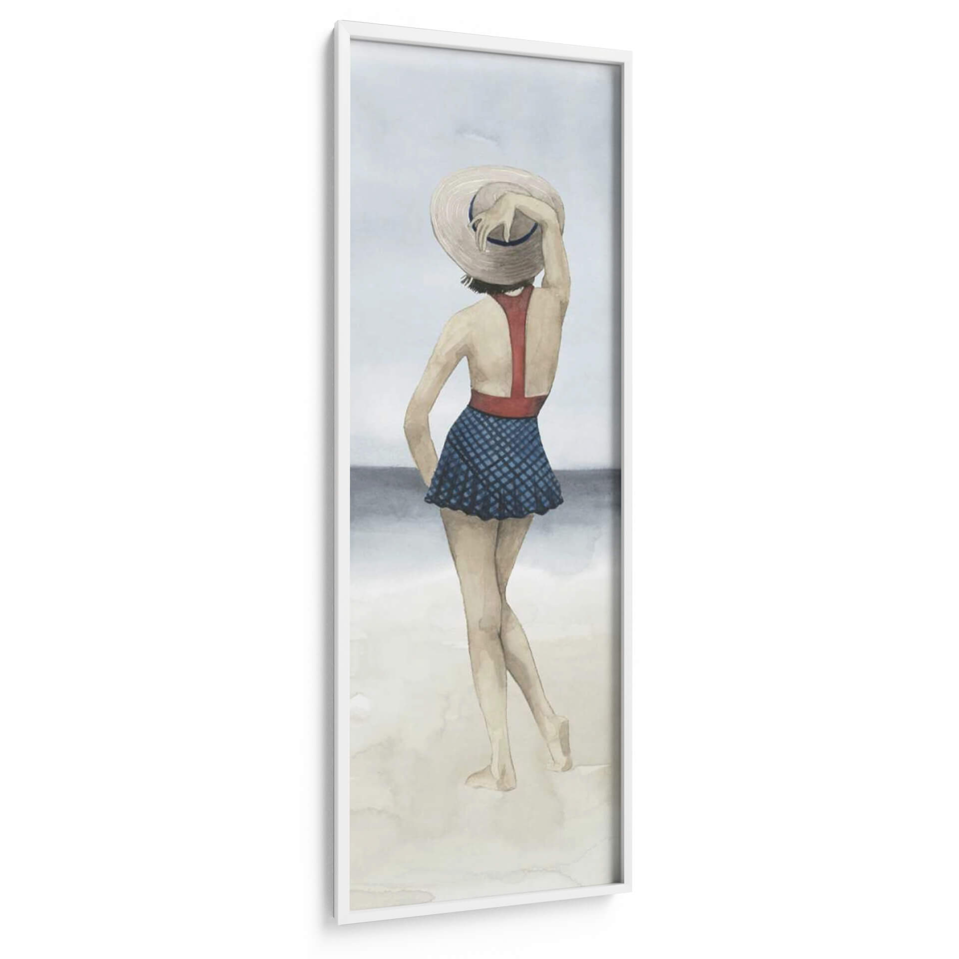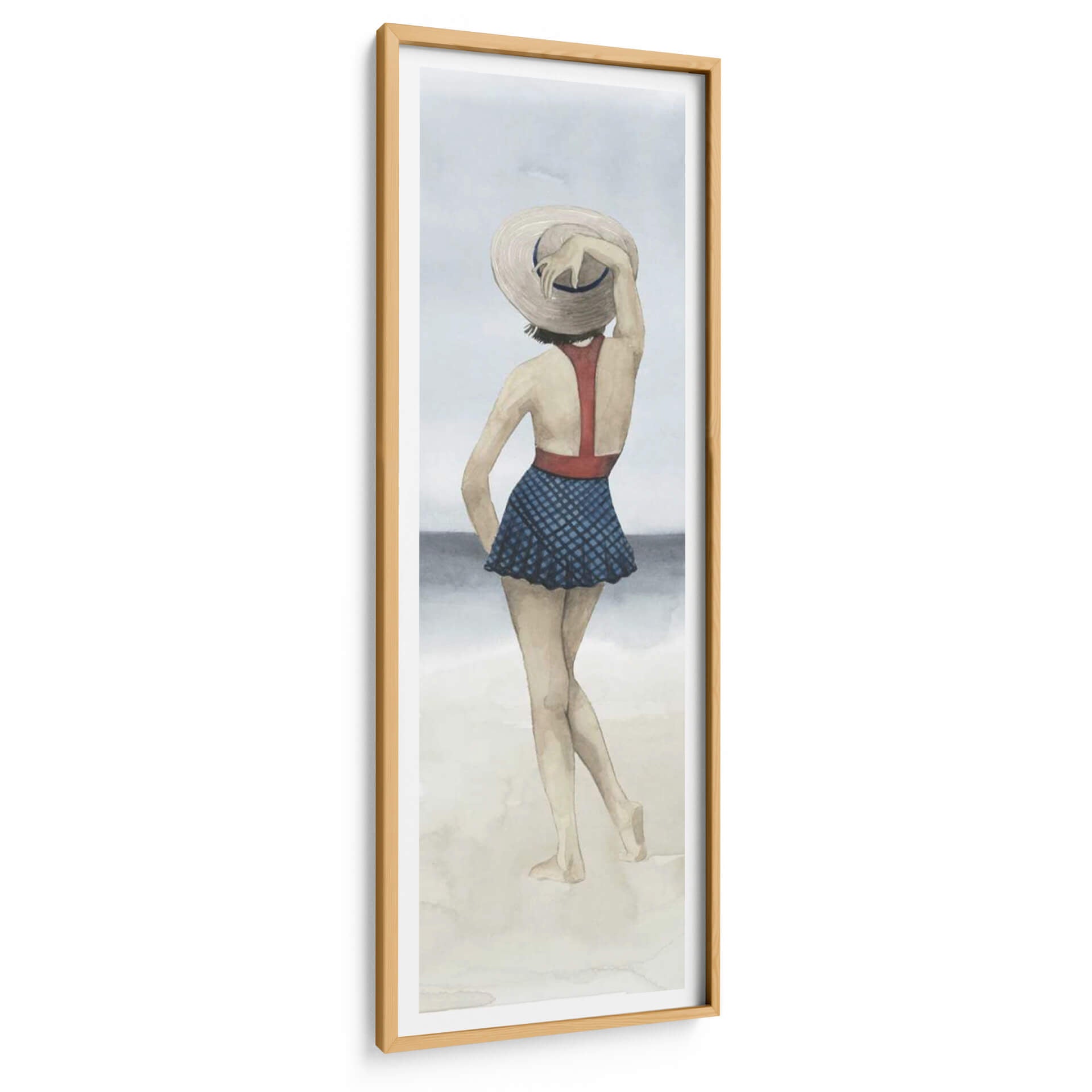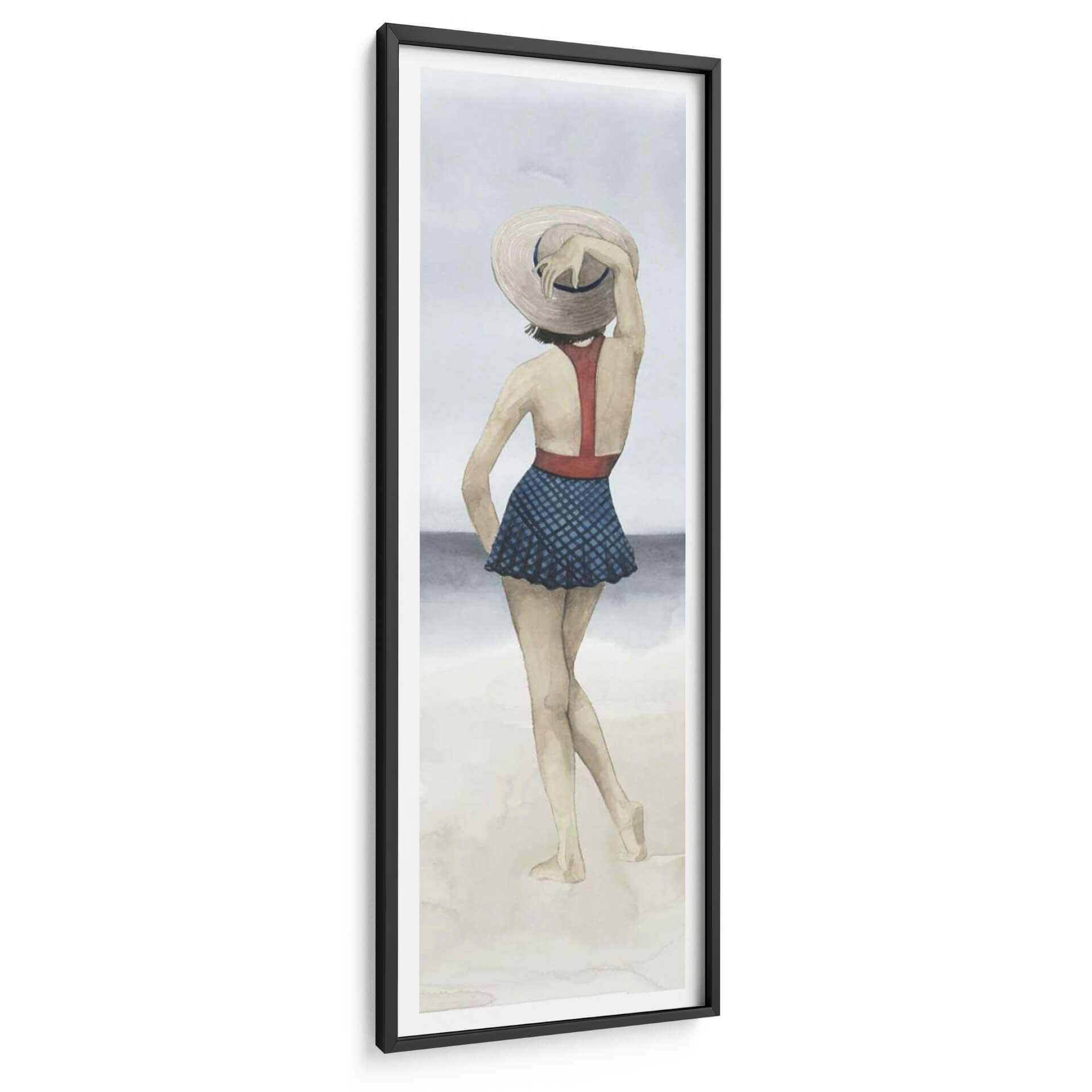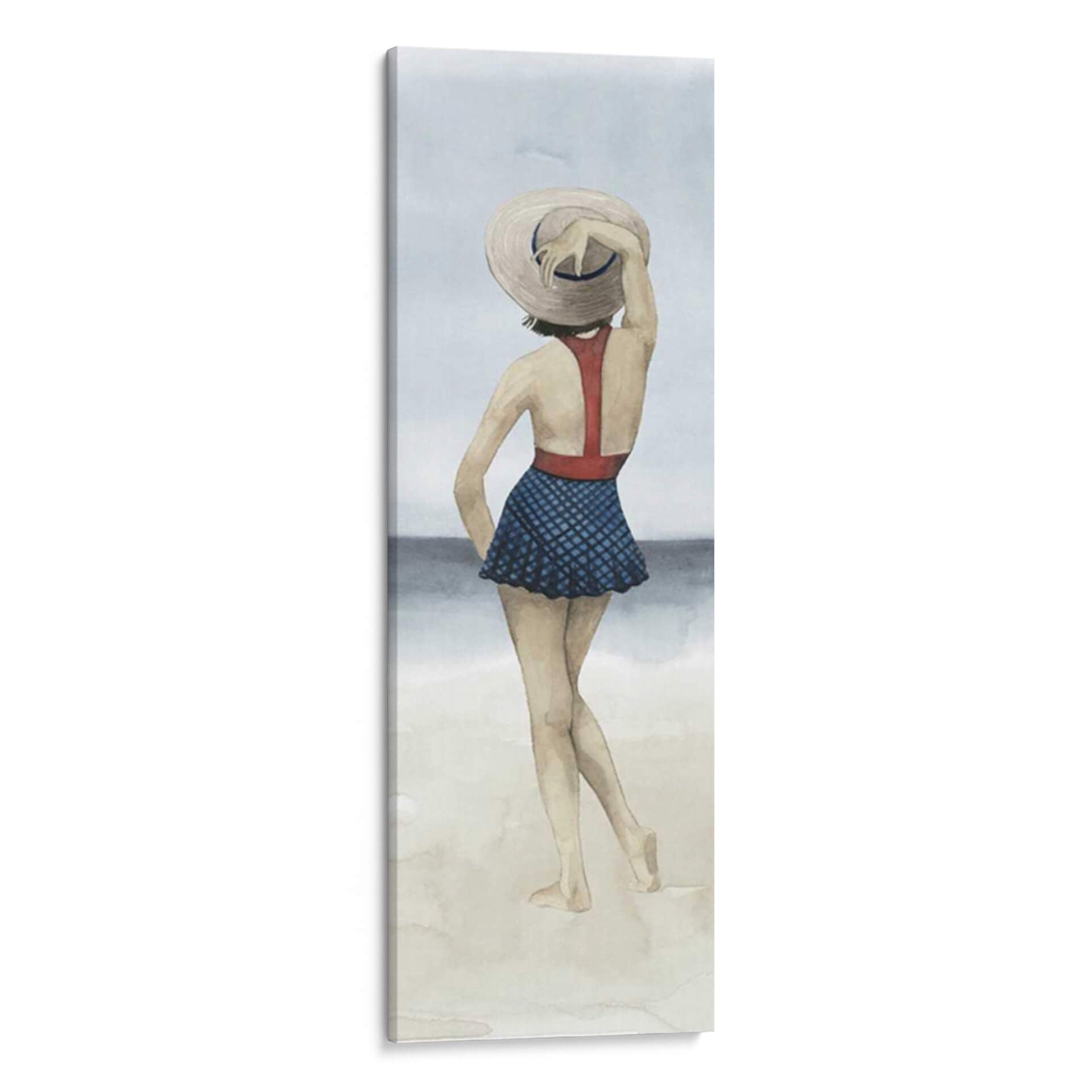 Sumérgete en la serenidad costera con "Belleza de Playa II", una cautivadora obra de arte de Grace Popp. Esta pieza evoca la tranquilidad de un día soleado en la playa, con una figura femenina de espaldas, luciendo un elegante traje de baño retro y un sombrero de ala ancha que añade un toque de misterio y sofisticación. La paleta de colores, dominada por suaves tonos arena, azules marinos y un vibrante acento rojo, crea una atmósfera relajante y a la vez chic. El estilo acuarela, con sus pinceladas sueltas y translúcidas, aporta una sensación de ligereza y movimiento, capturando la brisa marina y el calor del sol. Ideal para añadir un toque de elegancia vacacional a tu sala de estar, dormitorio o incluso un baño con temática costera, este cuadro decorativo te transportará a momentos de paz y belleza. La composición vertical y la figura central atraen la mirada, convirtiéndola en un punto focal encantador para cualquier espacio que busque evocar calma y nostalgia.