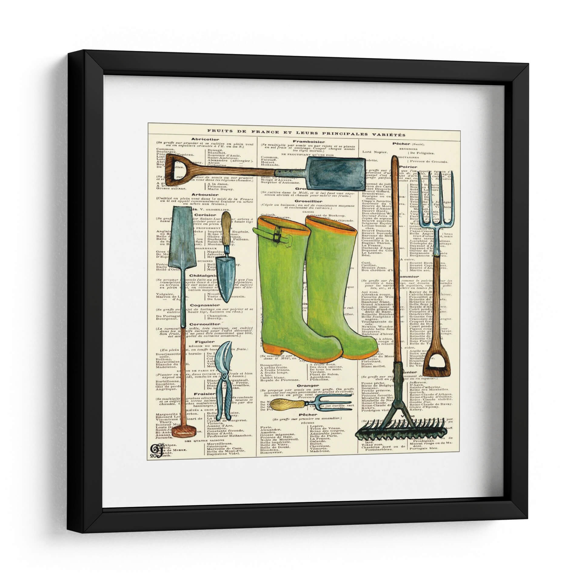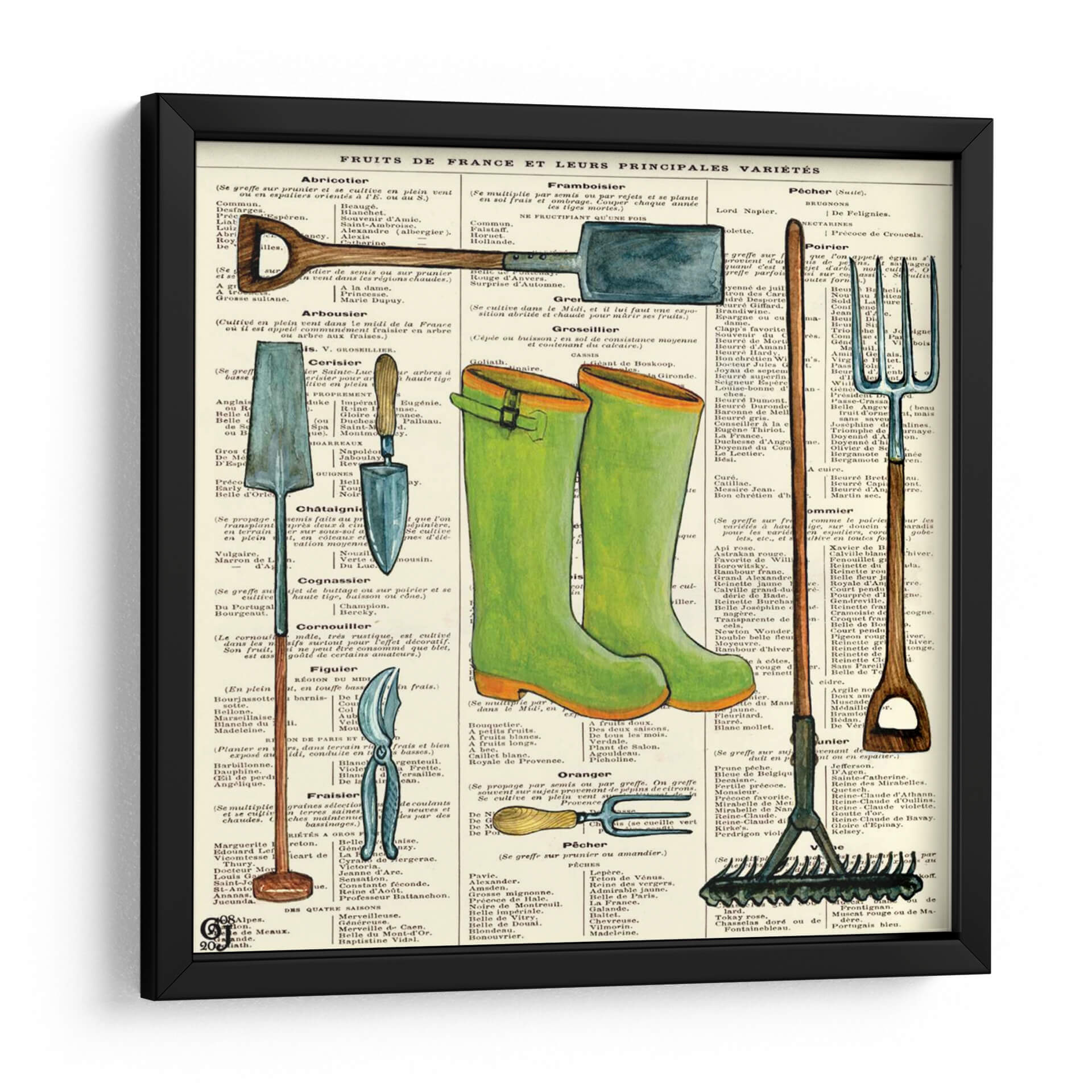 Adéntrate en el encantador mundo de la jardinería con esta evocadora obra de arte, "Botas de Jardín" de Ginny Joyner. Esta pieza captura la esencia rústica y nostálgica de las labores al aire libre, presentando unas botas de agua verdes vibrantes y herramientas de jardín clásicas sobre un fondo de texto antiguo que recuerda a un herbario o un manual de botánica. Los tonos tierra y verdes dominantes crean una atmósfera acogedora y serena, perfecta para infundir un toque de naturaleza y tradición en cualquier espacio. La composición, con las botas como protagonista y las herramientas dispuestas a su alrededor, evoca una sensación de preparación y anticipación, como si la aventura del jardín estuviera a punto de comenzar. Ideal para amantes de la jardinería, decoradores de interiores que buscan un estilo rústico o vintage, o cualquiera que aprecie el encanto de los objetos cotidianos elevados a arte. Este cuadro decorativo es una invitación a celebrar la conexión con la tierra y la belleza de lo simple, añadiendo carácter y calidez a tu hogar u oficina.