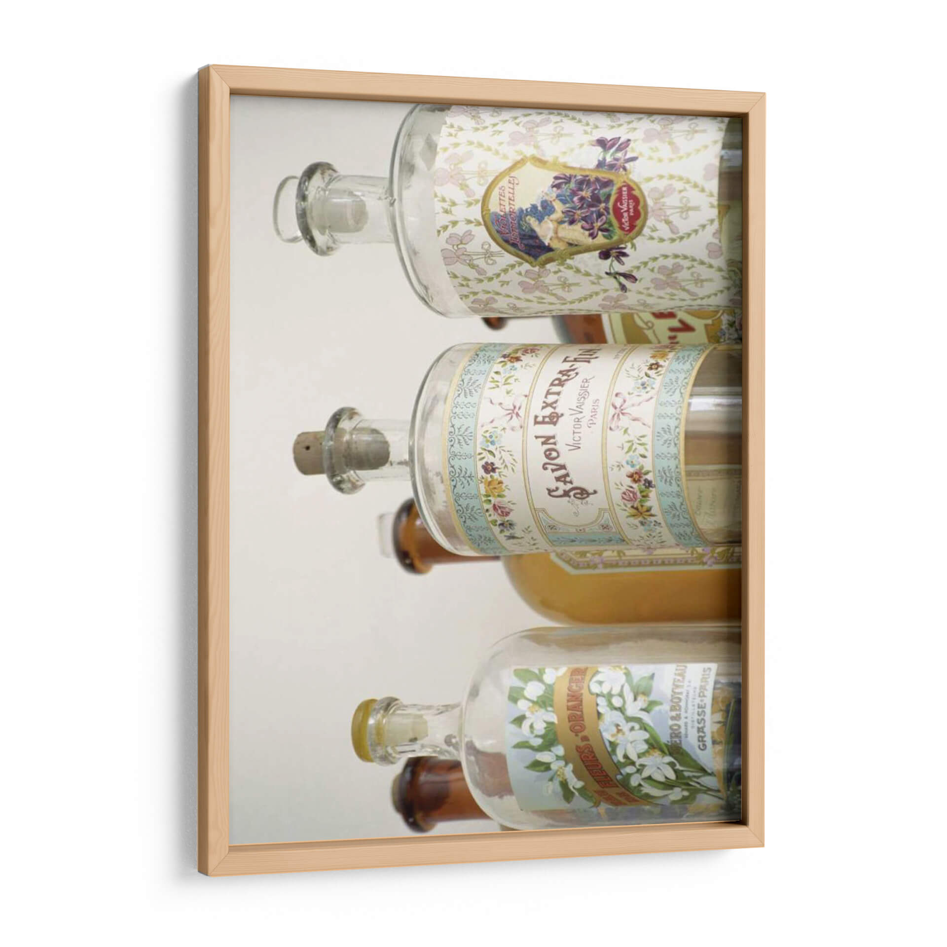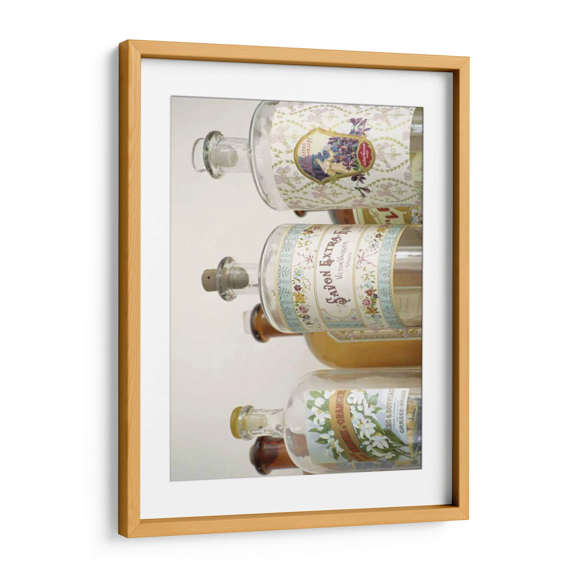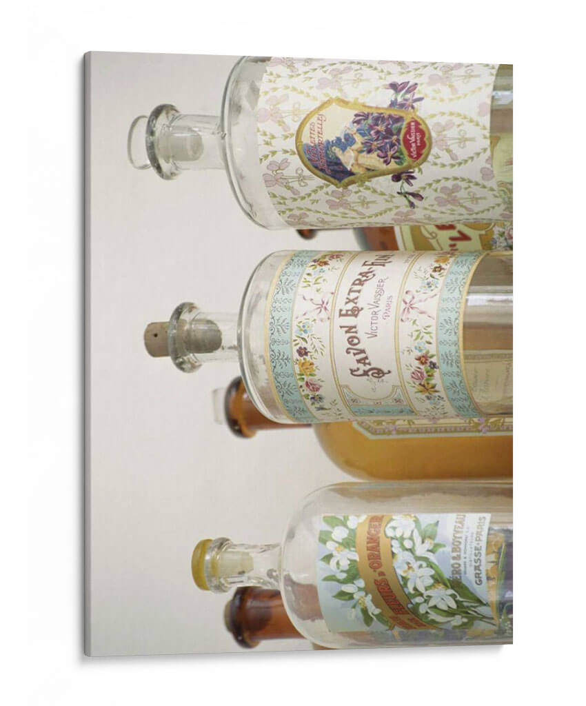 Aporta un toque de elegancia vintage y sofisticación a tu hogar con este cautivador cuadro decorativo, 'Botellas De Perfume Francés I' de Madelaine Gray. La obra presenta una pila de botellas de perfume antiguas, cada una adornada con etiquetas detalladas que evocan la opulencia de la perfumería francesa del siglo XIX. Los suaves tonos pastel y los delicados motivos florales de las etiquetas contrastan maravillosamente con el vidrio transparente de las botellas, creando una atmósfera de nostalgia y refinamiento. La composición vertical y el enfoque en los detalles de las etiquetas invitan a una contemplación pausada, sugiriendo historias de aromas exquisitos y un pasado glamuroso. Este cuadro es ideal para añadir un acento de carácter y distinción a cualquier estancia, desde un tocador íntimo hasta una sala de estar o un estudio.