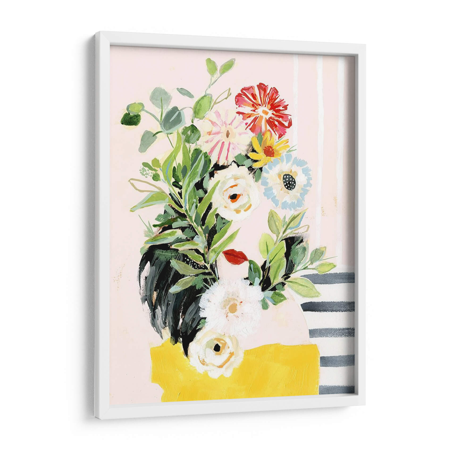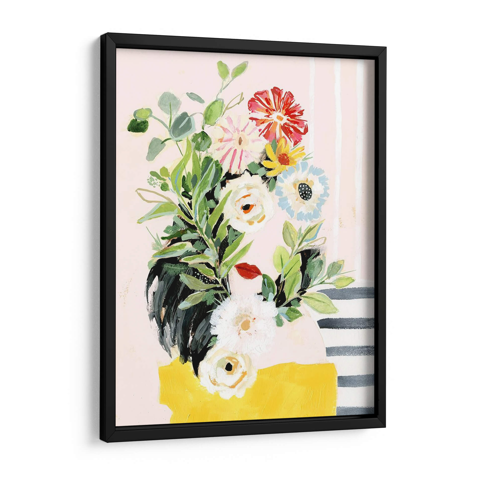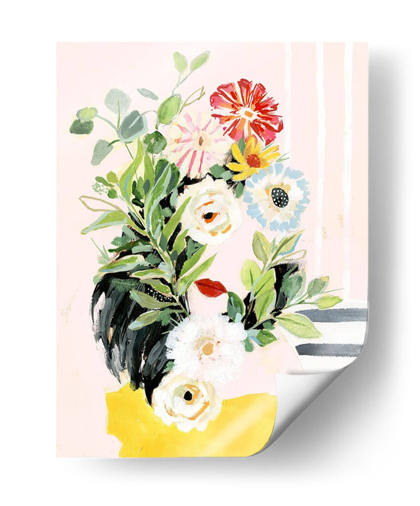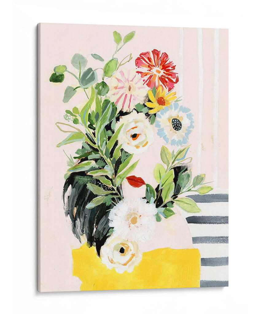 Embellece tu hogar con el encanto de 'Crece Tu Propia Manera II', una vibrante obra de arte de Victoria Borges que captura la esencia de la naturaleza con un toque moderno. Este cuadro decorativo presenta un exuberante ramo de flores pintado con trazos audaces y una paleta de colores que equilibra tonos pastel suaves con acentos brillantes de rojo, amarillo y azul. Las delicadas hojas verdes y las diversas formas florales, desde capullos blancos hasta flores rojas impactantes, crean una composición dinámica y llena de vida. El fondo, adornado con sutiles rayas verticales y una mancha amarilla audaz en la base, añade un toque de diseño contemporáneo que lo hace perfecto para cualquier espacio. Ideal para iluminar salas de estar, añadir un toque de frescura a un dormitorio o infundir creatividad en una oficina. Esta pieza evoca sentimientos de crecimiento, vitalidad y optimismo, invitando a la contemplación y al disfrute estético. Es una adición perfecta para quienes buscan arte que hable de renovación y belleza natural en su máxima expresión.