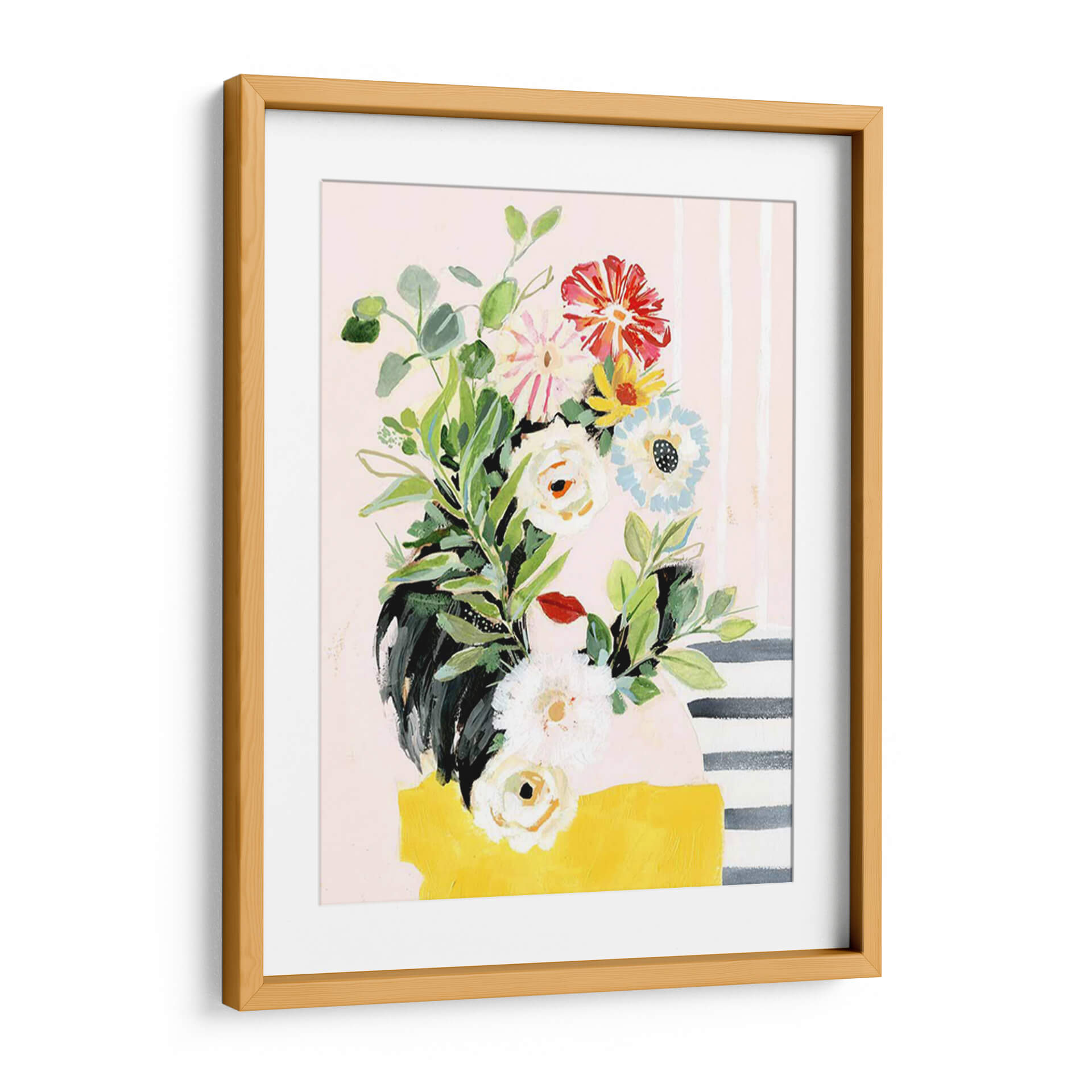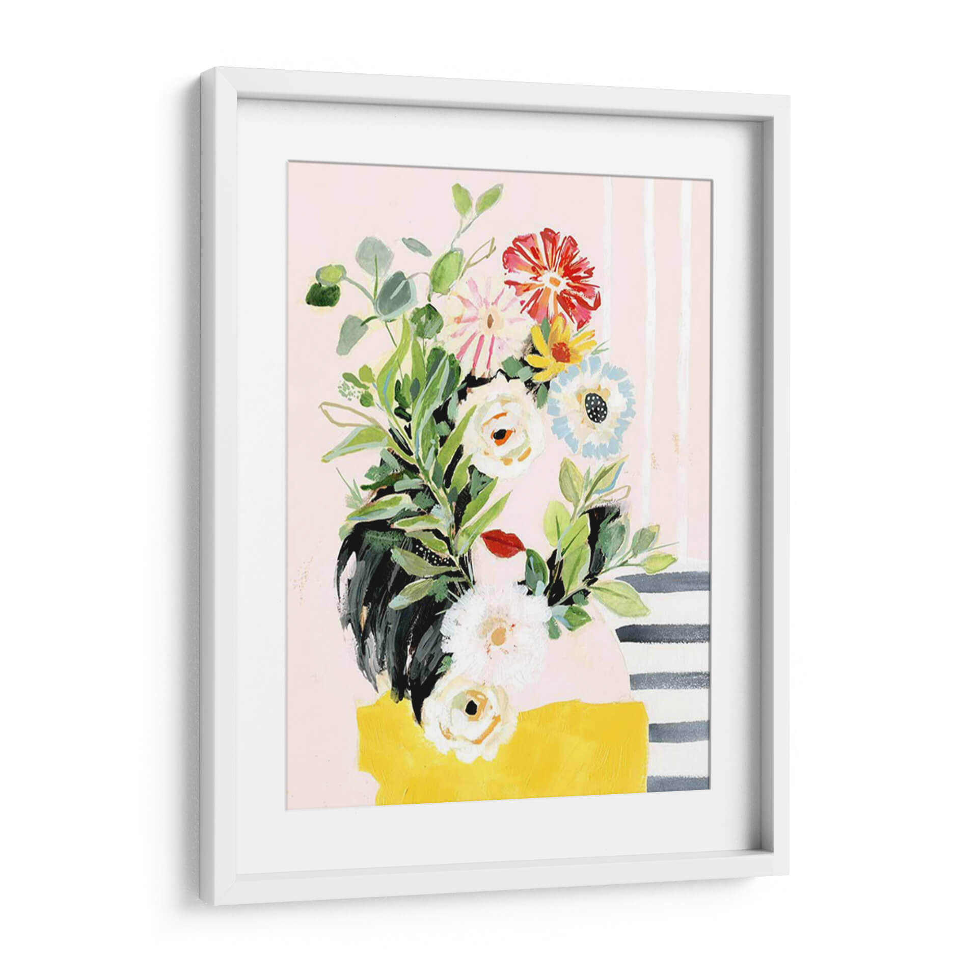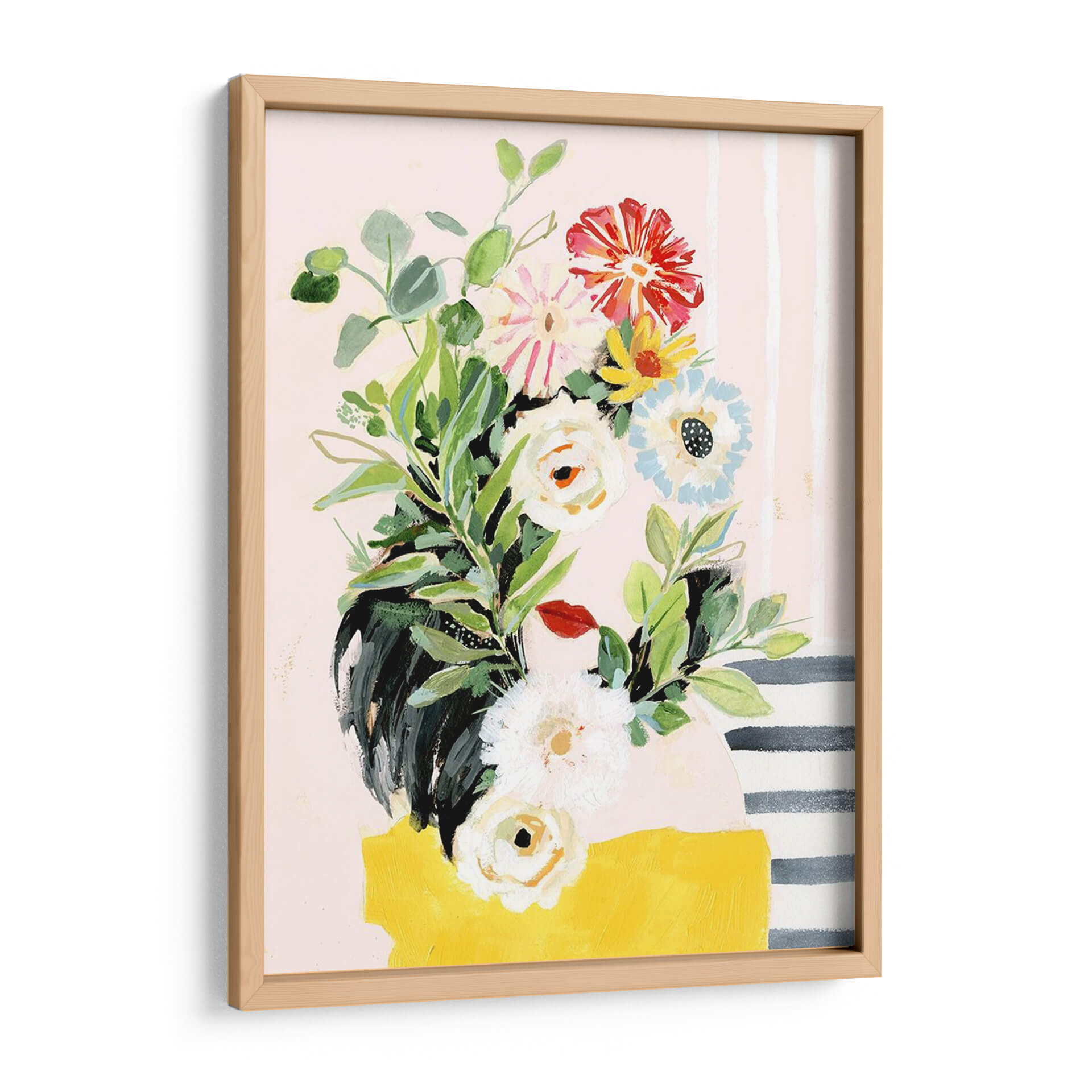Embellece tu hogar con el encanto de 'Crece Tu Propia Manera II', una vibrante obra de arte de Victoria Borges que captura la esencia de la naturaleza con un toque moderno. Este cuadro decorativo presenta un exuberante ramo de flores pintado con trazos audaces y una paleta de colores que equilibra tonos pastel suaves con acentos brillantes de rojo, amarillo y azul. Las delicadas hojas verdes y las diversas formas florales, desde capullos blancos hasta flores rojas impactantes, crean una composición dinámica y llena de vida. El fondo, adornado con sutiles rayas verticales y una mancha amarilla audaz en la base, añade un toque de diseño contemporáneo que lo hace perfecto para cualquier espacio. Ideal para iluminar salas de estar, añadir un toque de frescura a un dormitorio o infundir creatividad en una oficina. Esta pieza evoca sentimientos de crecimiento, vitalidad y optimismo, invitando a la contemplación y al disfrute estético. Es una adición perfecta para quienes buscan arte que hable de renovación y belleza natural en su máxima expresión.