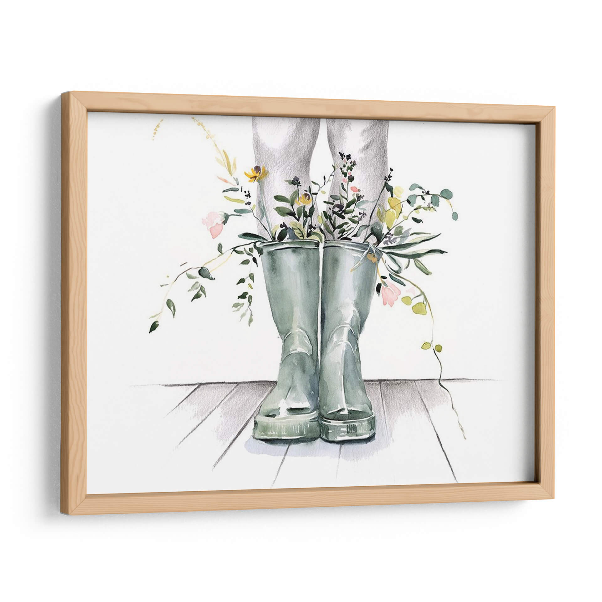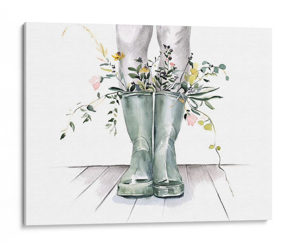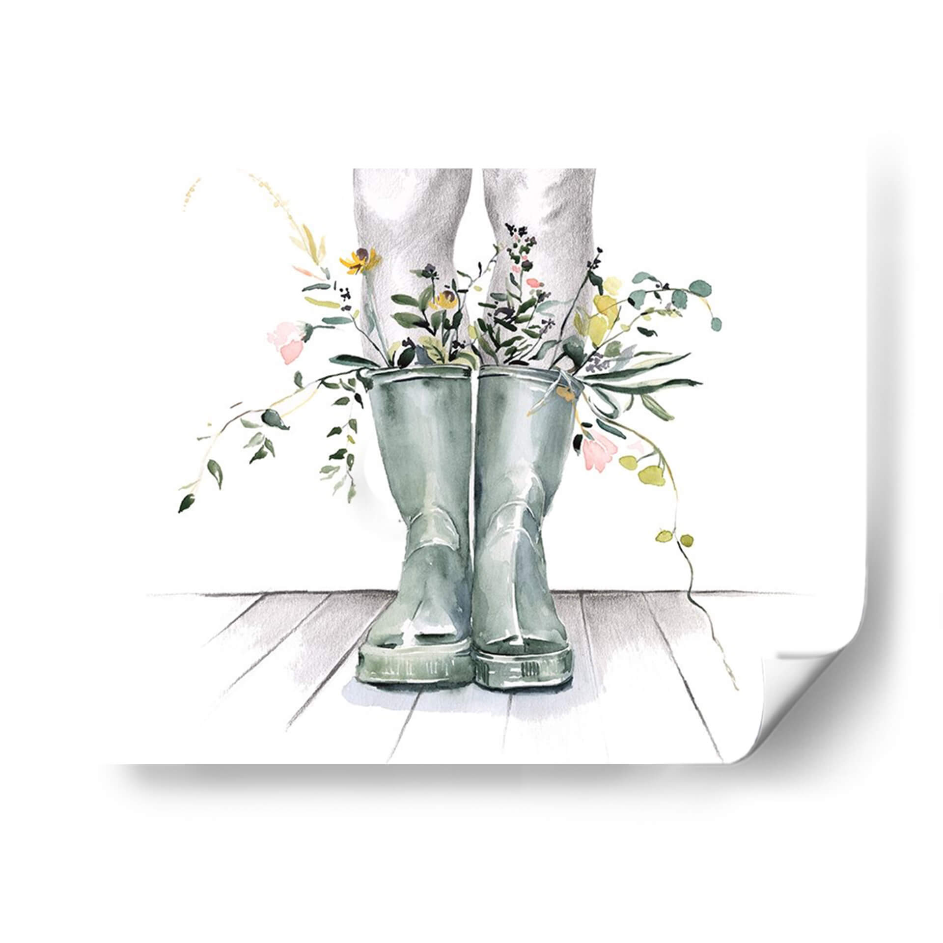 Captura la esencia de la primavera y el renacimiento con "Flujo Y Crecer Ii", una encantadora obra de arte de Jennifer Paxton Parker. Esta pieza presenta un par de botas de agua de color verde menta, rebosantes de una exuberante variedad de flores y follaje en tonos pastel y verdes vibrantes. La delicadeza de la acuarela se aprecia en cada pétalo y hoja, creando una atmósfera de frescura y vitalidad. La composición, centrada en las botas y el arreglo floral que emerge de ellas, evoca una sensación de conexión con la naturaleza y el ciclo de crecimiento. Los sutiles toques de color rosa, amarillo y verde se combinan armoniosamente sobre un fondo blanco y unas tablas de madera clara, aportando luminosidad y serenidad al conjunto. "Flujo Y Crecer Ii" es ideal para añadir un toque de alegría y optimismo a cualquier espacio, ya sea un dormitorio, una sala de estar o un estudio. Este cuadro decorativo invita a la contemplación y celebra la belleza efímera de las estaciones, convirtiéndose en un punto focal inspirador y lleno de vida para tu hogar u oficina. Su estilo, que combina lo figurativo con un toque impresionista, lo hace versátil y apreciado por amantes del arte contemporáneo que buscan piezas con alma.