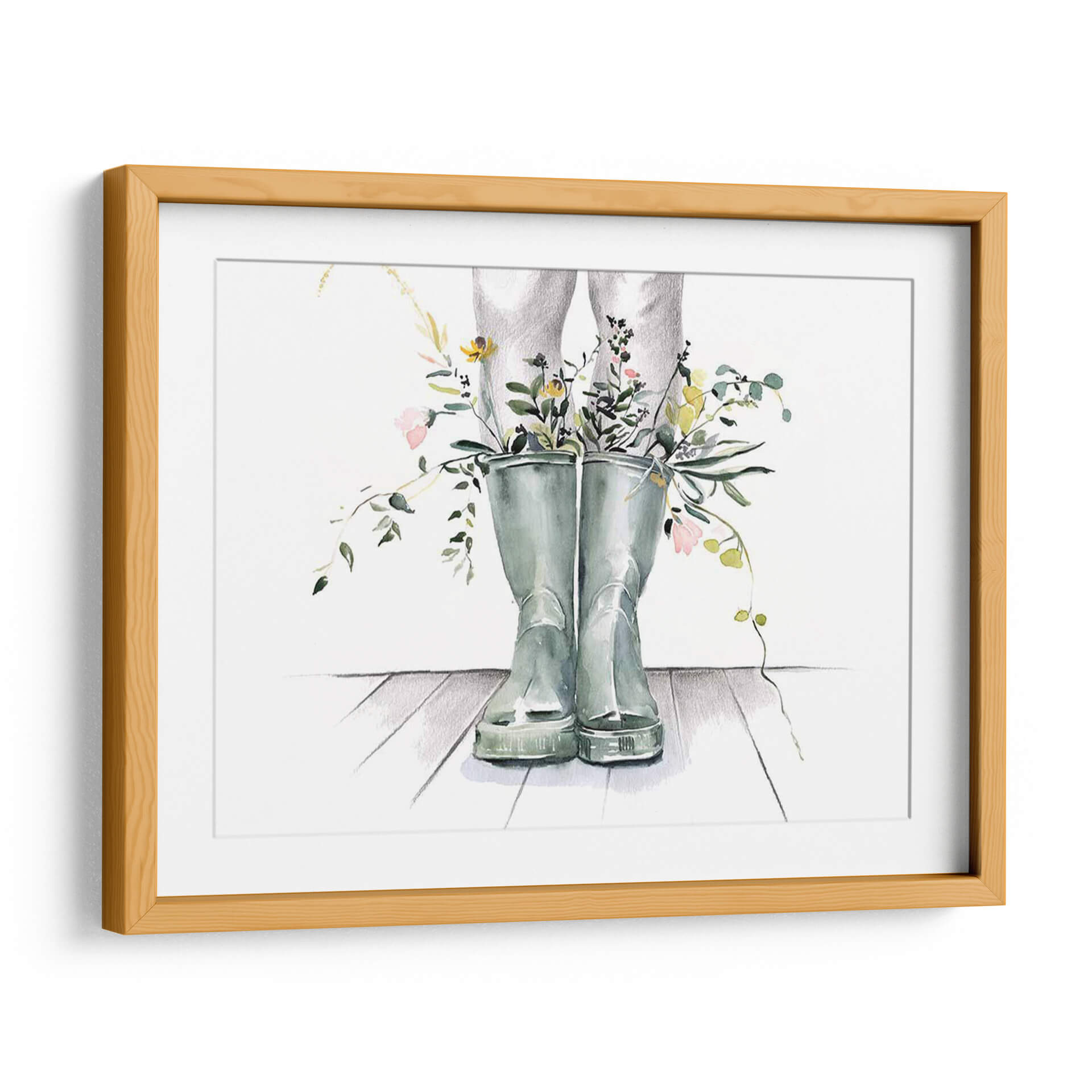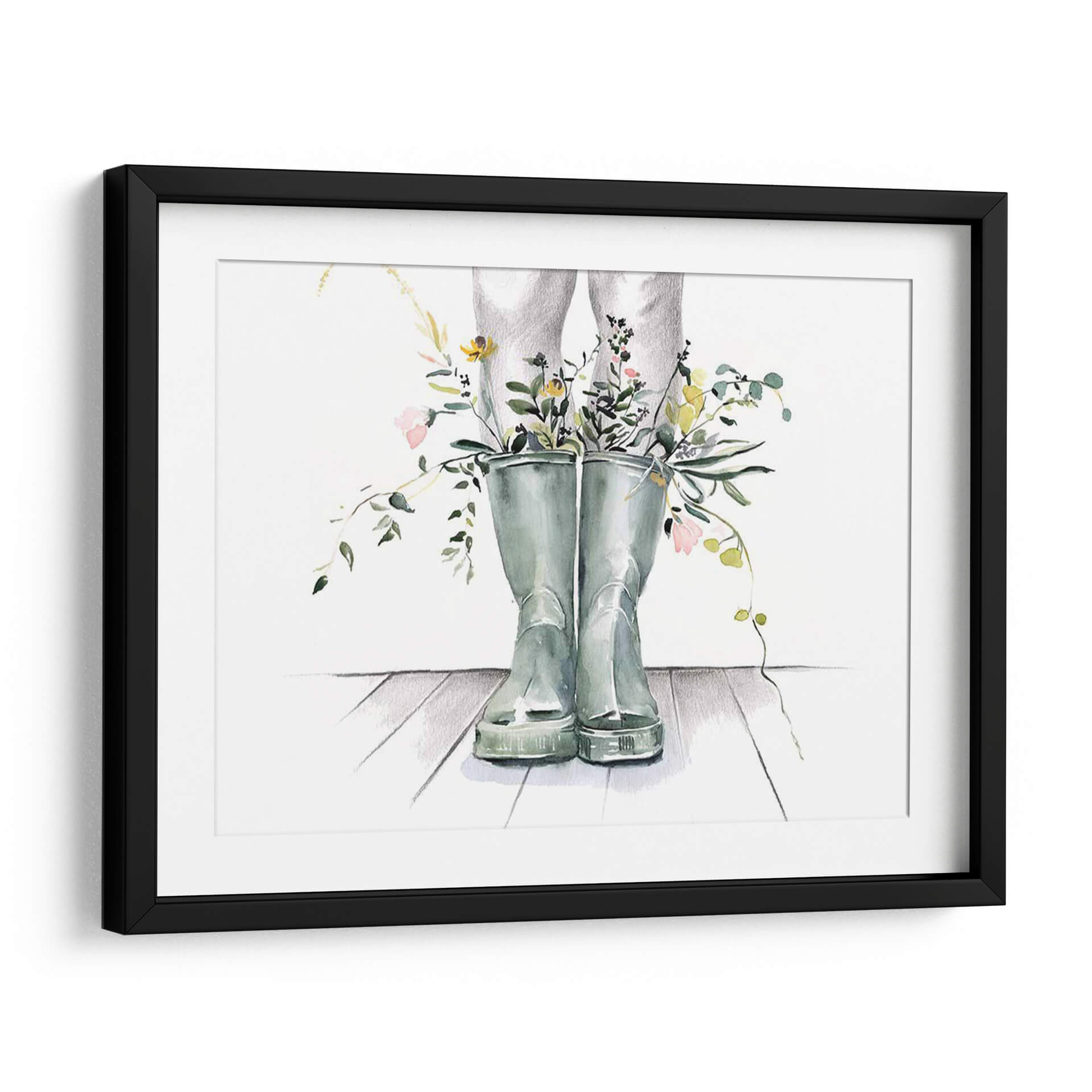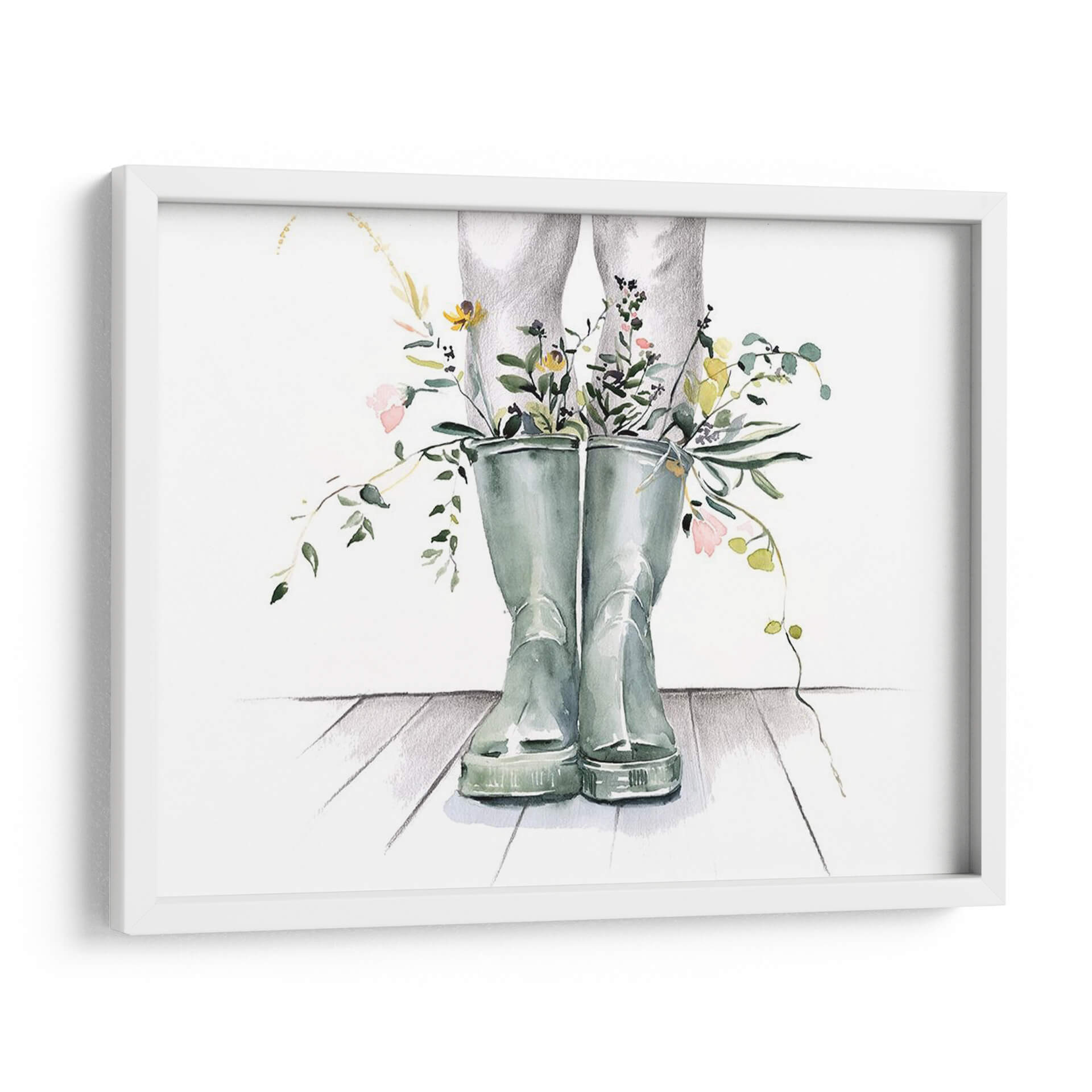 Captura la esencia de la primavera y el renacimiento con "Flujo Y Crecer Ii", una encantadora obra de arte de Jennifer Paxton Parker. Esta pieza presenta un par de botas de agua de color verde menta, rebosantes de una exuberante variedad de flores y follaje en tonos pastel y verdes vibrantes. La delicadeza de la acuarela se aprecia en cada pétalo y hoja, creando una atmósfera de frescura y vitalidad. La composición, centrada en las botas y el arreglo floral que emerge de ellas, evoca una sensación de conexión con la naturaleza y el ciclo de crecimiento. Los sutiles toques de color rosa, amarillo y verde se combinan armoniosamente sobre un fondo blanco y unas tablas de madera clara, aportando luminosidad y serenidad al conjunto. "Flujo Y Crecer Ii" es ideal para añadir un toque de alegría y optimismo a cualquier espacio, ya sea un dormitorio, una sala de estar o un estudio. Este cuadro decorativo invita a la contemplación y celebra la belleza efímera de las estaciones, convirtiéndose en un punto focal inspirador y lleno de vida para tu hogar u oficina. Su estilo, que combina lo figurativo con un toque impresionista, lo hace versátil y apreciado por amantes del arte contemporáneo que buscan piezas con alma.