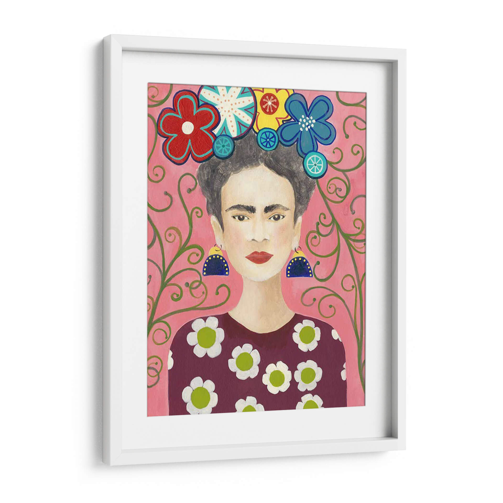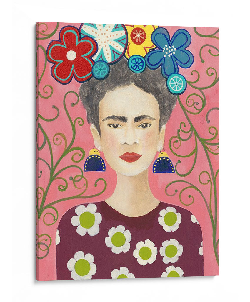 Embellece tu espacio con "Frida Floral I", una cautivadora obra de arte de Regina Moore. Este cuadro decorativo presenta un retrato estilizado de una mujer adornada con una vibrante corona floral y pendientes audaces, sobre un fondo rosa con intrincados motivos vegetales en espiral. La paleta de colores, que combina el rosa cálido del fondo con los alegres tonos de las flores rojas, amarillas y azules, junto con el morado oscuro de su vestimenta y el verde de las enredaderas, crea una atmósfera de alegría y vitalidad. El estilo distintivo de Moore, que evoca un aire de arte popular moderno con toques surrealistas y una estética naíf, convierte a esta pieza en un punto focal lleno de personalidad. Es ideal para añadir un toque de color y carácter a cualquier sala de estar, dormitorio u oficina, inspirando creatividad y celebrando la belleza de la naturaleza y la expresión personal. "Frida Floral I" no es solo una decoración, es una declaración de estilo que resonará con amantes del arte que aprecian la originalidad y la fuerza expresiva.