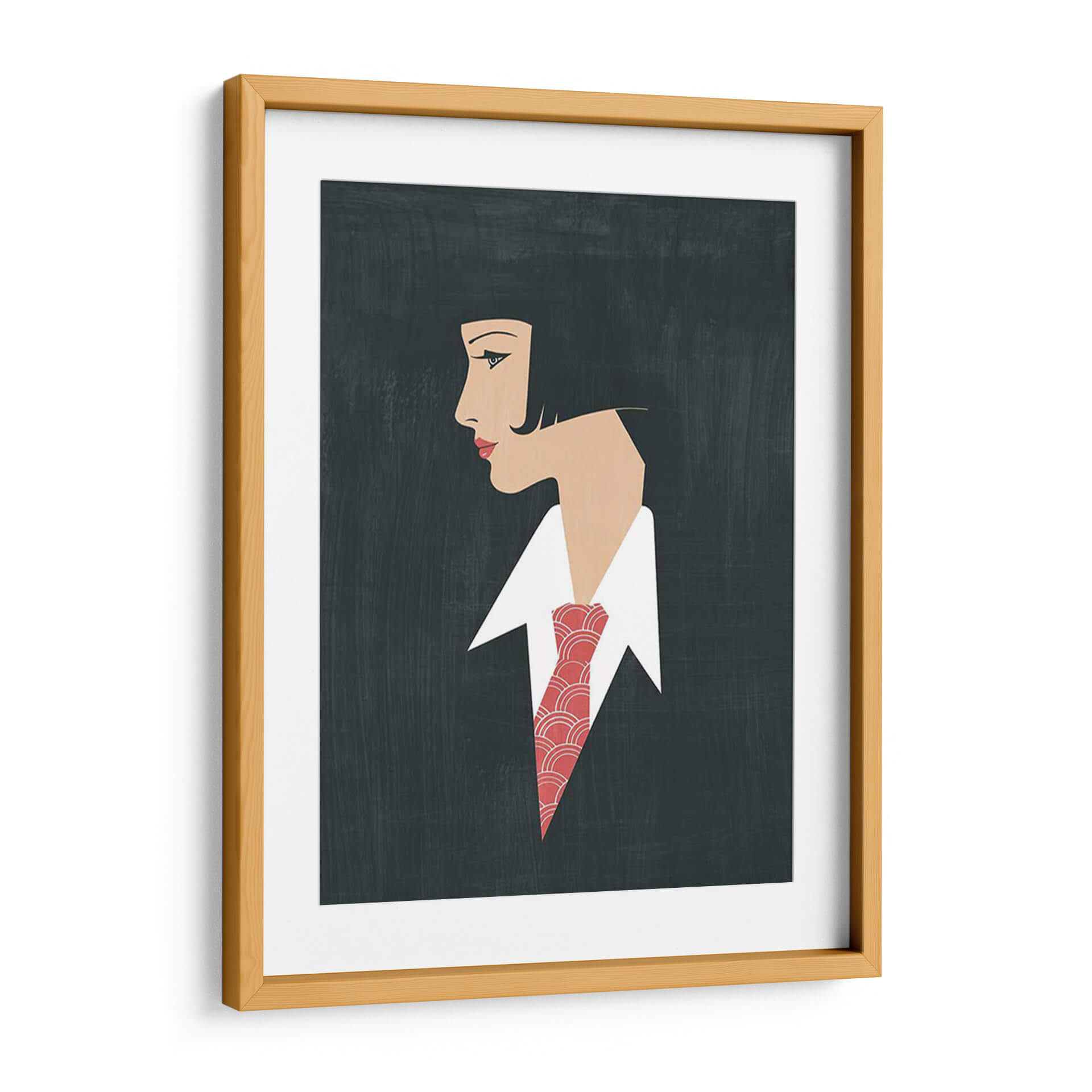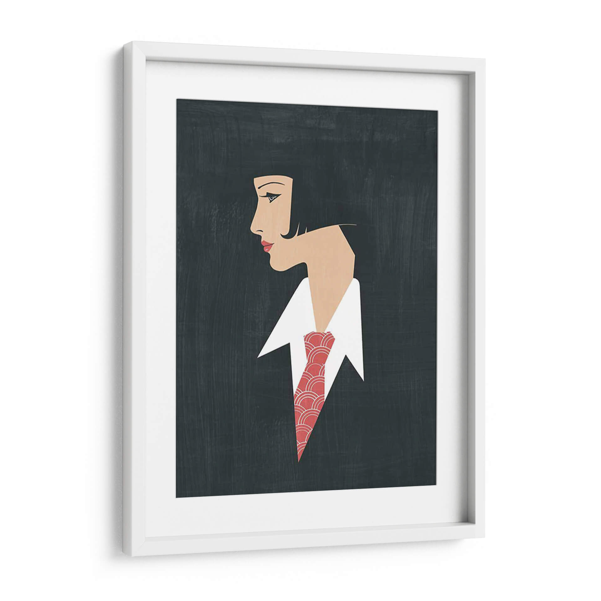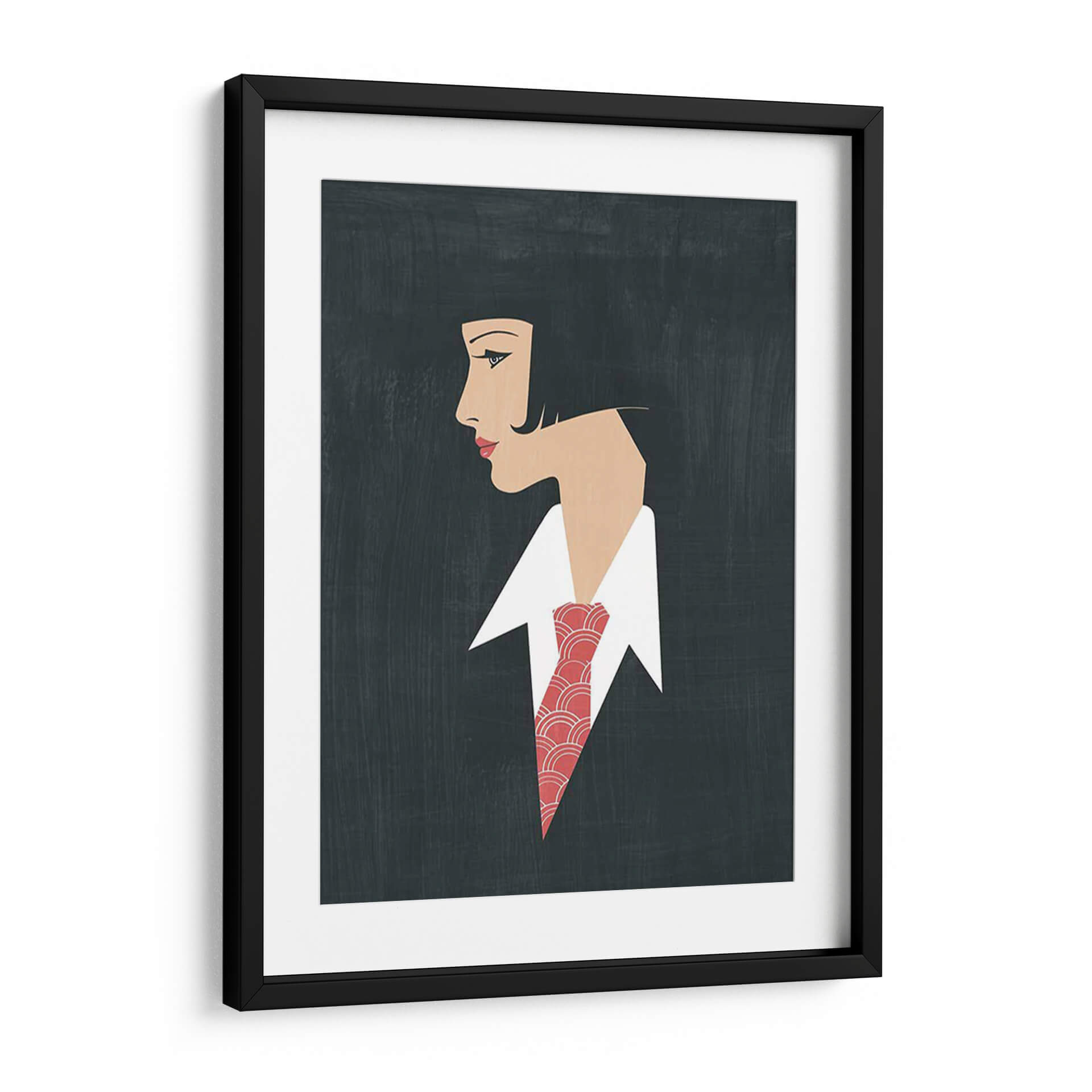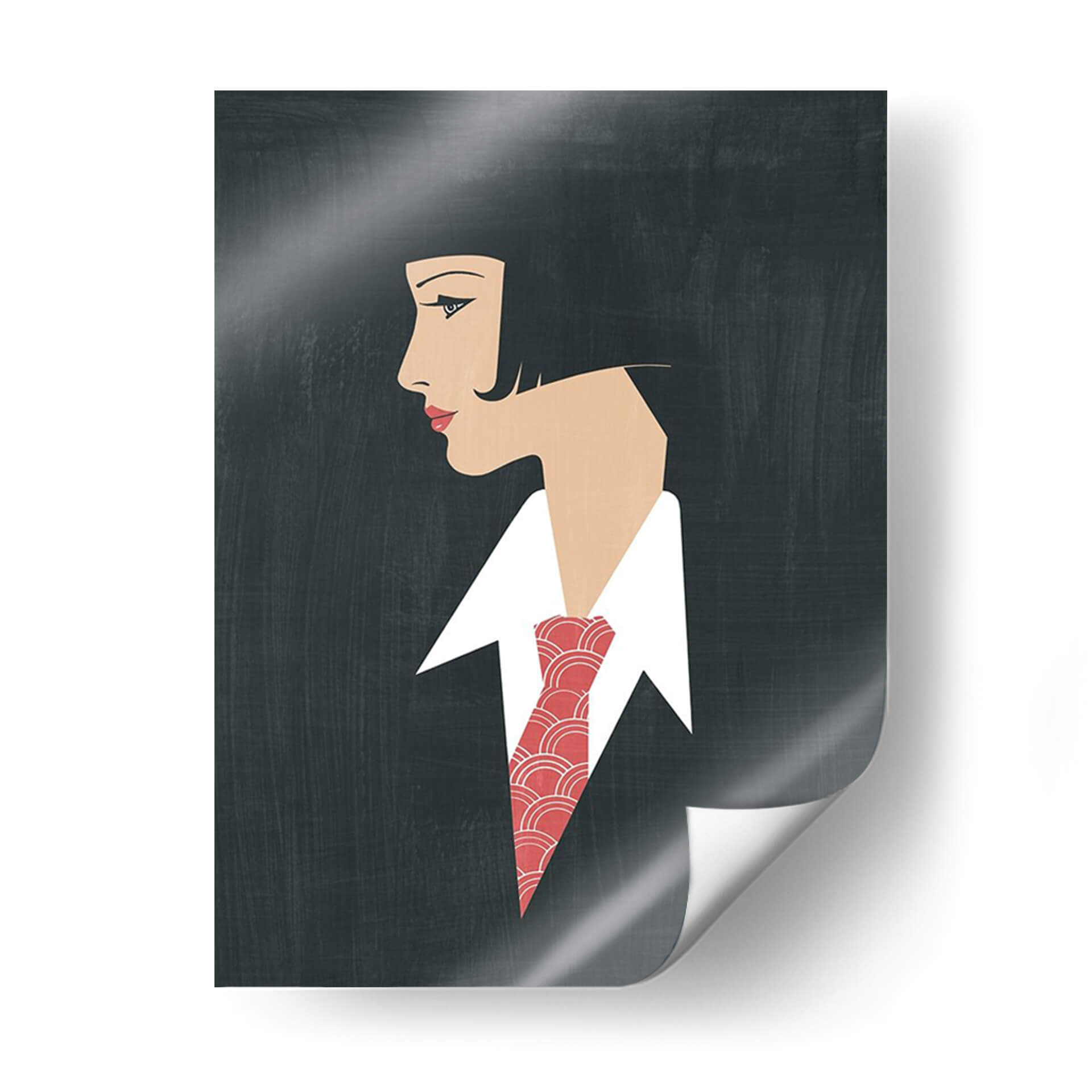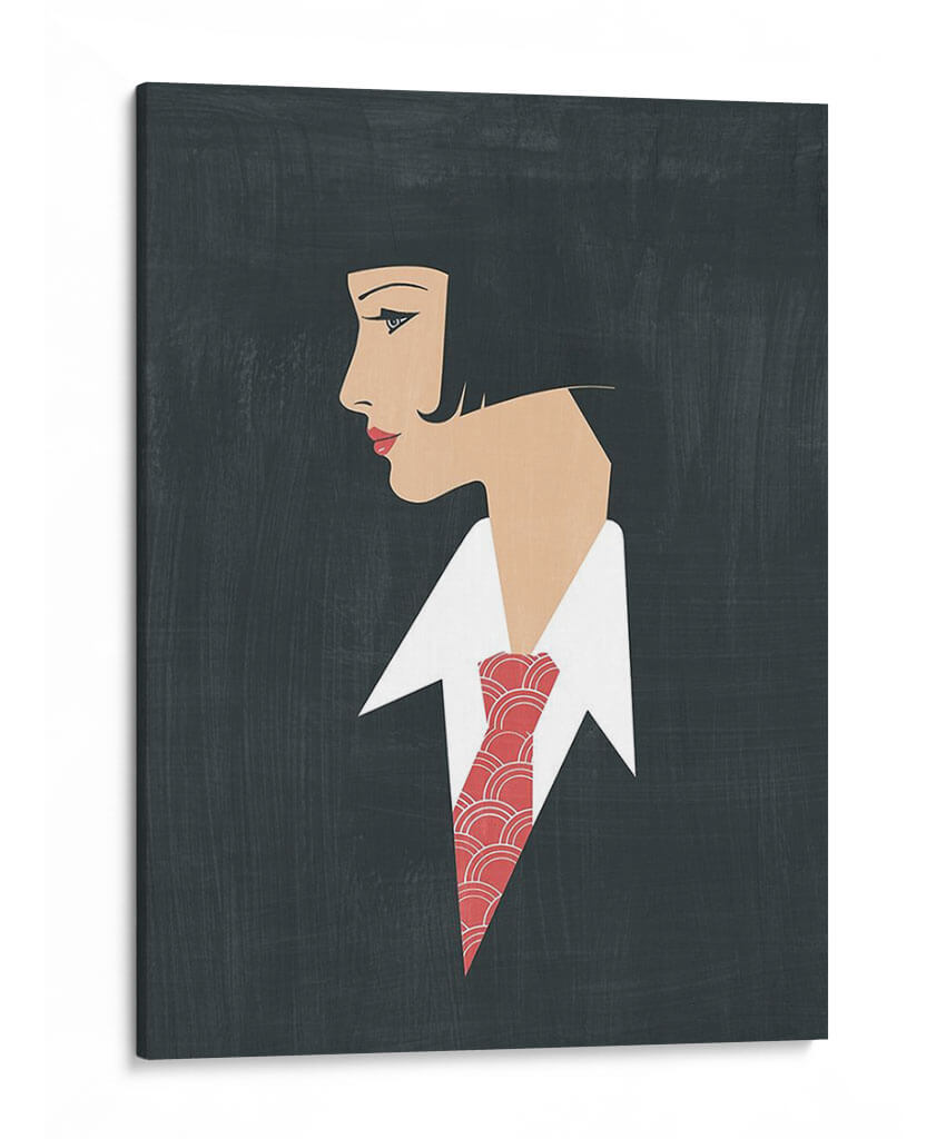 Embárcate en un viaje de elegancia atemporal con "Golden Age Gals III", una obra de arte digital que evoca la sofisticación de épocas pasadas. Esta pieza captura el perfil de una mujer con un corte de pelo bob clásico y una mirada introspectiva, destacada por un vibrante pañuelo o corbata con un patrón geométrico en tonos rojos y blancos. El fondo oscuro y texturizado crea un contraste dramático, realzando la figura femenina y el detalle de su vestimenta. El estilo gráfico y estilizado, con líneas limpias y una paleta de colores limitada pero impactante, recuerda al Art Déco, transmitiendo una sensación de glamour discreto y misterio. Esta obra es ideal para añadir un toque de distinción a cualquier espacio, desde una sala de estar moderna hasta una oficina ejecutiva, creando un punto focal que invita a la contemplación y la admiración. Su versatilidad permite integrarla en decoraciones que buscan un equilibrio entre lo clásico y lo contemporáneo, aportando carácter y una atmósfera de refinamiento.