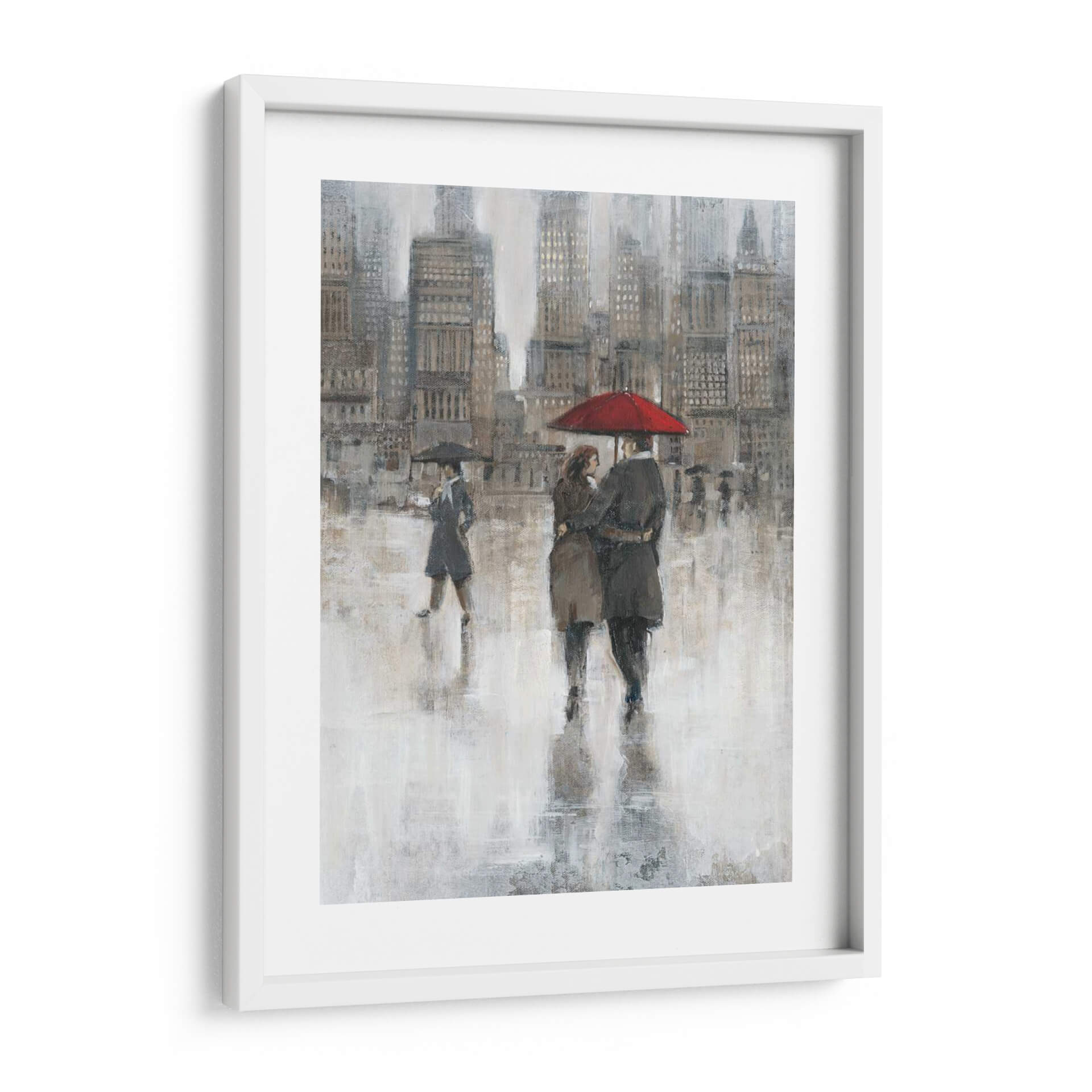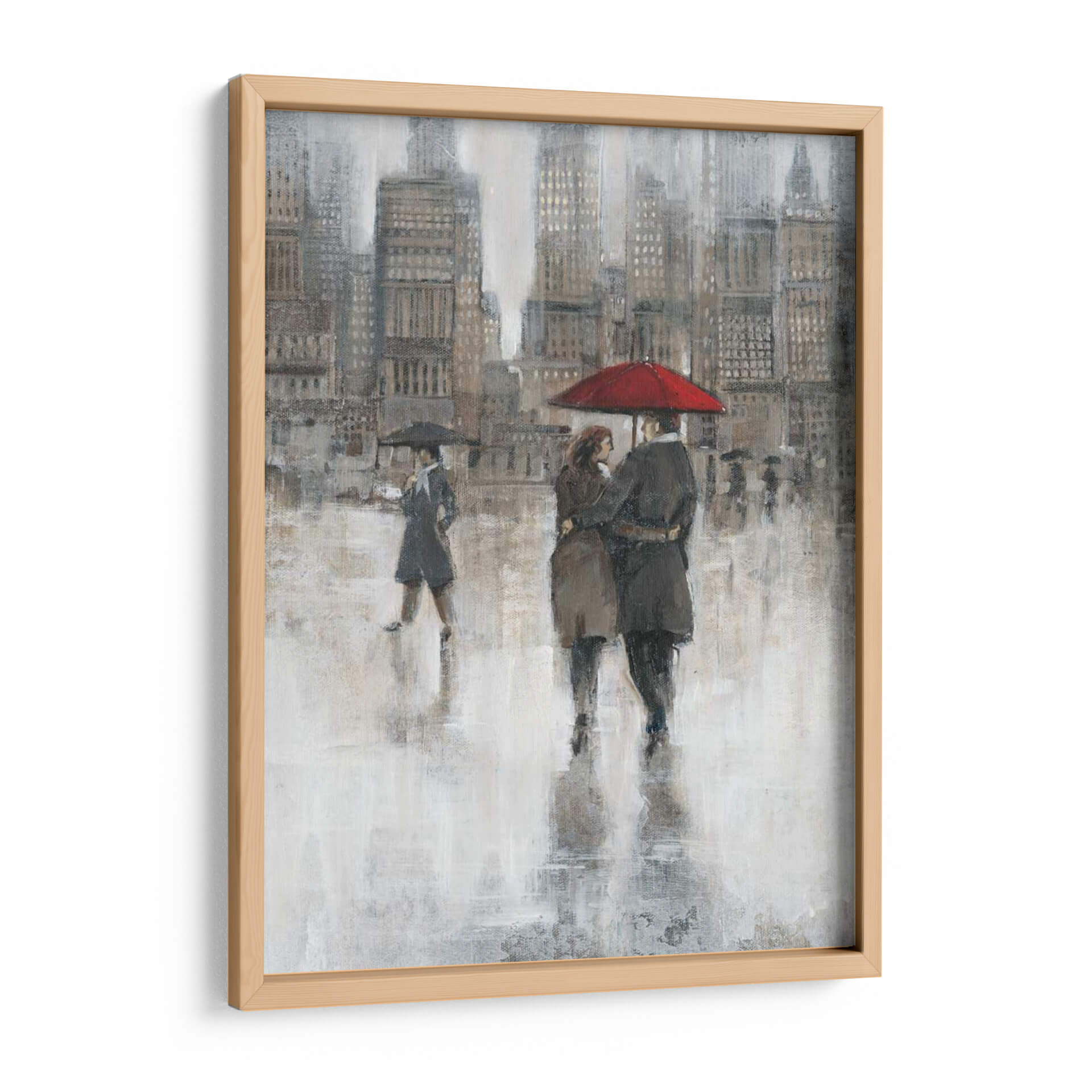 Sumérgete en la atmósfera melancólica y romántica de "Lluvia En La Ciudad II", una obra de arte de Tim O'Toole que captura la esencia de un día lluvioso en un entorno urbano. La pieza evoca una sensación de intimidad y conexión humana en medio de la vastedad de la ciudad, representada por un conjunto de edificios estilizados que se pierden en la bruma. Los tonos grises y neutros predominantes crean una paleta sutil, rota únicamente por el vibrante toque de un paraguas rojo, que actúa como un punto focal emocional y visual, atrayendo la mirada hacia la pareja central que camina bajo su protección. La técnica impresionista y la pincelada suelta transmiten una sensación de movimiento y fugacidad, invitando al espectador a reflexionar sobre los momentos compartidos y la belleza efímera. Este cuadro decorativo es ideal para añadir un toque de sofisticación y calidez a salones, dormitorios o estudios, transformando cualquier espacio en un refugio acogedor y lleno de carácter. Su estilo contemporáneo y su temática universal lo convierten en una adición perfecta para quienes buscan arte que inspire calma y evoque recuerdos.