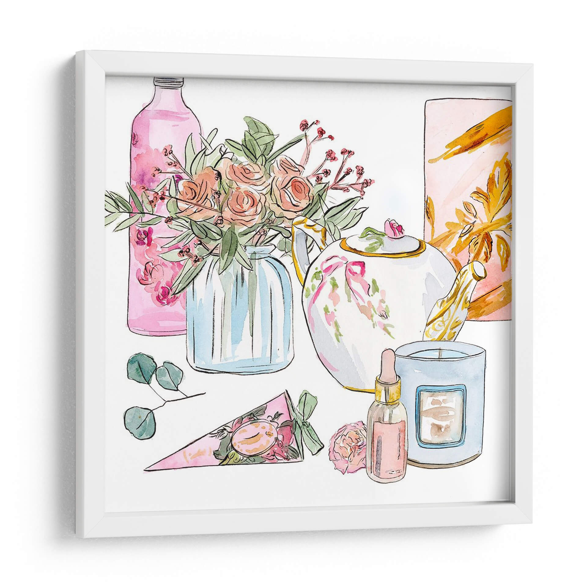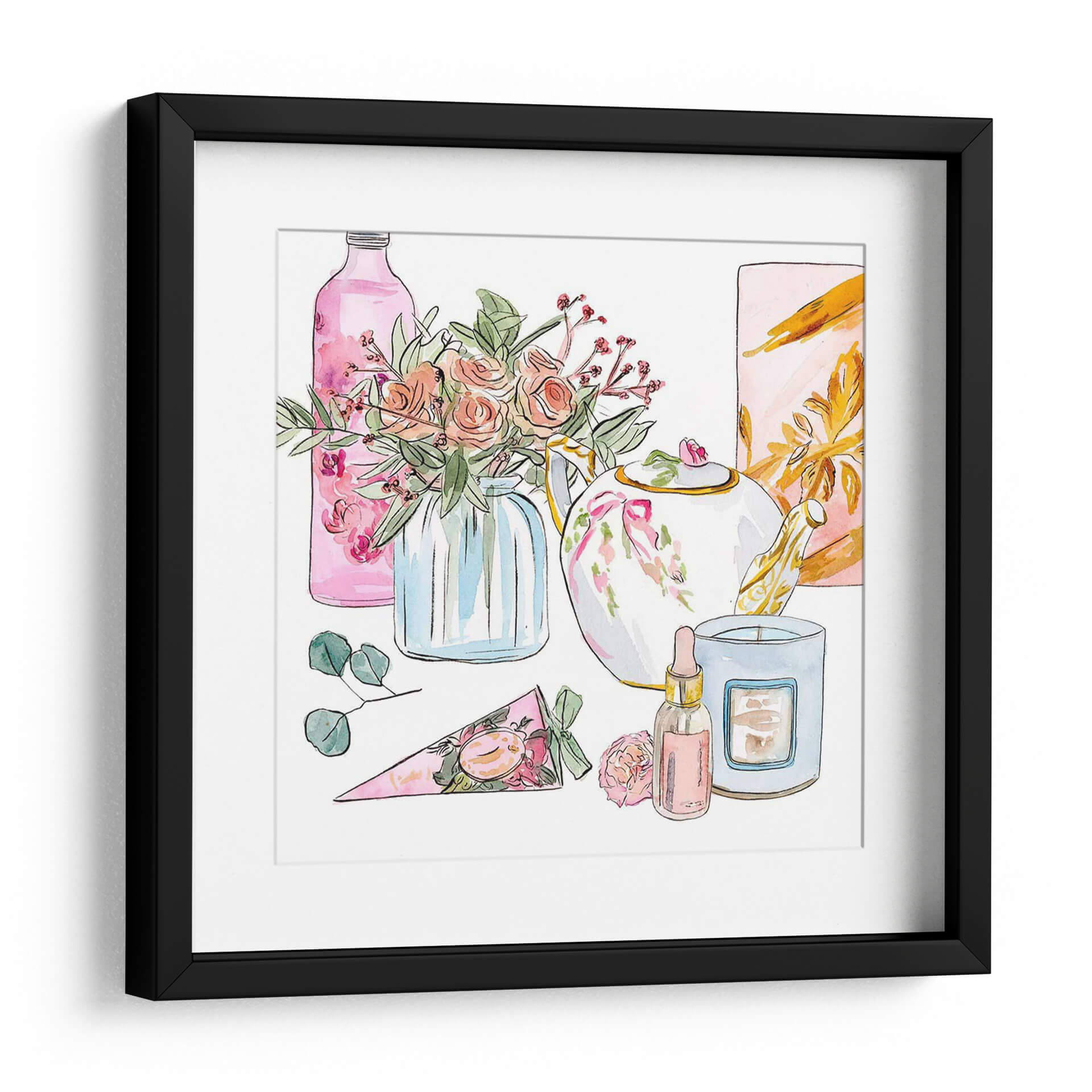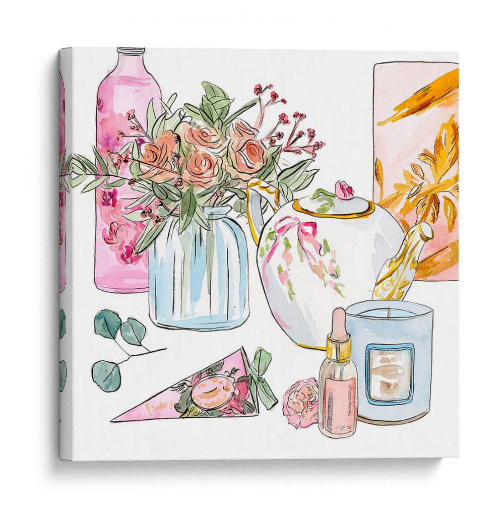 Sumérgete en la delicadeza y el encanto de 'Mañana Glamour II', una obra de arte que captura la esencia de un ritual matutino lleno de elegancia y serenidad. Esta pieza, creada por la talentosa artista Melissa Wang, presenta una composición encantadora de elementos cotidianos transformados en un festín visual. La paleta de colores se centra en tonos pastel suaves, con rosas empolvados, verdes frescos y acentos dorados que aportan un toque de sofisticación. Observa el delicado arreglo floral en un jarrón de cristal azul, la tetera adornada con un lazo rosa, y una vela aromática junto a un frasco de perfume, todos representados con trazos de acuarela etéreos que infunden una sensación de calma y ligereza. El estilo, que combina lo figurativo con una ejecución suelta y expresiva, evoca una atmósfera de tranquilidad y placer sensorial. 'Mañana Glamour II' es ideal para añadir un toque de dulzura y estilo a tu dormitorio, un tocador o cualquier espacio que busque una dosis de elegancia relajada. Este cuadro decorativo no solo embellece tu hogar, sino que también inspira momentos de paz y disfrute personal, convirtiéndose en un punto focal encantador y lleno de gracia.