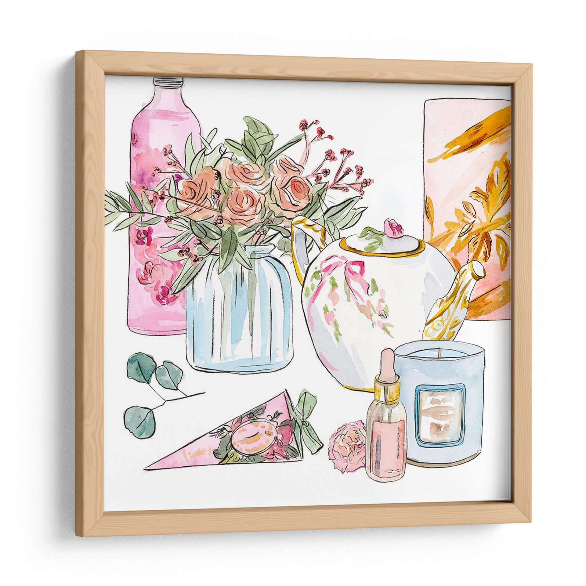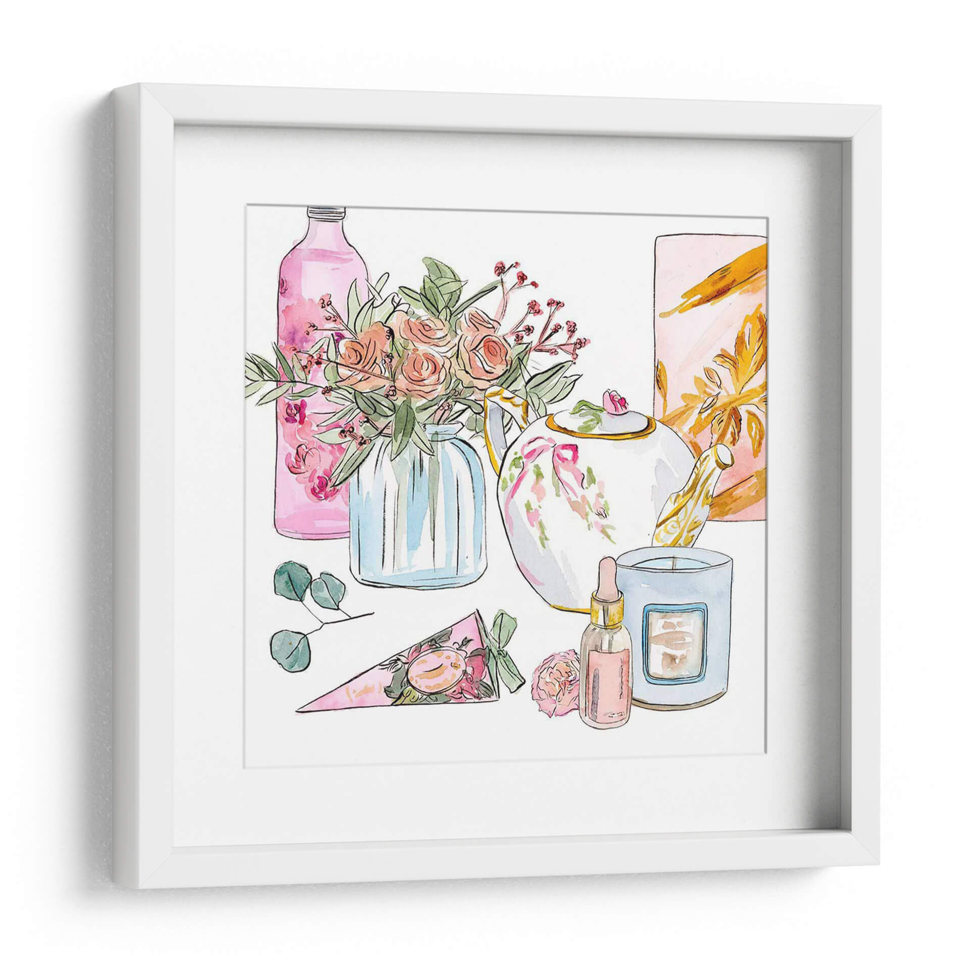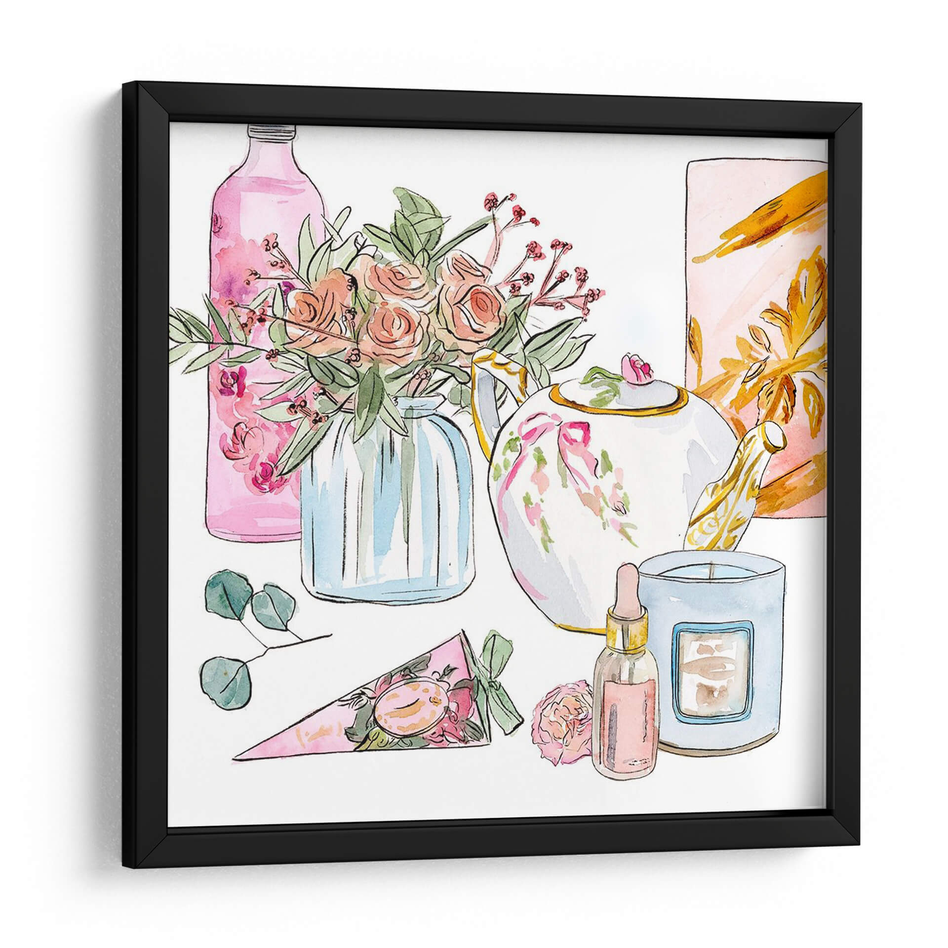 Sumérgete en la delicadeza y el encanto de 'Mañana Glamour II', una obra de arte que captura la esencia de un ritual matutino lleno de elegancia y serenidad. Esta pieza, creada por la talentosa artista Melissa Wang, presenta una composición encantadora de elementos cotidianos transformados en un festín visual. La paleta de colores se centra en tonos pastel suaves, con rosas empolvados, verdes frescos y acentos dorados que aportan un toque de sofisticación. Observa el delicado arreglo floral en un jarrón de cristal azul, la tetera adornada con un lazo rosa, y una vela aromática junto a un frasco de perfume, todos representados con trazos de acuarela etéreos que infunden una sensación de calma y ligereza. El estilo, que combina lo figurativo con una ejecución suelta y expresiva, evoca una atmósfera de tranquilidad y placer sensorial. 'Mañana Glamour II' es ideal para añadir un toque de dulzura y estilo a tu dormitorio, un tocador o cualquier espacio que busque una dosis de elegancia relajada. Este cuadro decorativo no solo embellece tu hogar, sino que también inspira momentos de paz y disfrute personal, convirtiéndose en un punto focal encantador y lleno de gracia.
