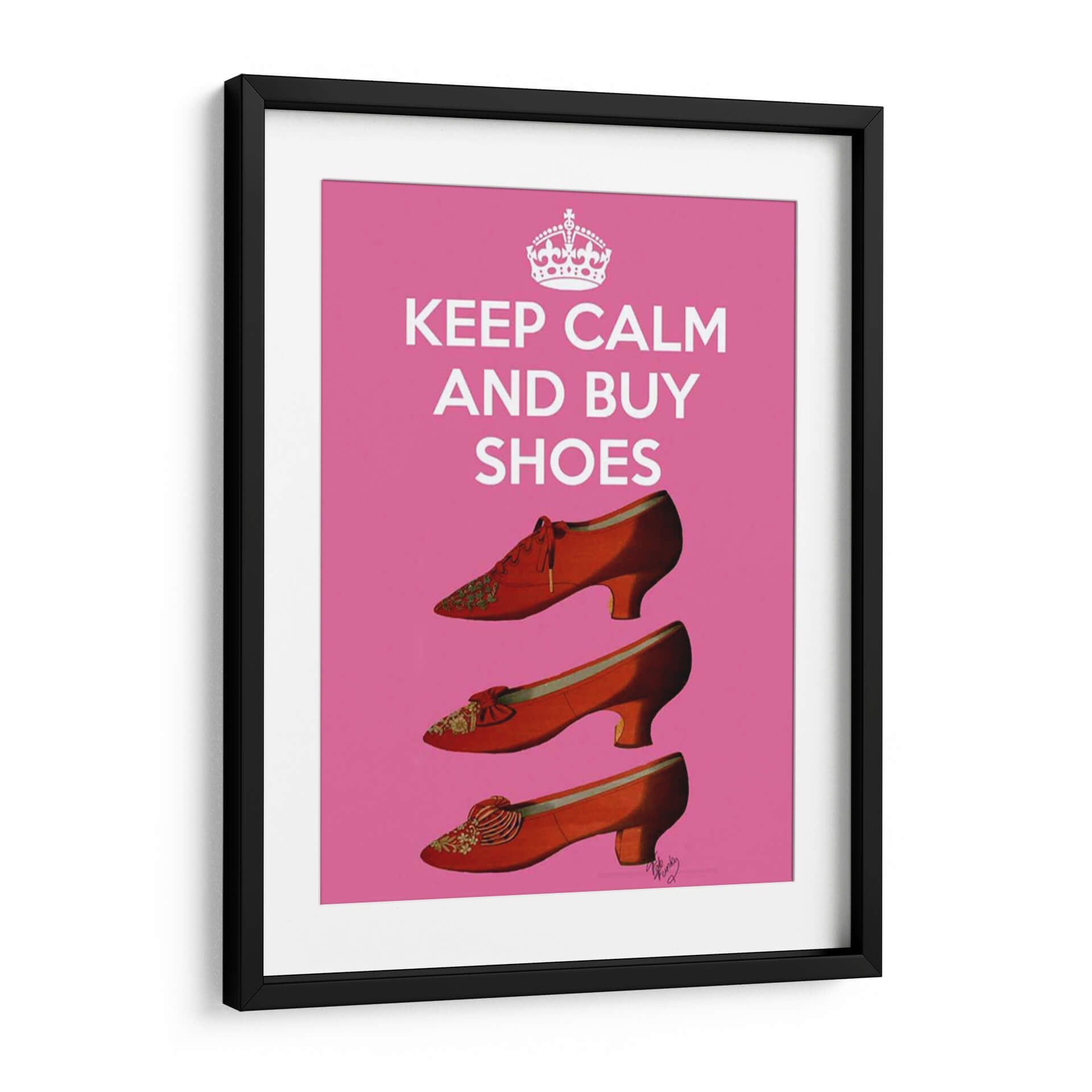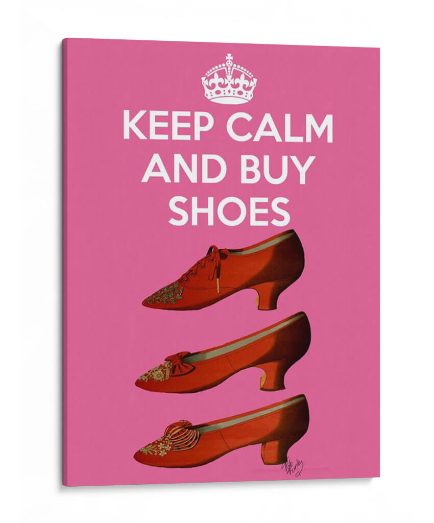Transforma tu espacio con el vibrante cuadro decorativo "Mantener La Calma Comprar Zapatos" de Fab Funky. Esta obra de arte pop, con su audaz fondo rosa chicle y una composición estilizada de tres pares de zapatos rojos vintage, irradia energía y un toque de humor chic. Cada zapato, detallado con bordados intrincados y lazos coquetos, evoca una sensación de glamour retro y la alegría de la moda. La icónica frase "Keep Calm and Buy Shoes" se presenta en letras blancas limpias, complementada por una corona estilizada, reforzando un mensaje de indulgencia y optimismo. Este cuadro es perfecto para añadir un acento de color y personalidad a cualquier habitación, desde un vestidor o dormitorio hasta una sala de estar moderna o un espacio de trabajo creativo. Su estilo pop y contemporáneo lo convierte en una pieza de conversación ideal, capaz de infundir alegría y un espíritu desenfadado en tu decoración. Un regalo excelente para los amantes de la moda y el arte, este cuadro decorativo es una invitación a celebrar la vida con estilo.