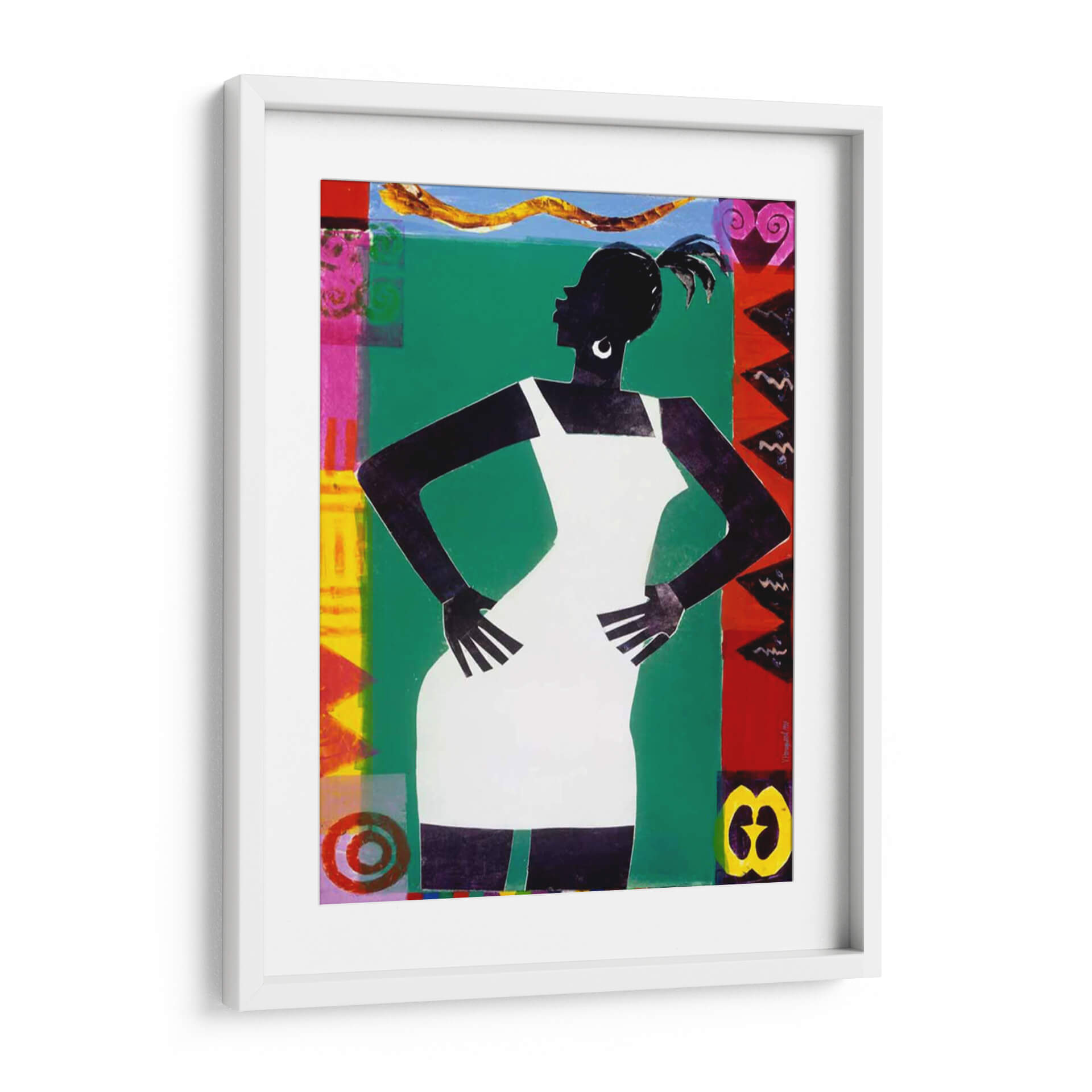 Sumérgete en la vibrante y audaz expresión artística de "Santa Zafiro" de Varnette Honeywood, una obra que captura la elegancia y la fuerza con un estilo inconfundible. Esta pieza destaca por su silueta en primer plano de una figura femenina en un vestido blanco, contrastando poderosamente con un fondo geométrico lleno de color. El verde esmeralda intenso del fondo crea una base enérgica, flanqueada por bloques de color vibrante como el fucsia, amarillo y rojo, salpicados de patrones abstractos y formas circulares que añaden textura y profundidad visual. Los bordes de la composición presentan elementos gráficos audaces, como zigzags y espirales, que invitan a la contemplación. La paleta de colores es audaz y contemporánea, combinando tonos primarios y secundarios de una manera que evoca confianza y un espíritu moderno. "Santa Zafiro" es una pieza que irradia carisma y estilo, perfecta para infundir personalidad y un toque artístico distintivo a cualquier sala de estar, estudio u oficina. Su composición estilizada y el uso de contrastes la convierten en un punto focal que inspira conversación y admiración, ideal para quienes buscan arte que celebre la identidad y la estética contemporánea.