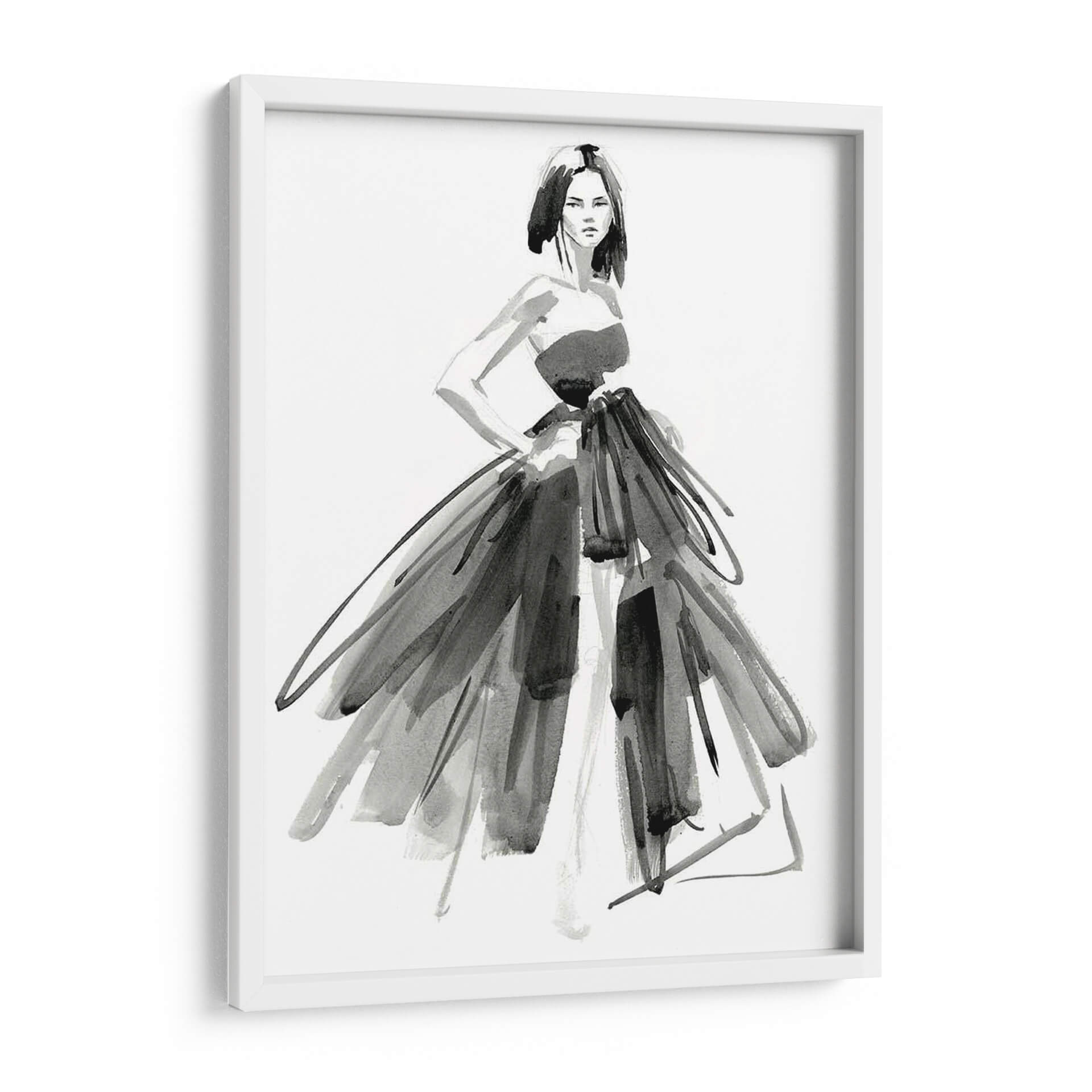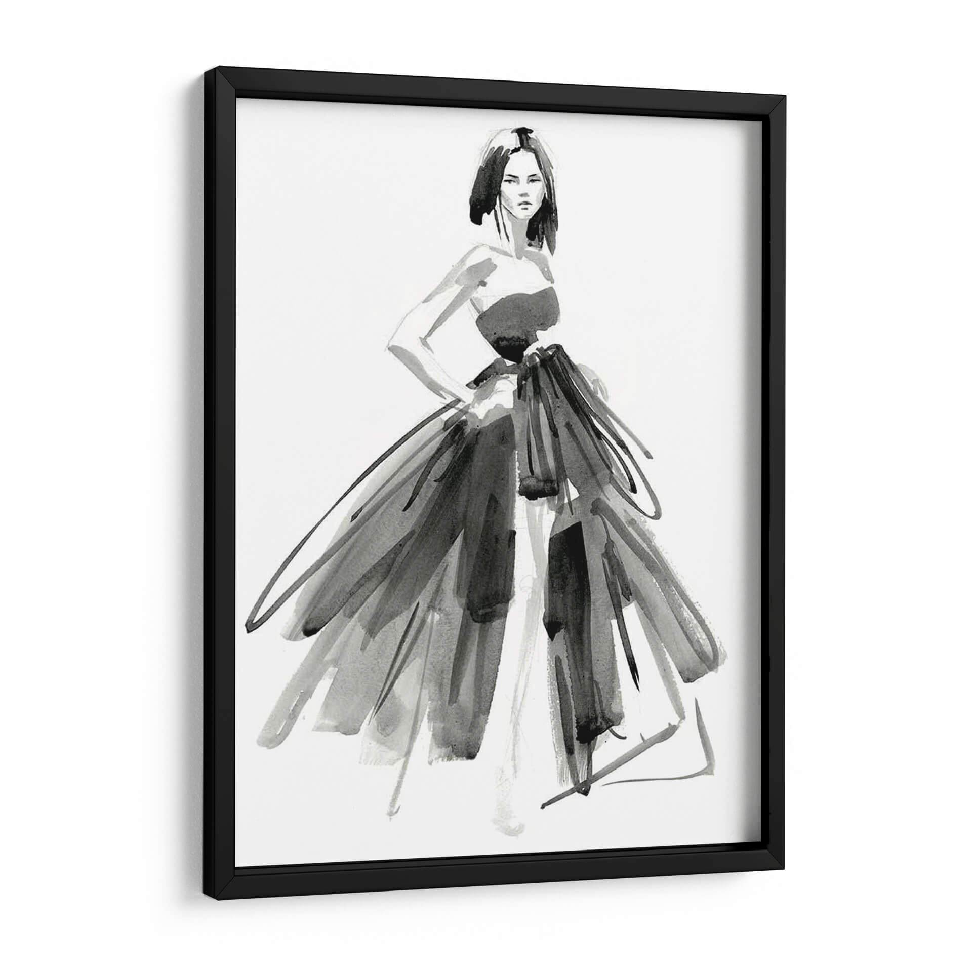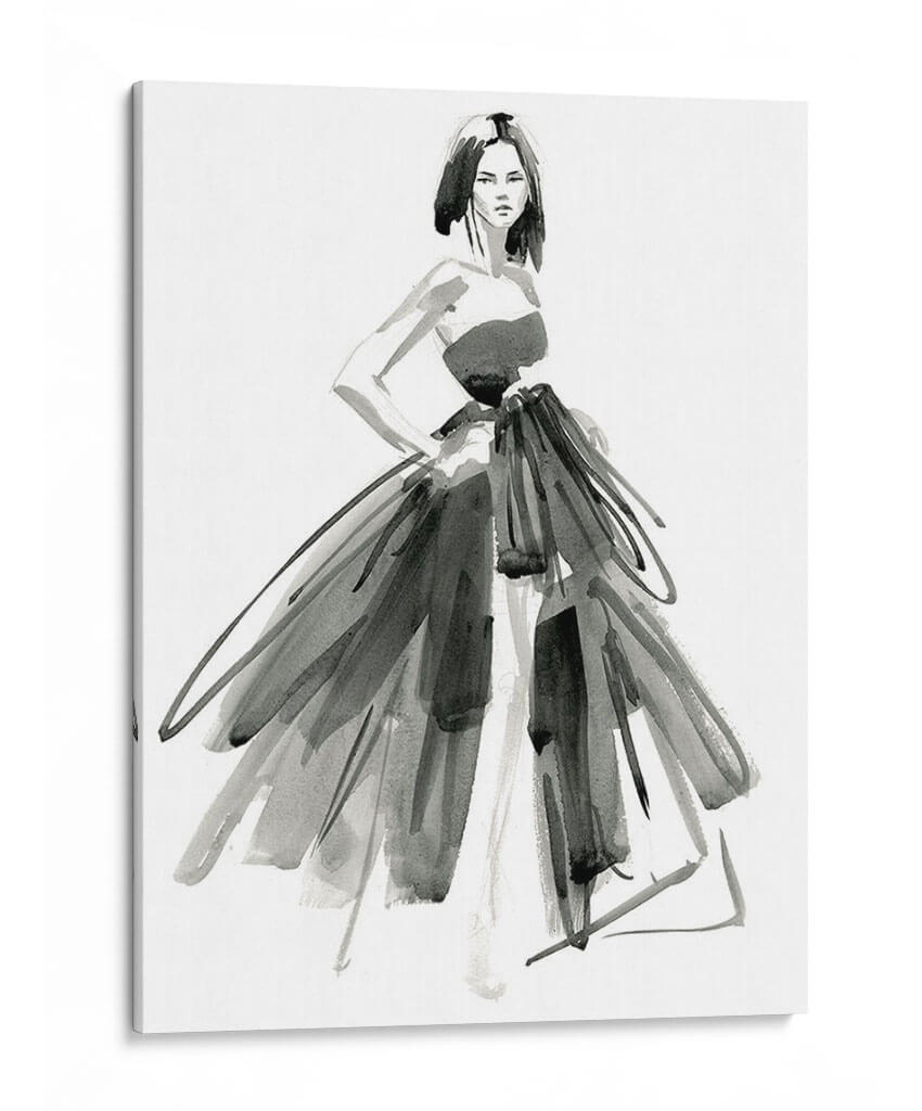 Sumérgete en la elegancia y el misterio de "Vestido De Noche Gestal I", una obra maestra del arte contemporáneo de Jennifer Paxton Parker. Esta pieza evoca la sofisticación de la alta costura a través de trazos audaces y una paleta monocromática que resalta la forma y la textura. La figura central, una mujer con una pose segura, viste un espectacular vestido que parece danzar con cada pincelada, fusionando la delicadeza de la acuarela con la fuerza expresiva del grafito. La composición, centrada en la silueta femenina y el volumen del vestido, crea un punto focal cautivador que invita a la contemplación. Ideal para espacios que buscan un toque de drama y refinamiento, como salones modernos, vestidores o estudios de moda. Este cuadro decorativo es perfecto para quienes aprecian el arte de la moda y desean incorporar una pieza de declaración en su decoración. Su estilo abstracto y gestual permite una interpretación personal, añadiendo profundidad y carácter a cualquier ambiente.