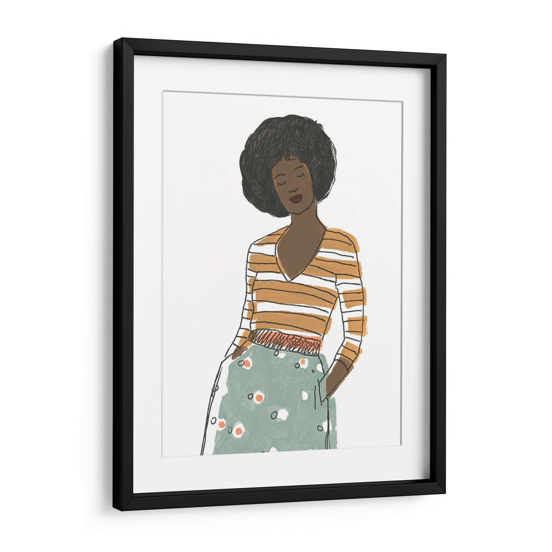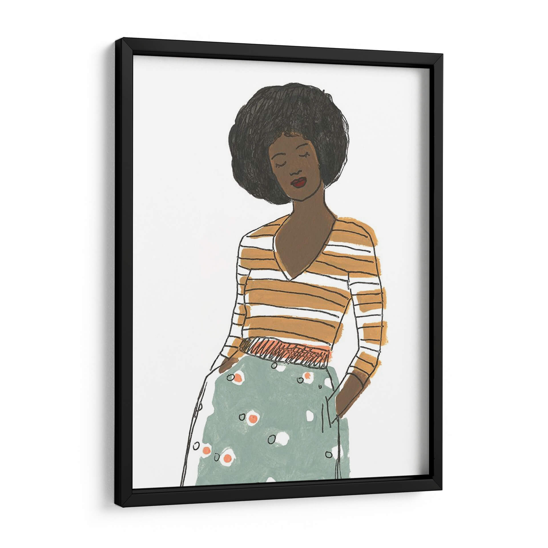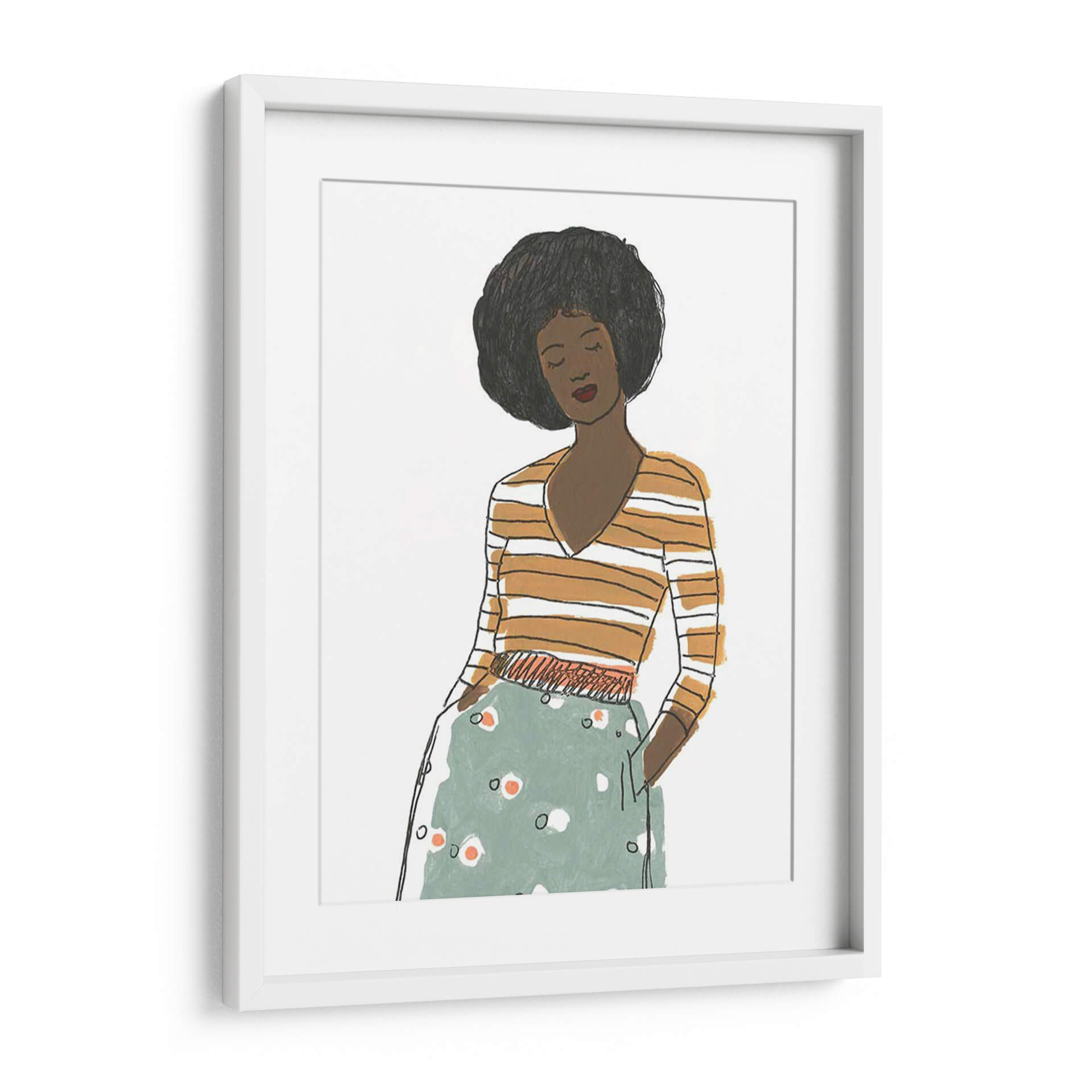 Captura la esencia de la moda y el estilo contemporáneo con "Viñeta De Moda Ii", una obra de arte que evoca la elegancia y la confianza. Este cuadro decorativo presenta una figura femenina estilizada, con una melena afro voluminosa y una expresión serena, vestida con una blusa a rayas naranjas y blancas y una falda estampada en tonos verde menta y blanco con toques anaranjados. La técnica de ilustración, con líneas sencillas pero expresivas y una paleta de colores cálidos y fríos que contrastan armoniosamente, crea una atmósfera moderna y sofisticada. La composición se centra en la figura, sugiriendo un momento de introspección o elegancia casual. "Viñeta De Moda Ii" es ideal para añadir un toque de personalidad y chic a cualquier espacio, desde un salón moderno y minimalista hasta un dormitorio acogedor o una oficina con estilo. Su diseño versátil lo convierte en un punto focal que inspira conversaciones y refleja un gusto refinado por el arte contemporáneo y la moda.