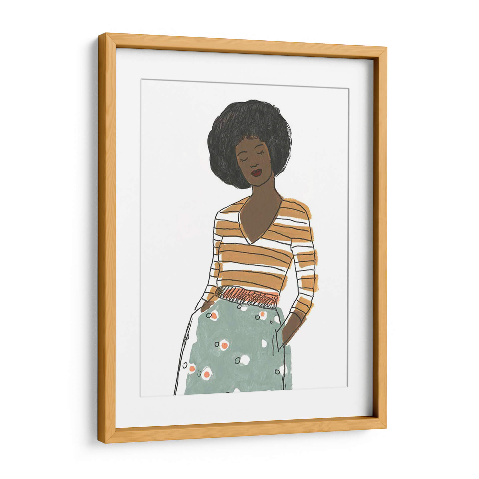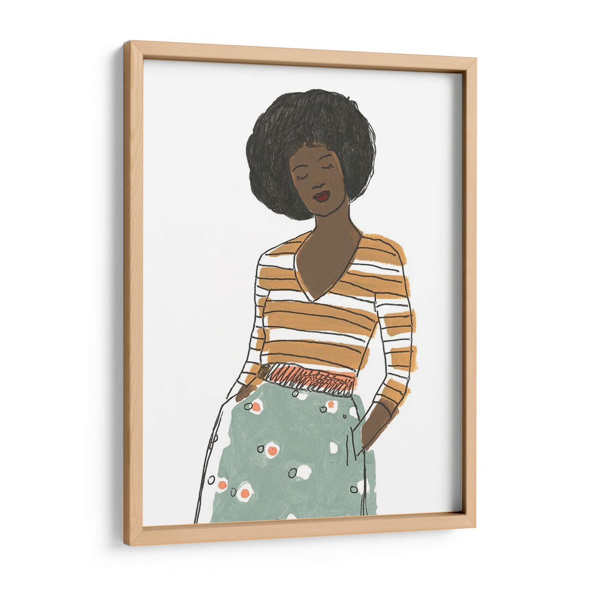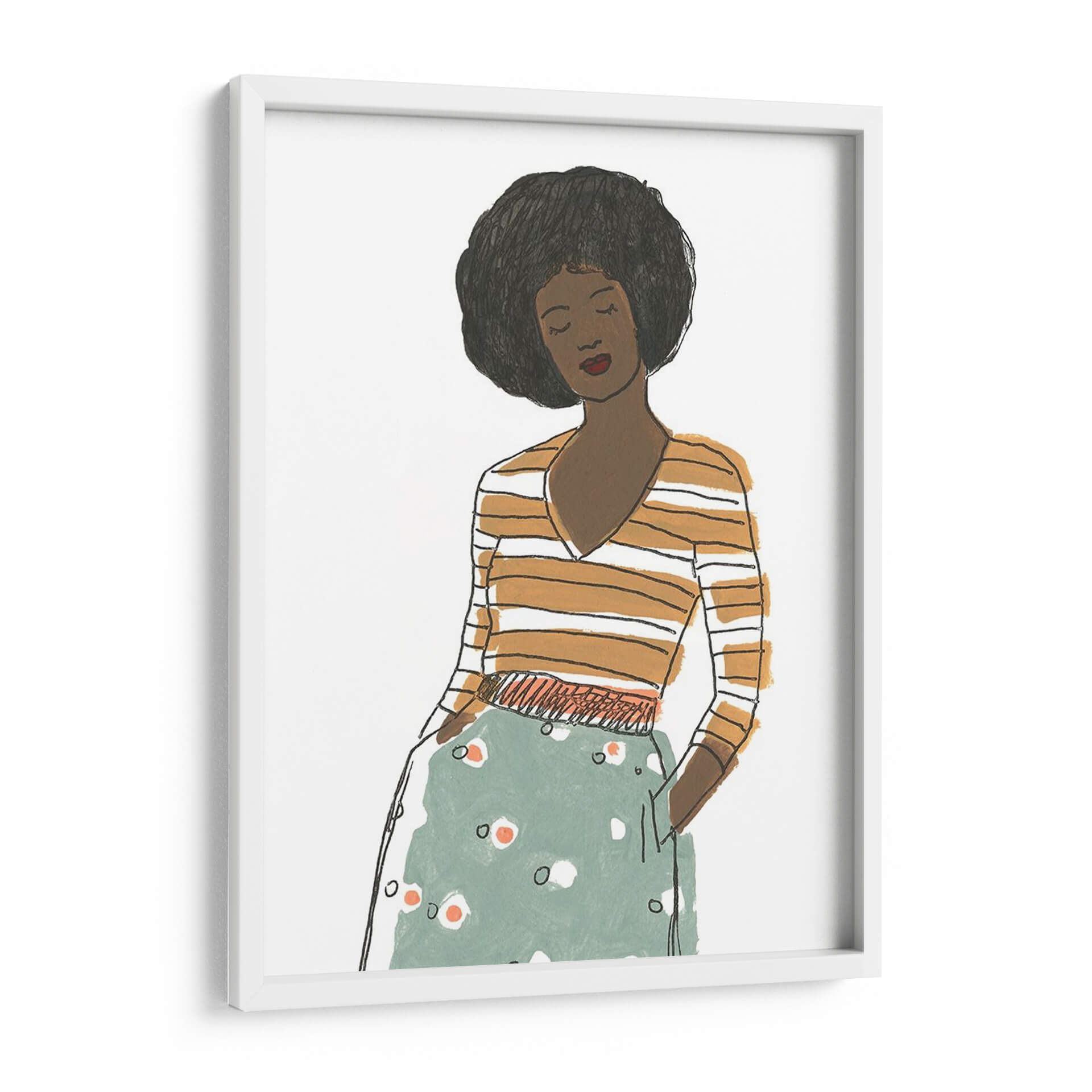Captura la esencia de la moda y el estilo contemporáneo con "Viñeta De Moda Ii", una obra de arte que evoca la elegancia y la confianza. Este cuadro decorativo presenta una figura femenina estilizada, con una melena afro voluminosa y una expresión serena, vestida con una blusa a rayas naranjas y blancas y una falda estampada en tonos verde menta y blanco con toques anaranjados. La técnica de ilustración, con líneas sencillas pero expresivas y una paleta de colores cálidos y fríos que contrastan armoniosamente, crea una atmósfera moderna y sofisticada. La composición se centra en la figura, sugiriendo un momento de introspección o elegancia casual. "Viñeta De Moda Ii" es ideal para añadir un toque de personalidad y chic a cualquier espacio, desde un salón moderno y minimalista hasta un dormitorio acogedor o una oficina con estilo. Su diseño versátil lo convierte en un punto focal que inspira conversaciones y refleja un gusto refinado por el arte contemporáneo y la moda.
