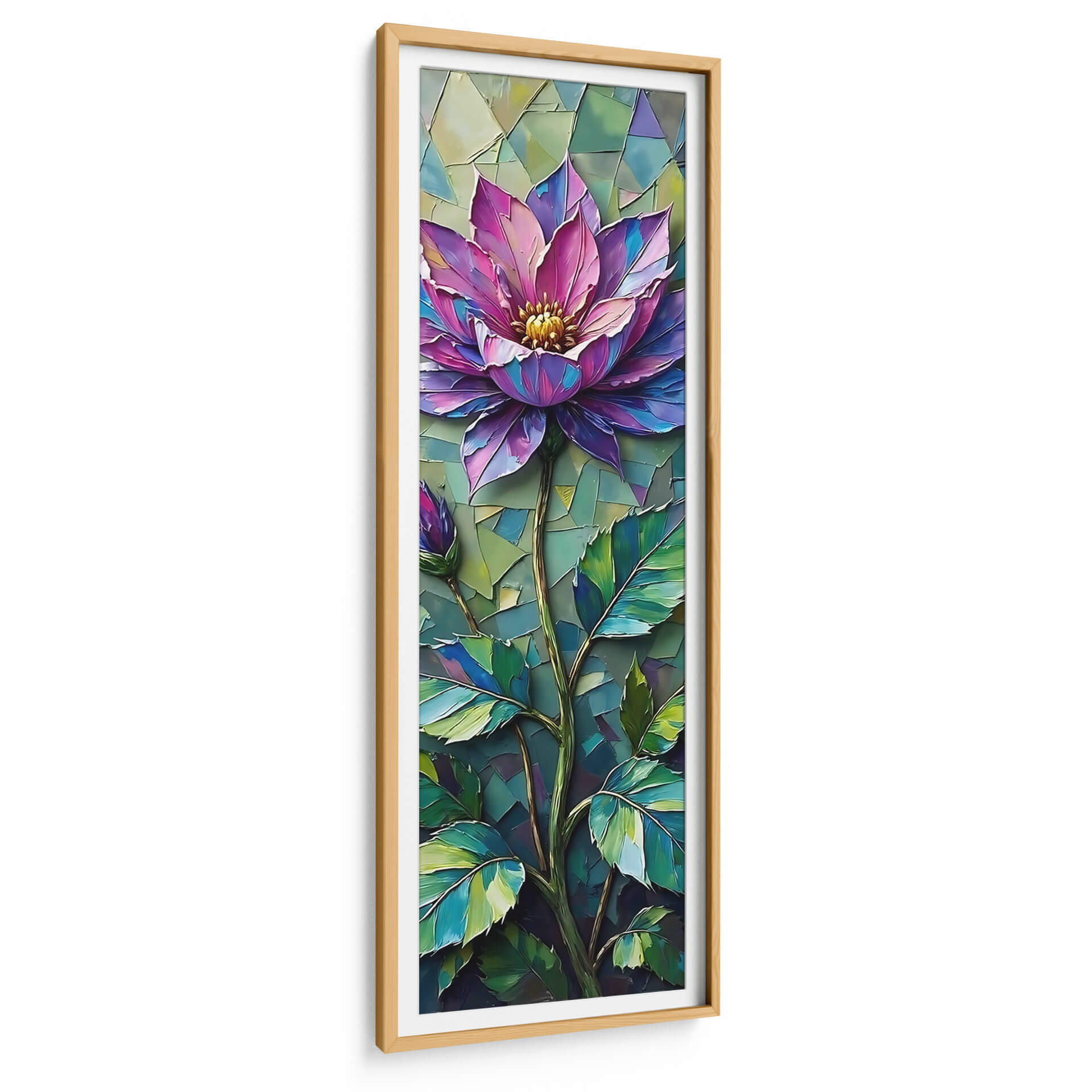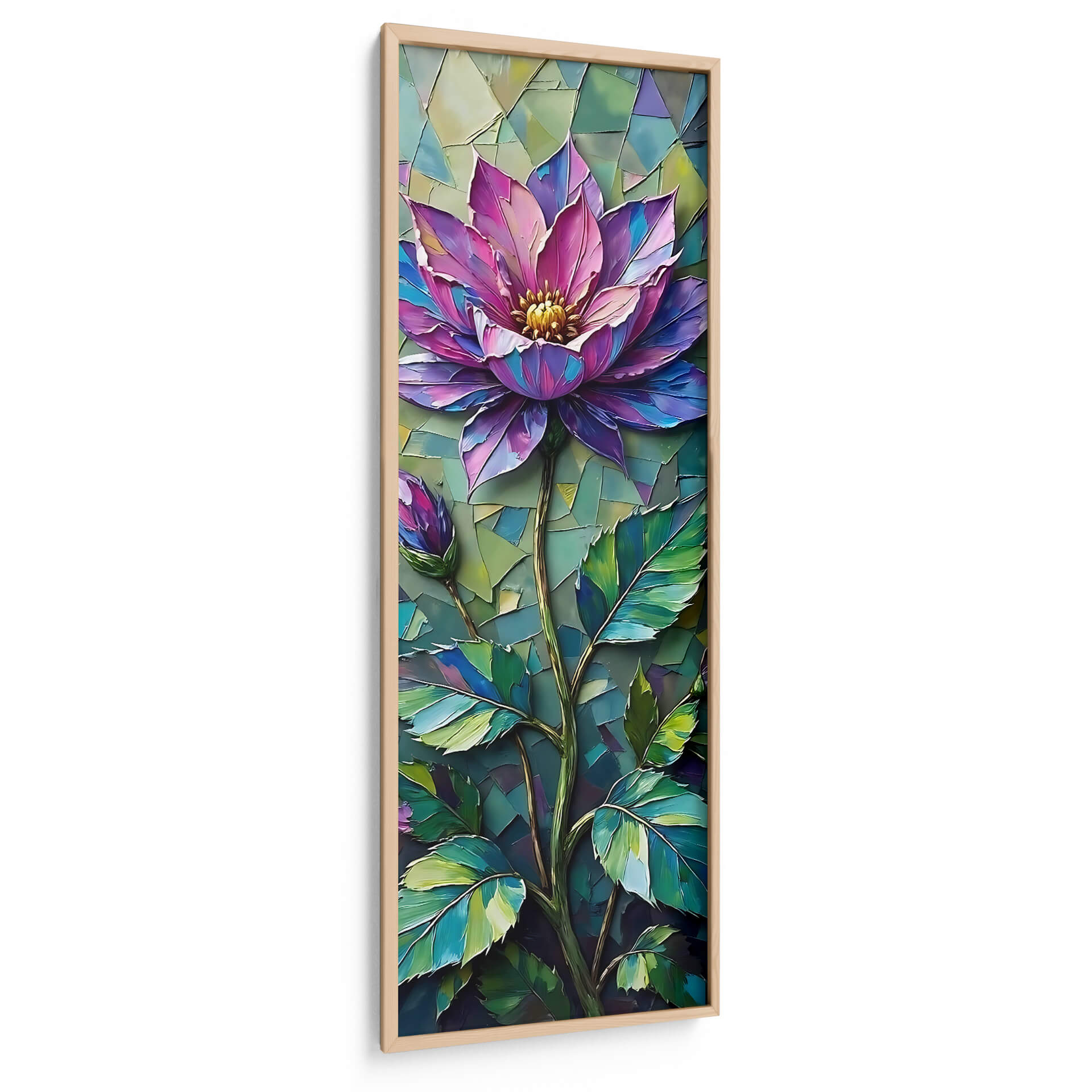 Transforma tu espacio con la vibrante obra "Joya Botánica" de Tito Massia. Este cuadro decorativo captura la esencia de una flor exótica en pleno esplendor, utilizando una paleta de colores que oscila entre el fucsia intenso, el púrpura profundo y toques de azul eléctrico, contrastando armoniosamente con el verdor exuberante de sus hojas y un fondo texturizado que evoca un mosaico orgánico. La técnica pictórica, con sus pinceladas audaces y empastes que sugieren volumen, dota a la pieza de una energía palpable y una sensación de movimiento. La composición vertical centra la atención en la majestuosidad de la flor principal y un capullo en ciernes, simbolizando el crecimiento y la belleza efímera. "Joya Botánica" es ideal para infundir vida y sofisticación en cualquier habitación; ya sea como punto focal en una sala de estar moderna, un toque de color en una oficina o un elemento de serenidad en un dormitorio. Este cuadro abstracto floral moderno no solo embellecerá tus paredes, sino que también inspirará conversaciones y añadirán una dimensión artística única a tu decoración. Descubre la magia de las flores a través de la visión de Tito Massia y eleva tu hogar con arte que habla por sí mismo.