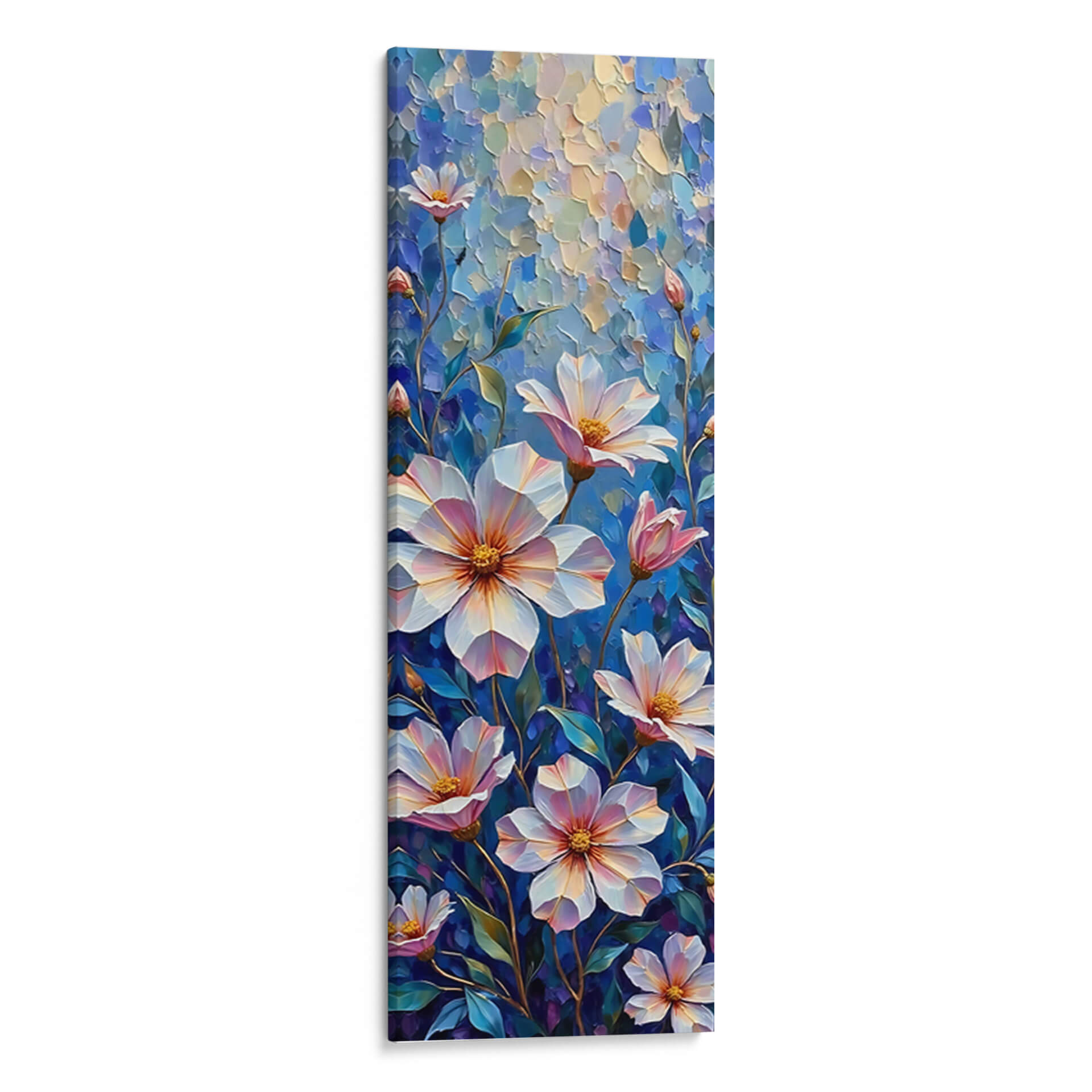 Sumérgete en la delicadeza y el vibrante encanto de "Pétalos de Luz", una obra maestra del artista Tito Massia. Este cuadro decorativo captura la esencia de las flores en plena floración, con una técnica de impasto que aporta textura y profundidad a cada pétalo. La paleta de colores se centra en tonos azules intensos que contrastan armónicamente con los blancos nacarados y rosados suaves de las flores, realzados por toques dorados y amarillos en sus centros. El fondo abstracto, compuesto por pinceladas sueltas y luminosas, evoca una sensación de luz celestial filtrándose a través de un follaje exuberante. La composición vertical resalta la elegancia natural de las flores, creando una atmósfera de serenidad y optimismo. Ideal para espacios que buscan un toque de frescura y color, como salones modernos, dormitorios acogedores u oficinas que necesiten un punto de inspiración floral. "Pétalos de Luz" no es solo una pieza decorativa, es una ventana a un jardín de ensueño, una invitación a contemplar la belleza efímera de la naturaleza con una energía renovada. Añade esta exquisita obra a tu colección y transforma tu hogar en un oasis de calma y sofisticación artística, sintiendo la caricia de la luz en cada rincón.