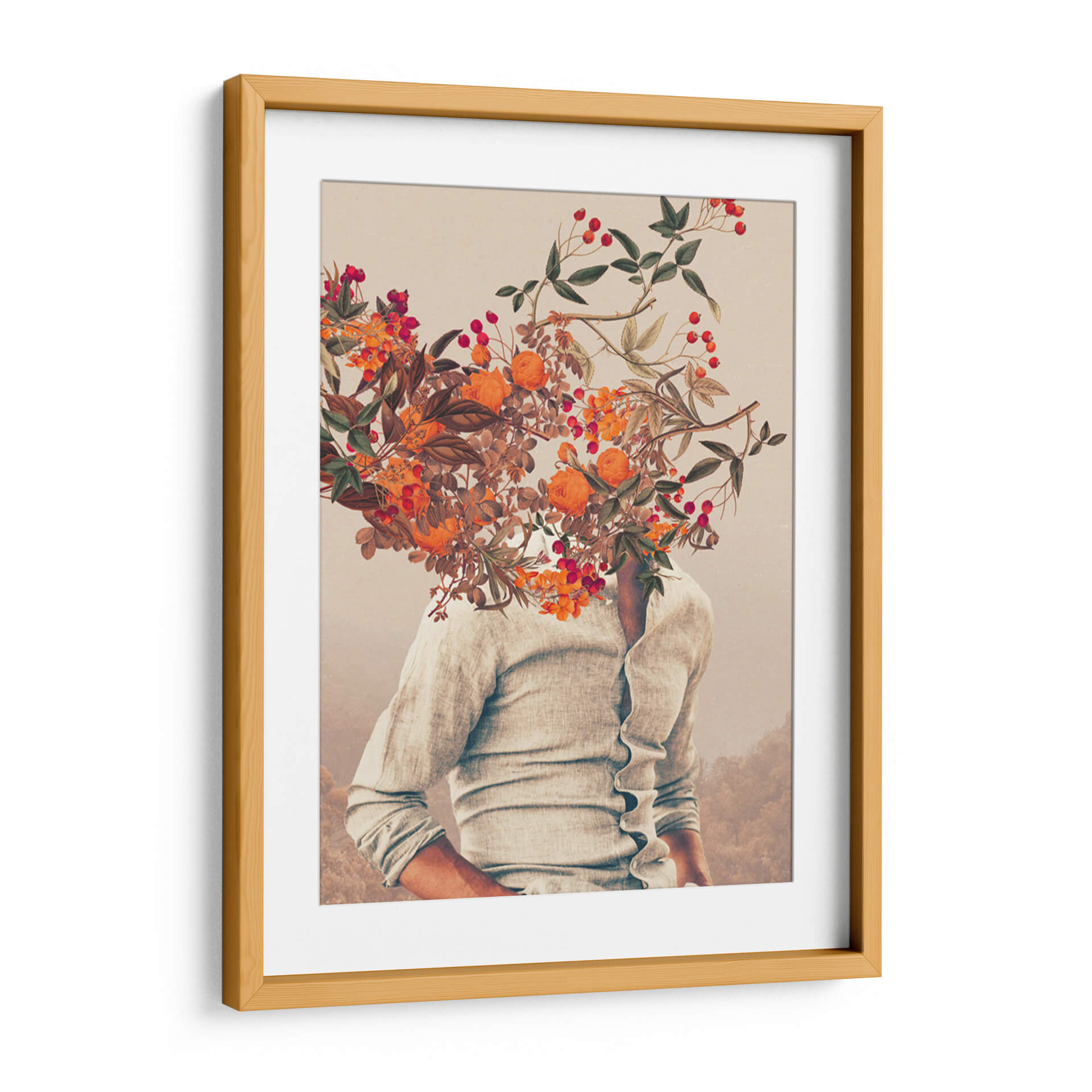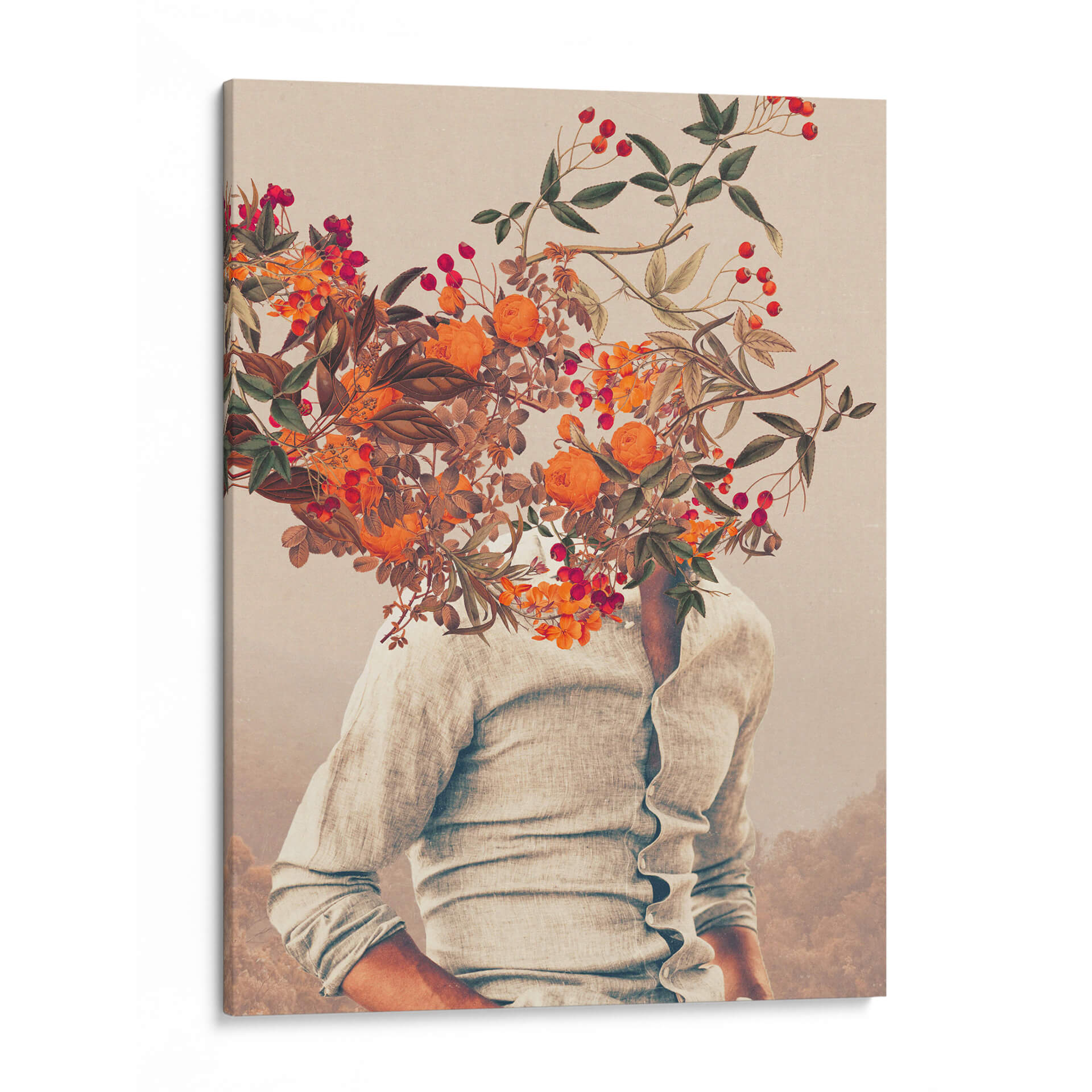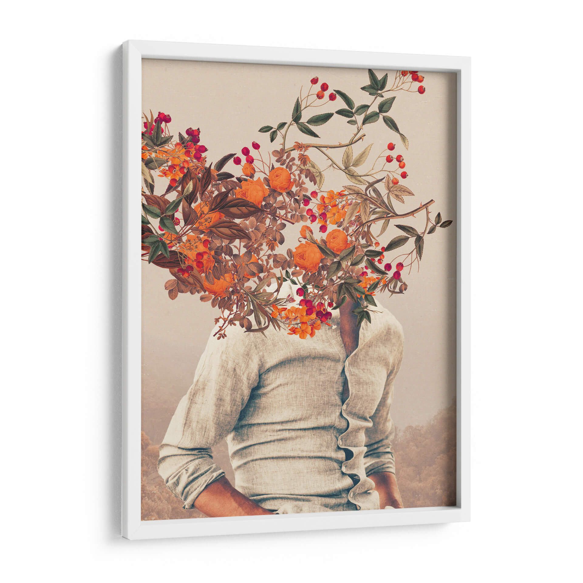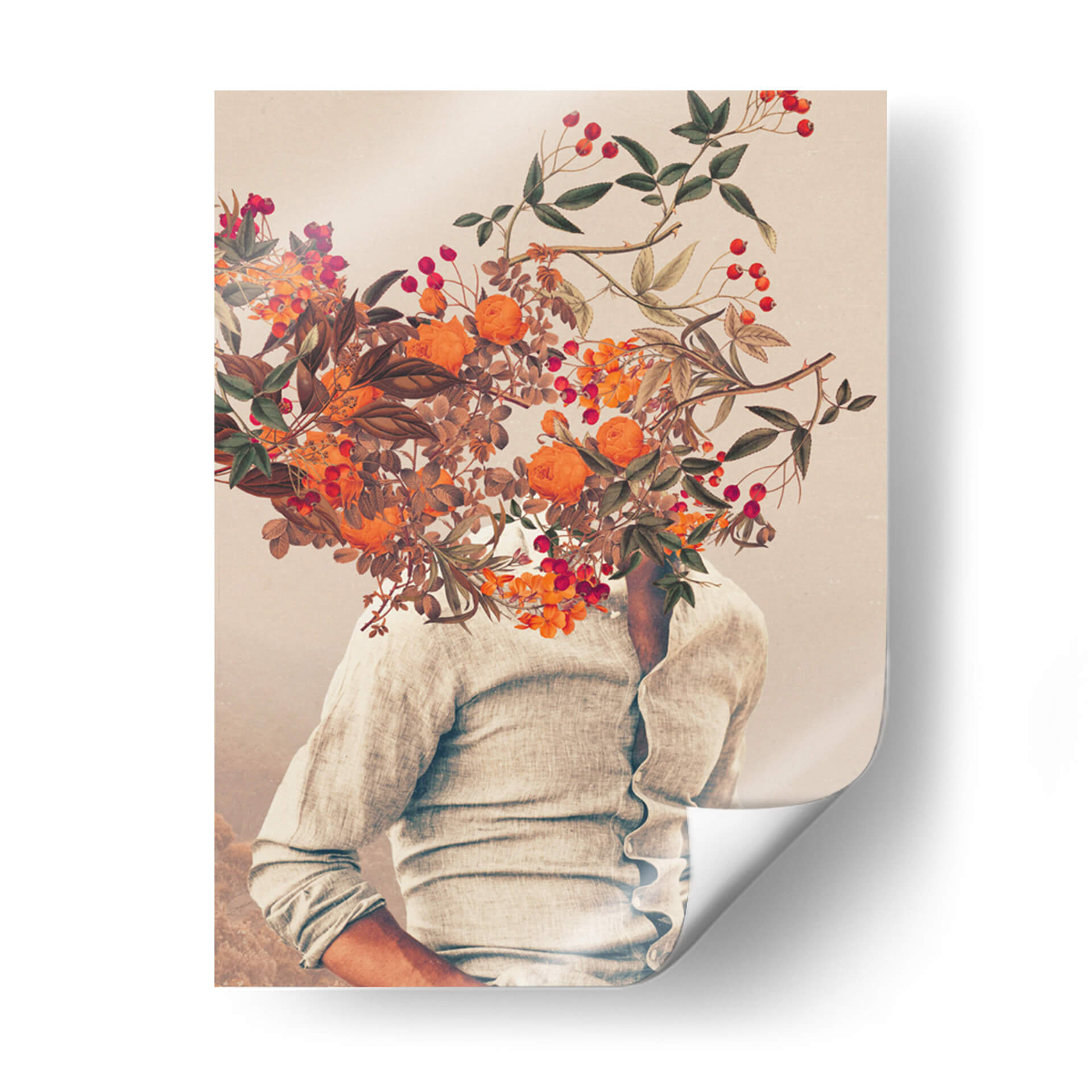 Sumérgete en la enigmática belleza de "Raíces brillantes", una obra de arte contemporáneo de Frank Moth que desafía la percepción. Esta cautivadora pieza presenta a una figura vestida con una camisa de lino claro, cuya cabeza se disuelve en una exuberante explosión de flores y bayas en tonos cálidos de naranja, rojo y verde. La composición surrealista, con un fondo difuminado que evoca paisajes etéreos, crea una atmósfera de ensueño y reflexión. Los detalles botánicos, reminiscentes de ilustraciones científicas vintage, contrastan con la abstracción de la figura, generando un diálogo fascinante entre lo natural y lo humano, lo terrenal y lo onírico. Los colores vibrantes de las flores, salpicados entre hojas secas y ramas delicadas, aportan un toque de vitalidad y misterio, mientras que la paleta general, dominada por tonos tierra y pasteles suaves, confiere una sensación de calma y nostalgia. "Raíces brillantes" es una invitación a explorar la conexión entre el ser interior y el mundo natural, perfecta para añadir un toque de originalidad y profundidad a cualquier espacio moderno, oficina o rincón de meditación. Este cuadro decorativo único se convertirá en un punto focal que invita a la contemplación y a la conversación, ideal para aquellos que buscan una decoración de pared que trascienda lo ordinario y celebre la imaginación.