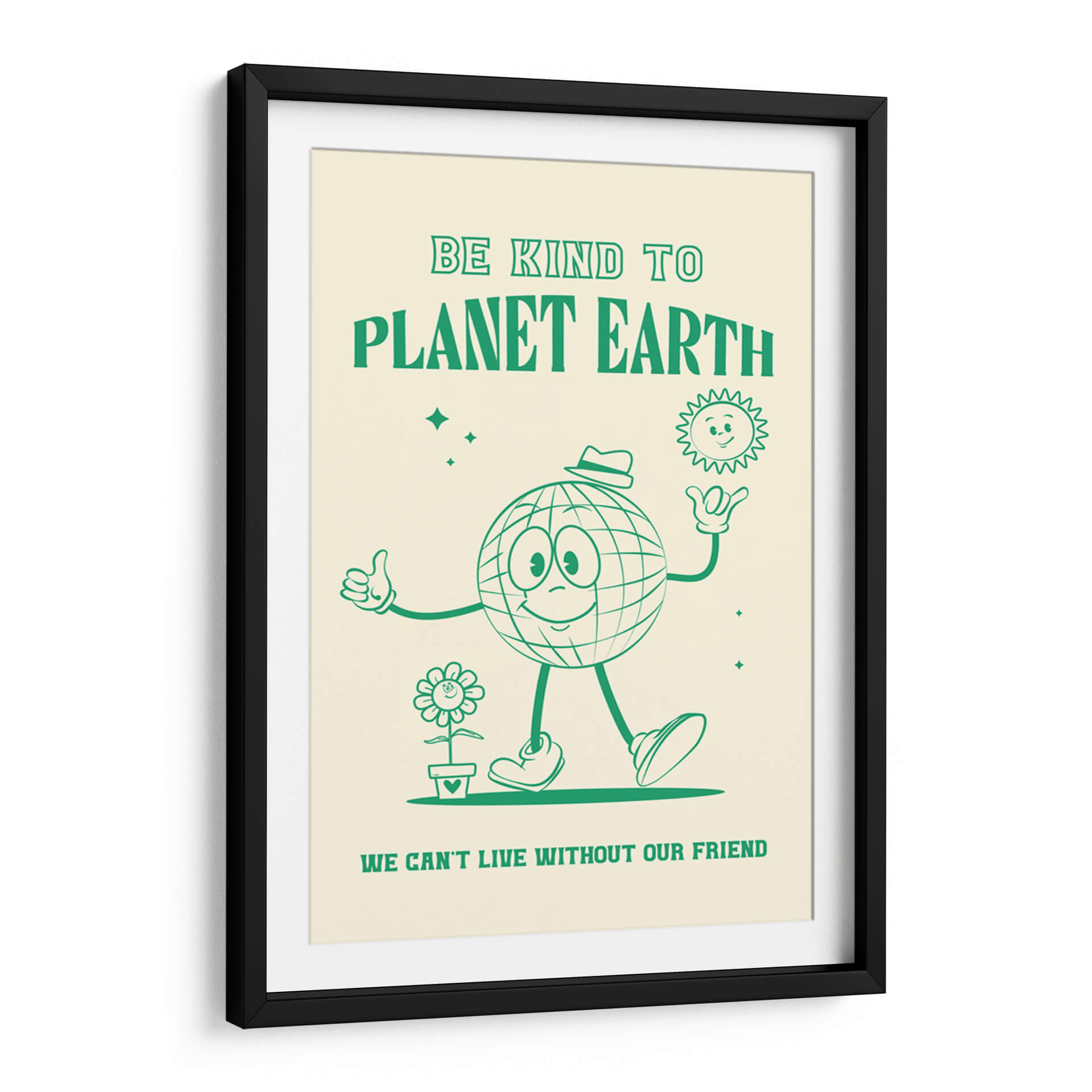 Celebra la Tierra con este cautivador cuadro decorativo, una obra de arte vibrante y llena de mensaje que inspira el cuidado de nuestro planeta. La pieza presenta una representación lúdica y simpática del planeta Tierra, adornado con un sombrero y guiñando un ojo, interactuando con un sol sonriente y una pequeña flor en una maceta, todo ello transmitiendo un sentimiento de alegría y armonía natural. El texto principal "BE KIND TO PLANET EARTH" y la frase complementaria "WE CAN'T LIVE WITHOUT OUR FRIEND" refuerzan el mensaje ecológico de manera directa y amigable. La paleta de colores se centra en tonos tierra y verde, creando una atmósfera cálida y acogedora, con un estilo gráfico distintivo que recuerda a la ilustración retro. Este cuadro decorativo es perfecto para añadir un toque de conciencia ambiental y optimismo a cualquier espacio, ya sea en una sala de estar moderna, una oficina o incluso un dormitorio infantil. Su composición equilibrada y su diseño atractivo lo convierten en una pieza versátil que fomenta la reflexión positiva y el amor por la naturaleza, ideal para quienes buscan arte con propósito y un diseño que eleve el espíritu.