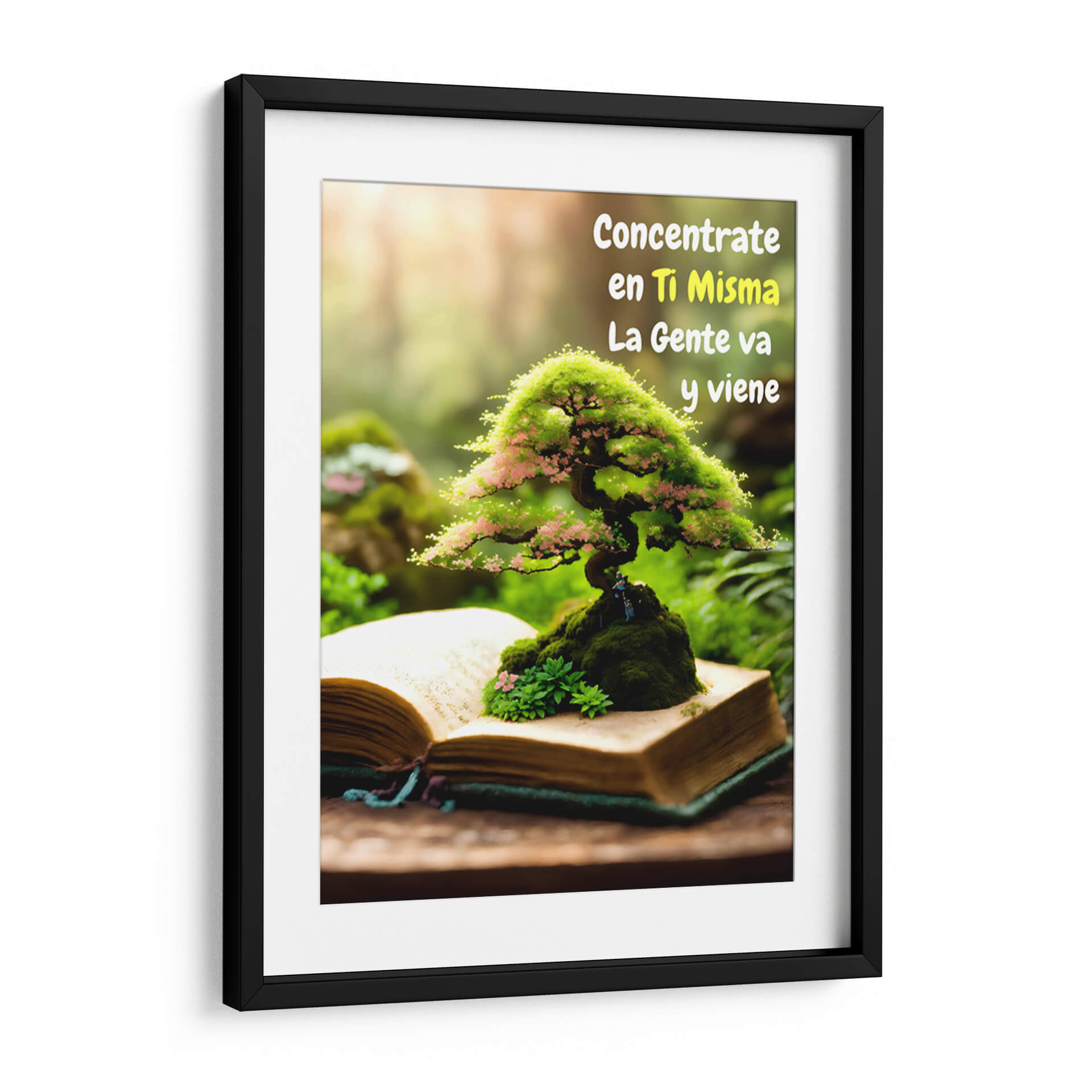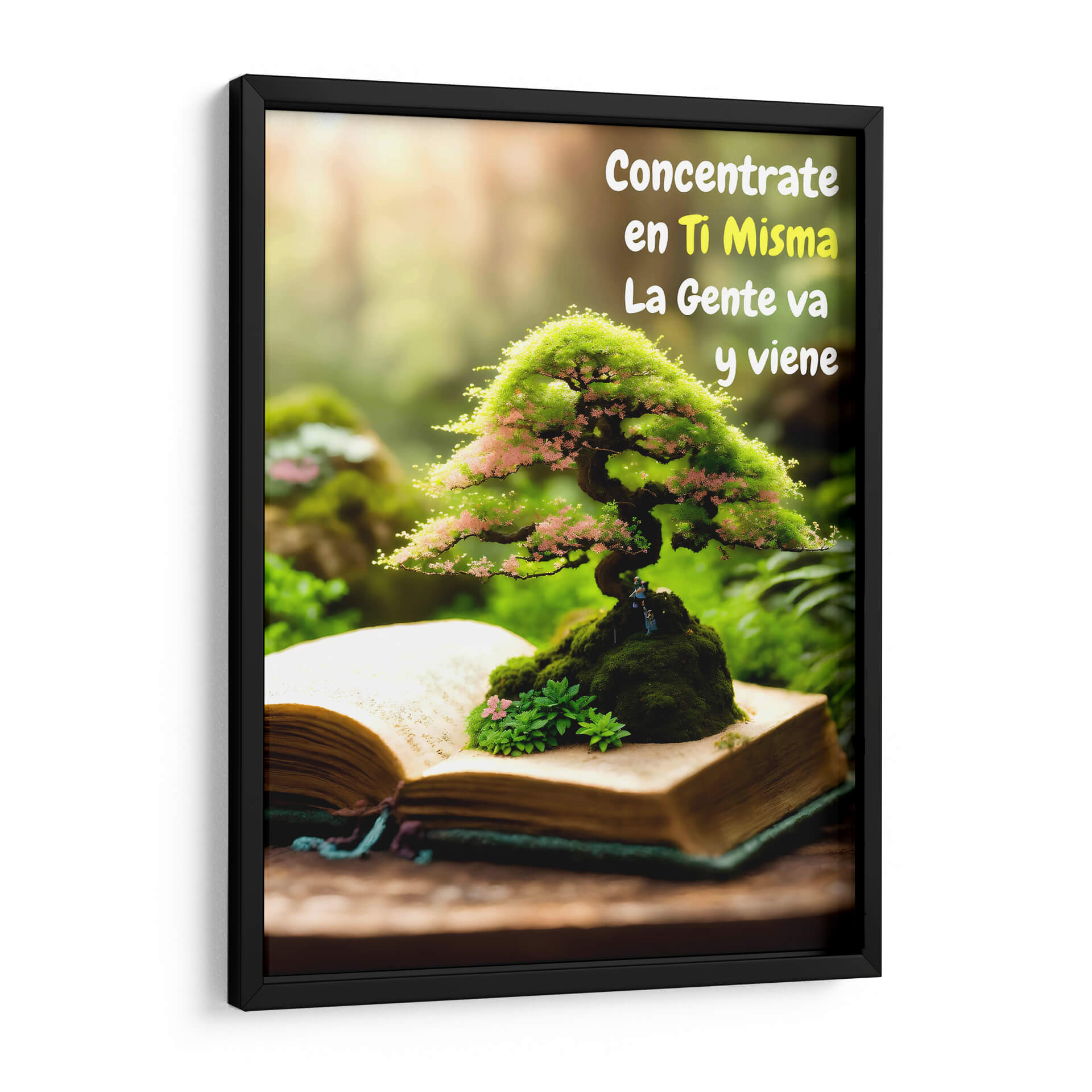 Sumérgete en la serenidad y la introspección con este cautivador cuadro decorativo, 'Concéntrate en Ti Misma, la Gente va y viene'. La obra presenta un árbol de bonsái exuberante y cubierto de musgo, adornado con delicadas flores rosadas, que emerge de un libro antiguo abierto. La composición evoca un sentido de crecimiento personal y sabiduría acumulada, con el suave bokeh del fondo verde y la luz cálida que crean una atmósfera de paz y contemplación. Este lienzo digital, con su estilo surrealista y evocador, es perfecto para aquellos que buscan un recordatorio visual para enfocarse en su propio camino y bienestar. Los tonos verdes vibrantes del follaje contrastan armoniosamente con los tonos cálidos del libro y la luz ambiental, resultando en una pieza visualmente atractiva. Ideal para tu sala de estar, dormitorio o espacio de meditación, este cuadro decorativo es una invitación a la calma interior y al autodescubrimiento, añadiendo un toque de magia y reflexión a cualquier ambiente. Transforma tu hogar en un santuario de paz y crecimiento personal con esta obra de arte única.