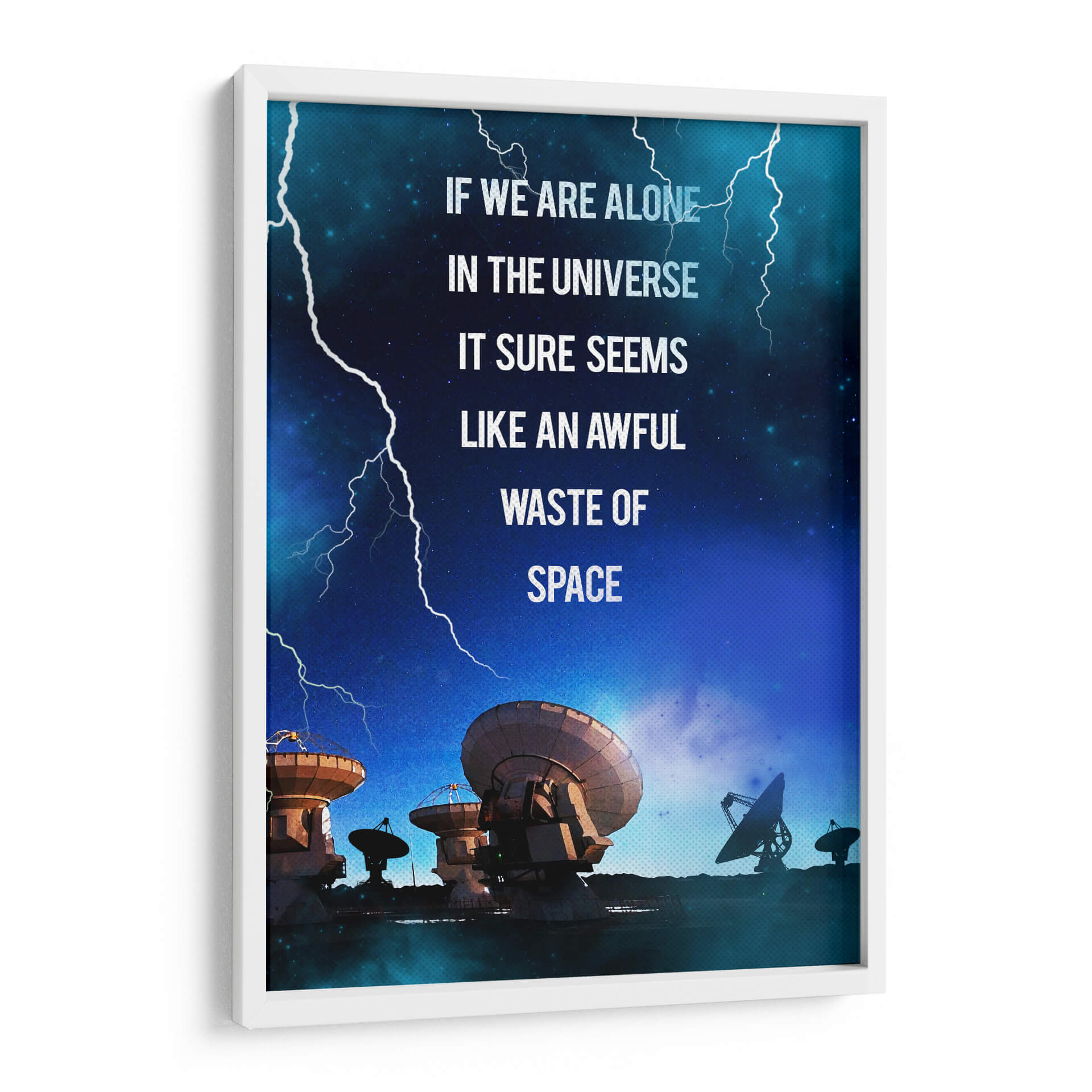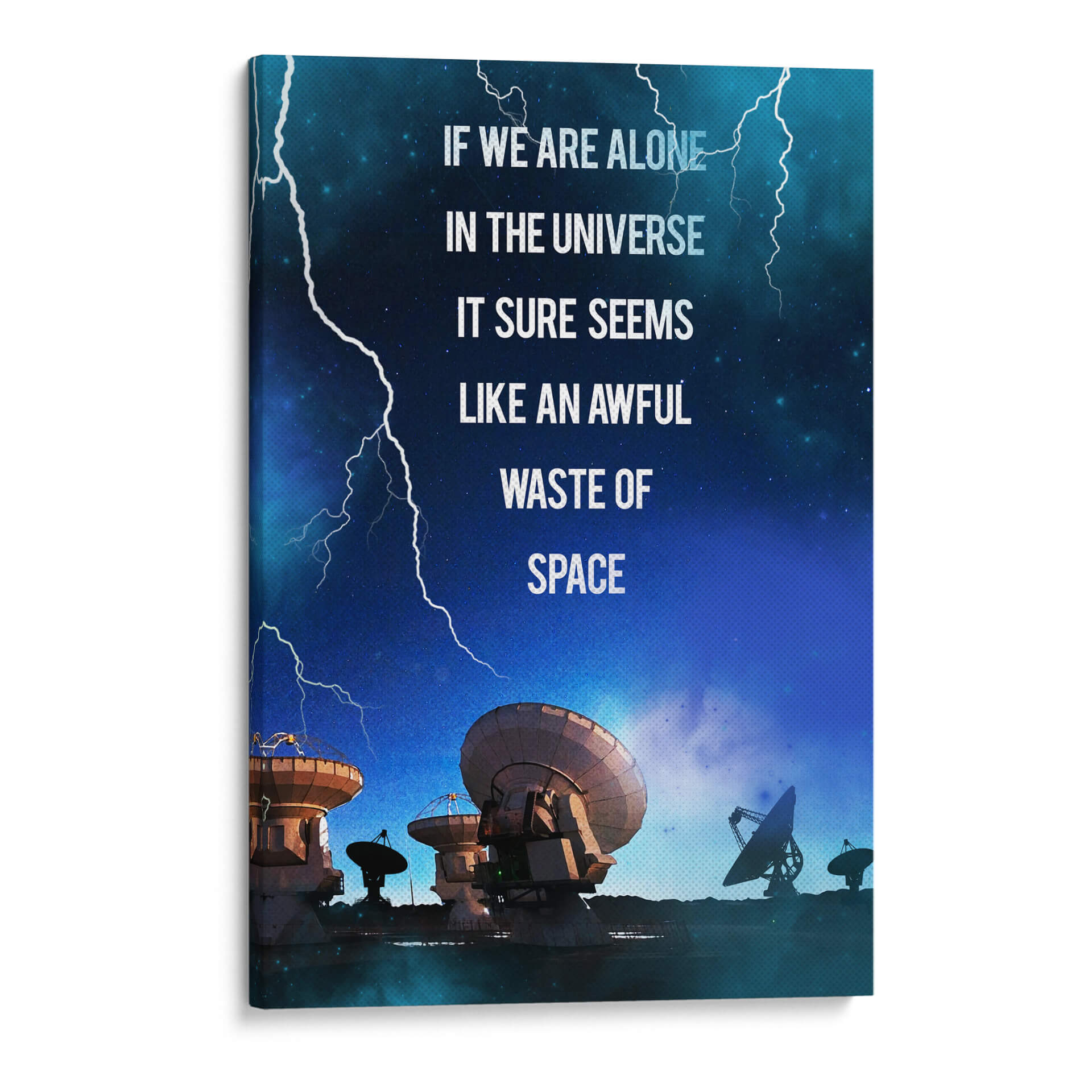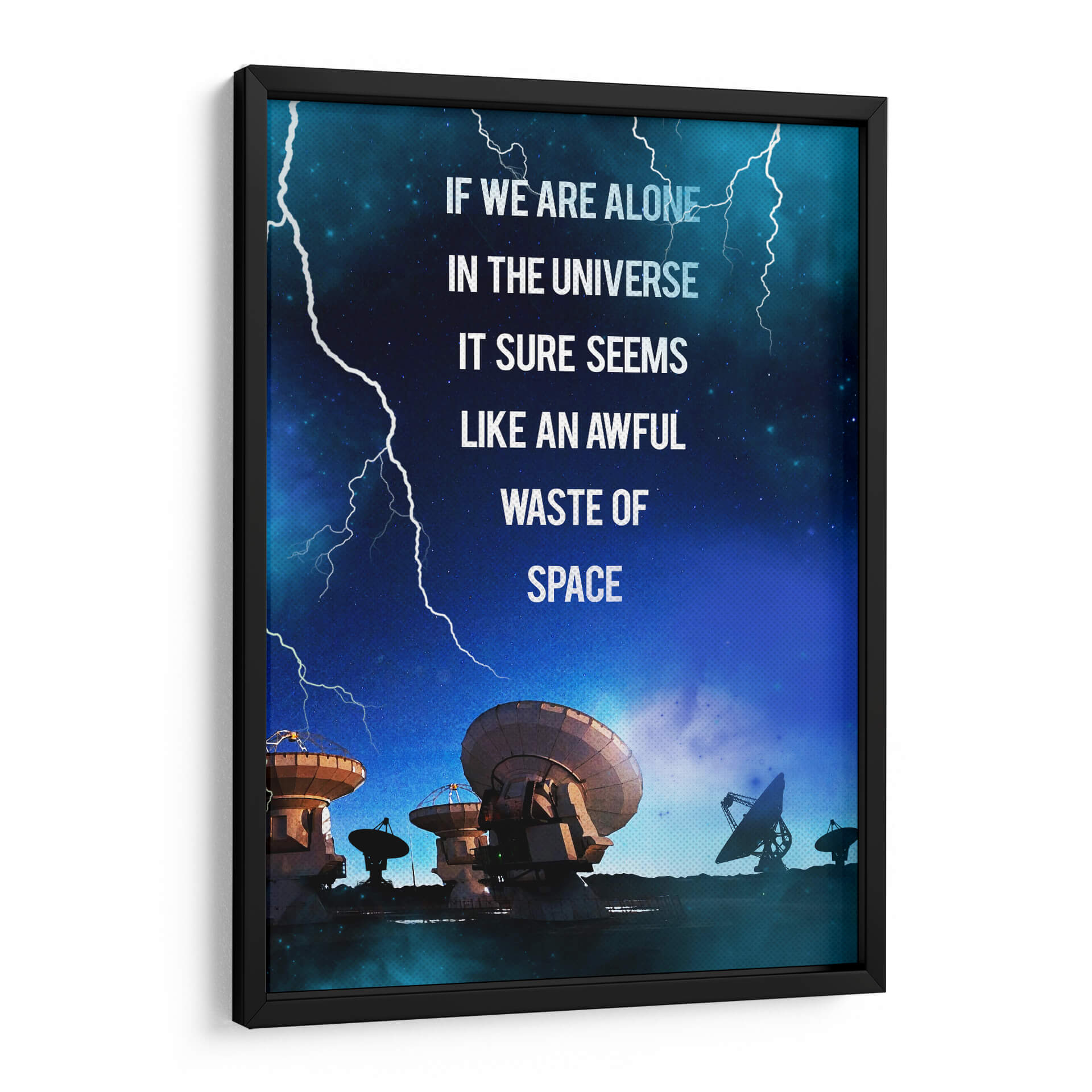 Sumérgete en las profundidades del cosmos con este impactante cuadro decorativo, "Contact Film". La obra captura una escena nocturna estrellada, dominada por el azul profundo del universo y atravesada por relámpagos blancos que añaden un toque de dramatismo. En primer plano, una serie de antenas parabólicas y radiotelescopios apuntan hacia el cielo, evocando la búsqueda de vida o señales en la inmensidad del espacio. La frase "IF WE ARE ALONE IN THE UNIVERSE IT SURE SEEMS LIKE AN AWFUL WASTE OF SPACE" (Si estamos solos en el universo, parece un terrible desperdicio de espacio) invita a la reflexión sobre nuestra existencia y el misterio que nos rodea. Ideal para amantes de la ciencia, la astronomía o aquellos que buscan una pieza de conversación para su hogar u oficina, este cuadro abstracto con toques de ciencia ficción aportará un aire de misterio y curiosidad a cualquier estancia. Su paleta de colores fríos y la composición dinámica lo convierten en un elemento decorativo moderno y con carácter, perfecto para inspirar grandes ideas y conversaciones profundas.