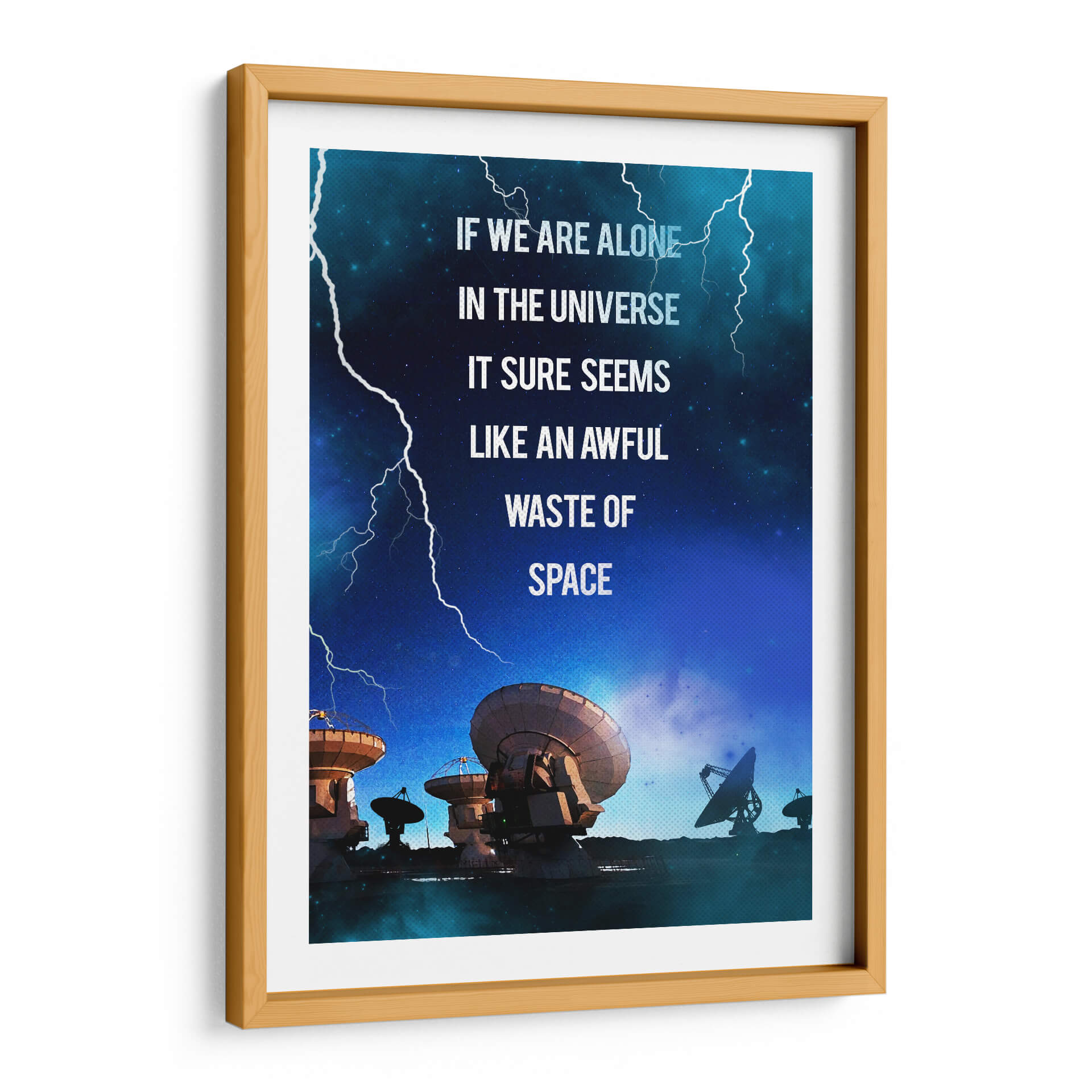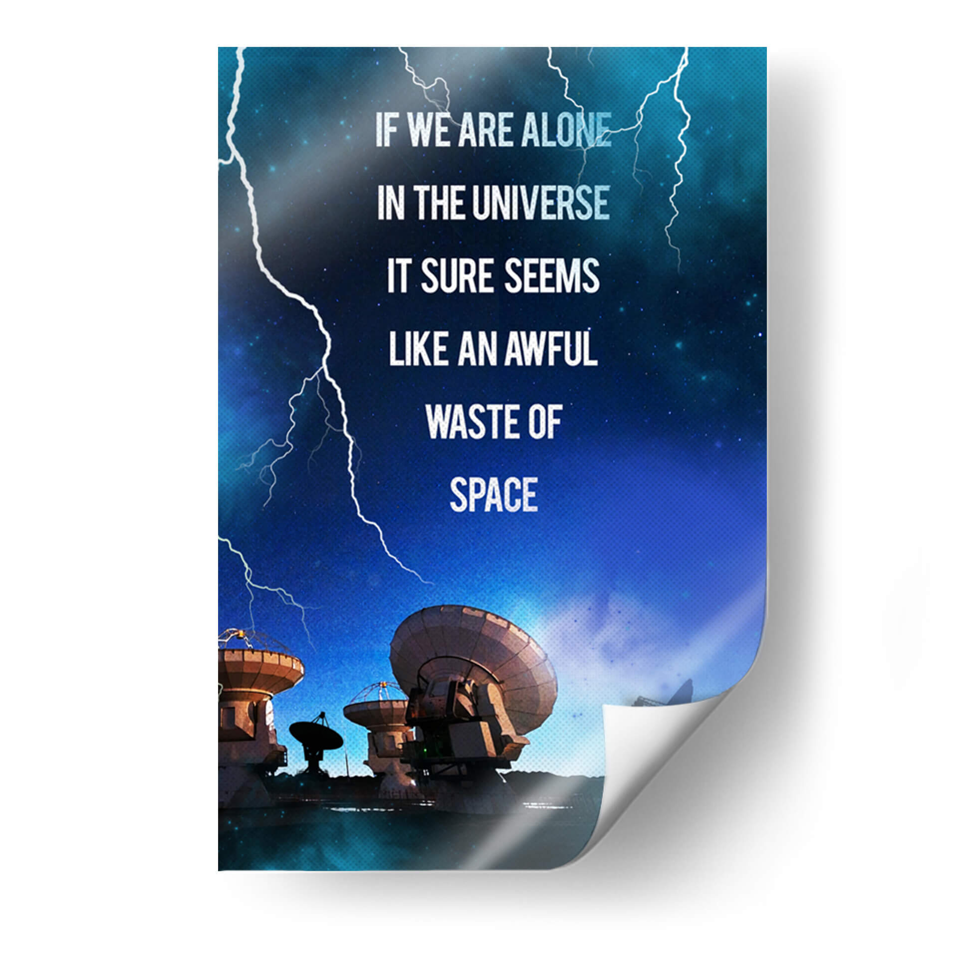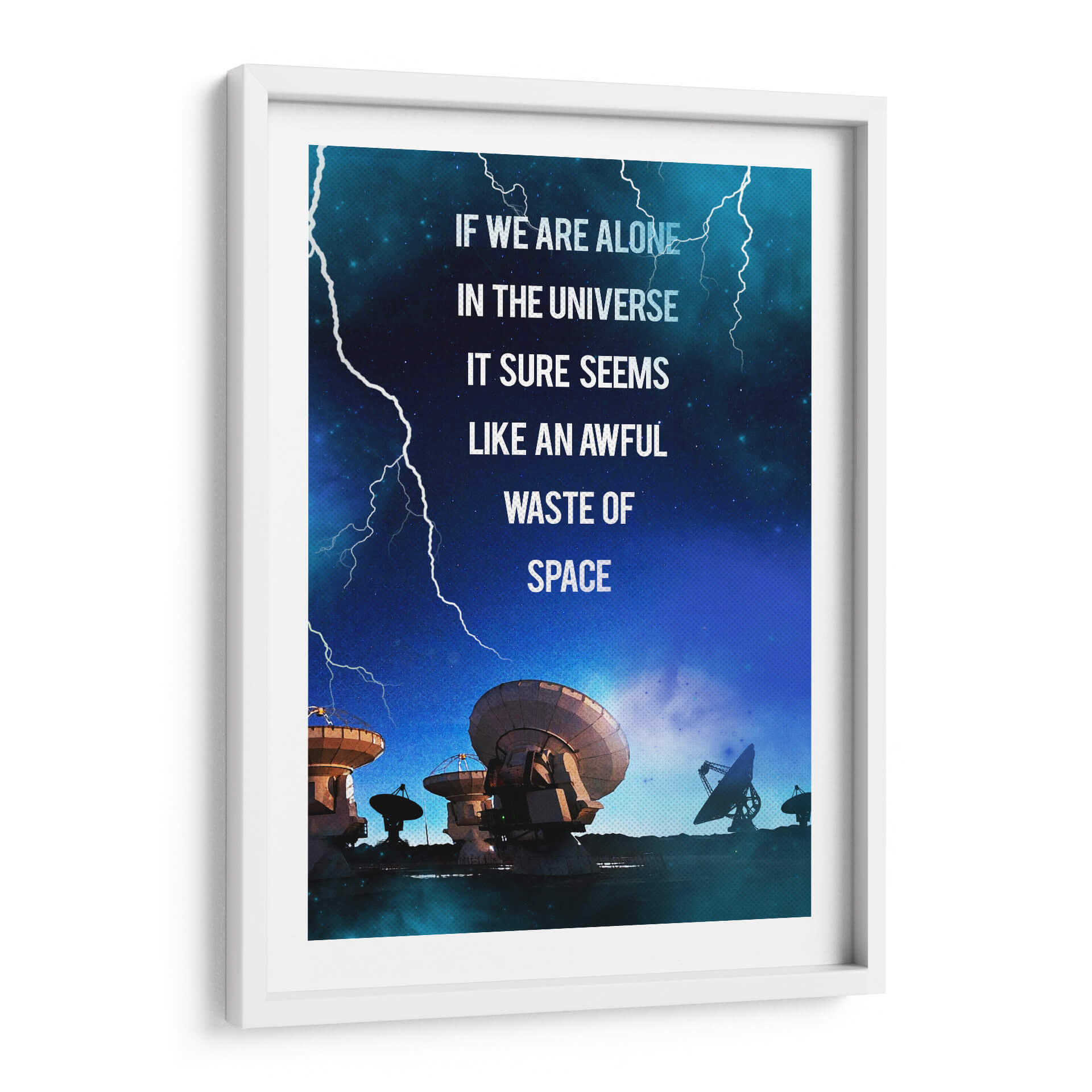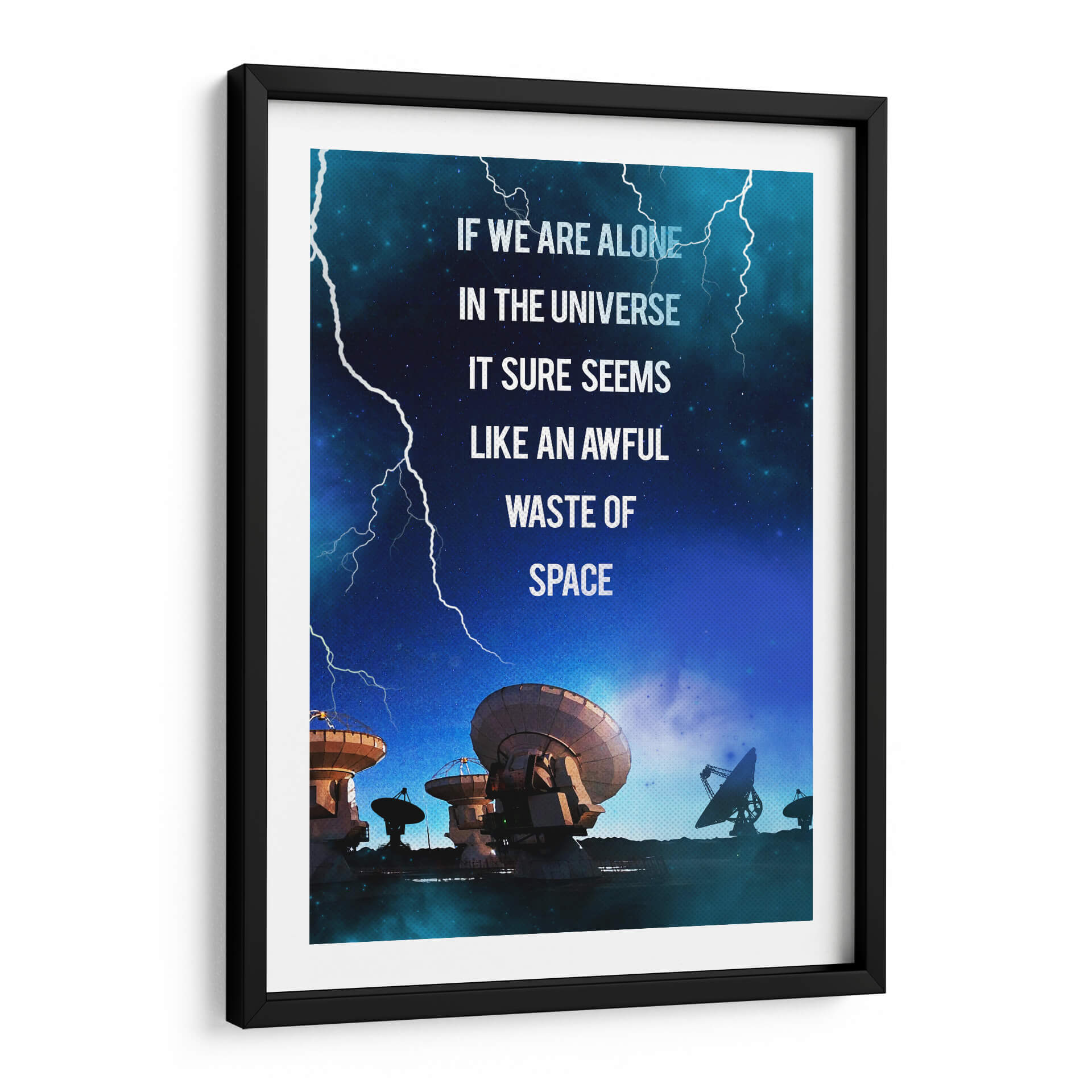 Sumérgete en las profundidades del cosmos con este impactante cuadro decorativo, "Contact Film". La obra captura una escena nocturna estrellada, dominada por el azul profundo del universo y atravesada por relámpagos blancos que añaden un toque de dramatismo. En primer plano, una serie de antenas parabólicas y radiotelescopios apuntan hacia el cielo, evocando la búsqueda de vida o señales en la inmensidad del espacio. La frase "IF WE ARE ALONE IN THE UNIVERSE IT SURE SEEMS LIKE AN AWFUL WASTE OF SPACE" (Si estamos solos en el universo, parece un terrible desperdicio de espacio) invita a la reflexión sobre nuestra existencia y el misterio que nos rodea. Ideal para amantes de la ciencia, la astronomía o aquellos que buscan una pieza de conversación para su hogar u oficina, este cuadro abstracto con toques de ciencia ficción aportará un aire de misterio y curiosidad a cualquier estancia. Su paleta de colores fríos y la composición dinámica lo convierten en un elemento decorativo moderno y con carácter, perfecto para inspirar grandes ideas y conversaciones profundas.