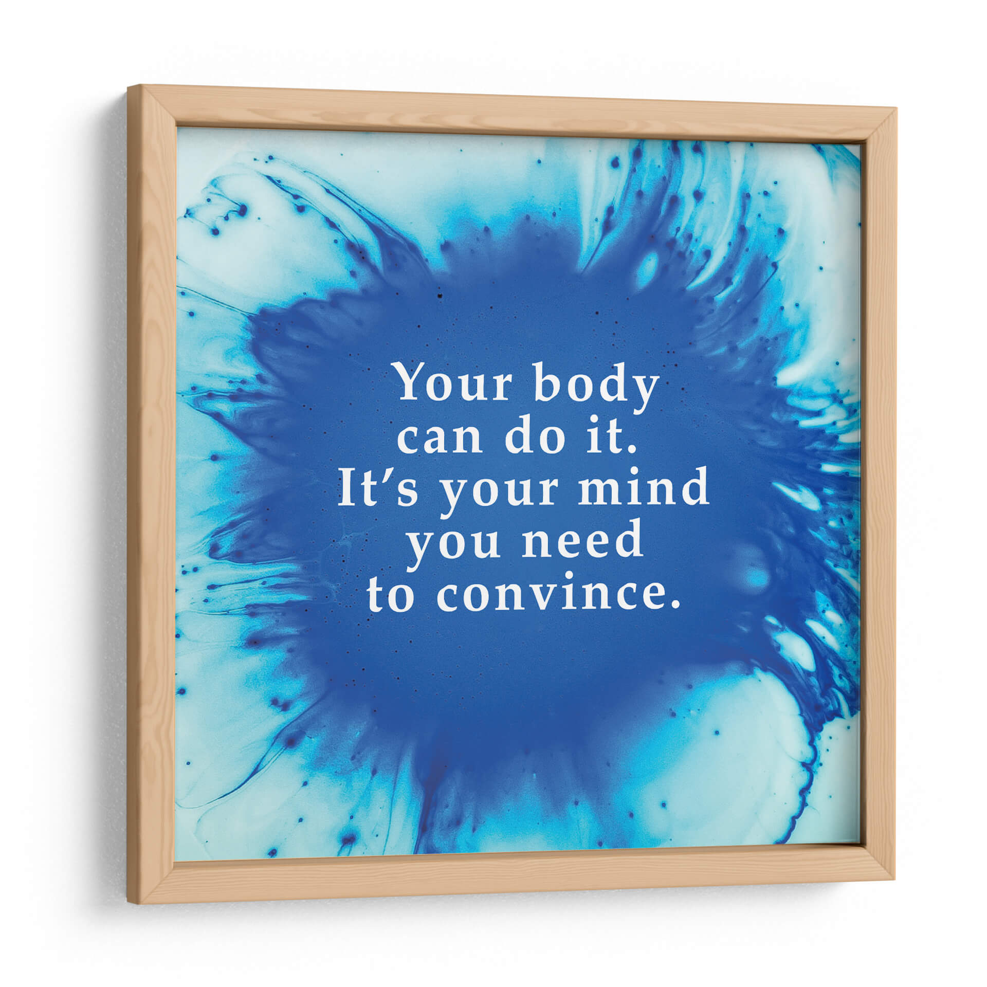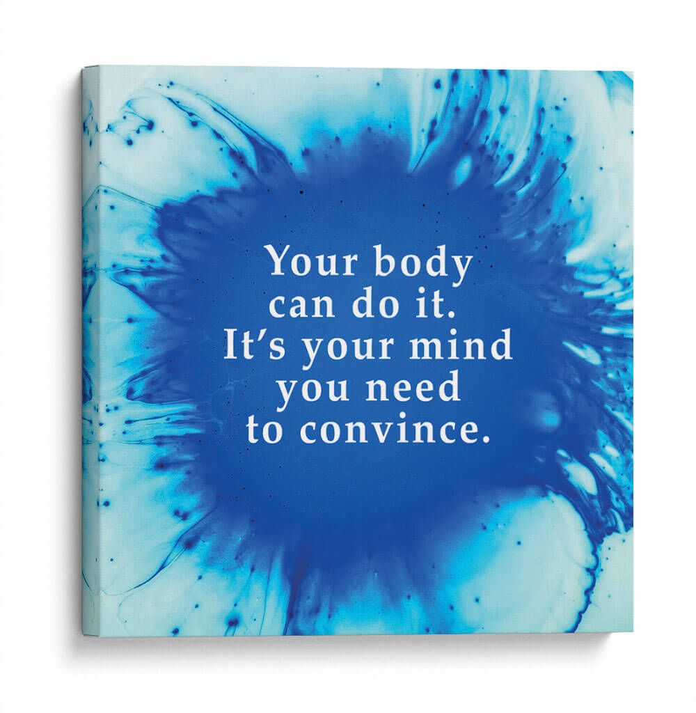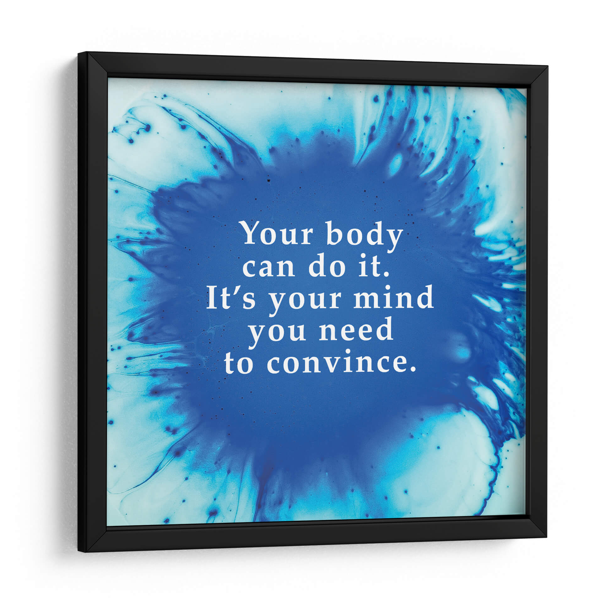 Transforma tu espacio con "Convince Your Mind", una obra de arte abstracta que irradia calma y determinación. La pieza presenta una explosión de tonos azules vibrantes y tenues, con un centro intenso que se expande hacia los bordes en un cautivador patrón orgánico. El contraste entre las profundidades del azul y los toques más claros crea una sensación de movimiento y profundidad, evocando la complejidad del pensamiento y la claridad mental. "Convince Your Mind" no es solo una decoración, es un recordatorio visual para superar los obstáculos internos y alcanzar el máximo potencial. La frase inspiradora "Your body can do it. It's your mind you need to convince." se integra armónicamente, añadiendo un nivel de significado y motivación a la composición. Este cuadro decorativo es perfecto para crear un ambiente reflexivo y empoderador en tu oficina, estudio o sala de estar. Su estilo abstracto y sus tonos azules lo convierten en una adición versátil para una decoración moderna o contemporánea, aportando serenidad y un toque de introspección a cualquier ambiente. Deja que esta obra te impulse a creer en tus capacidades.