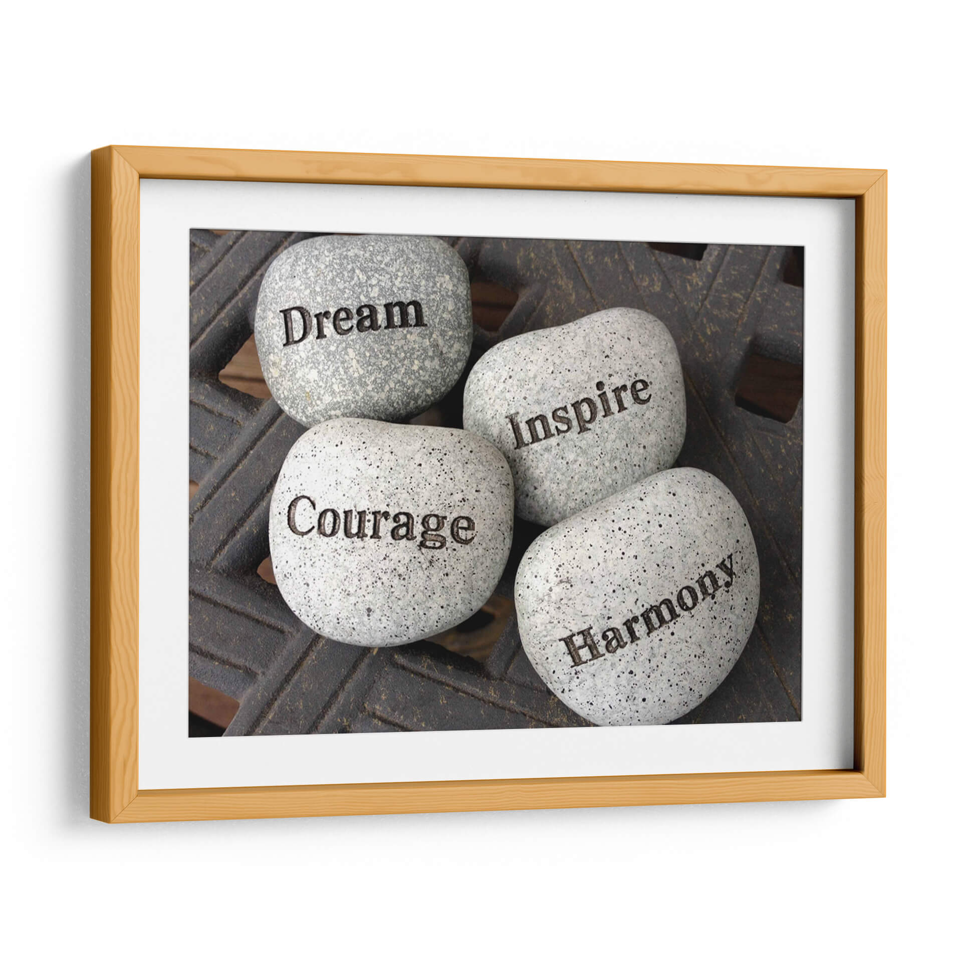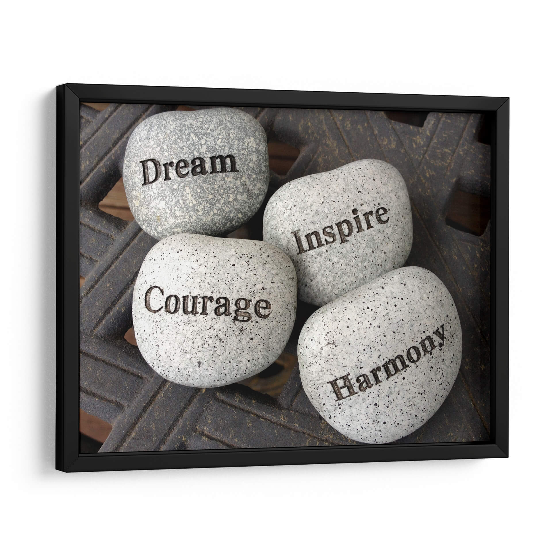 Inyecta inspiración y positividad en tu hogar con nuestro cuadro decorativo 'Dream, Inspire, Courage, Harmony'. Esta obra de arte presenta cuatro piedras lisas y redondeadas, cada una grabada con una palabra poderosa que fomenta la reflexión y el crecimiento personal: 'Sueño', 'Inspira', 'Coraje' y 'Armonía'. Las piedras, de tonos grises y con una textura sutilmente moteada, descansan sobre una superficie rústica de metal oscuro, creando un contraste visual que resalta la claridad de los mensajes grabados. La paleta de colores neutros y terrosos hace que esta pieza sea increíblemente versátil, integrándose sin esfuerzo en cualquier esquema de decoración, desde lo moderno y minimalista hasta lo rústico y orgánico. El estilo fotográfico y la composición cercana ofrecen una intimidad que invita a la contemplación. Ideal para crear un ambiente de calma y motivación en tu oficina, sala de estar o dormitorio, este cuadro es un recordatorio diario de las cualidades esenciales para una vida plena. Transforma tu espacio con un mensaje que eleva el espíritu y fomenta una actitud positiva, haciendo de cada día una oportunidad para soñar, inspirar, tener coraje y encontrar la armonía.