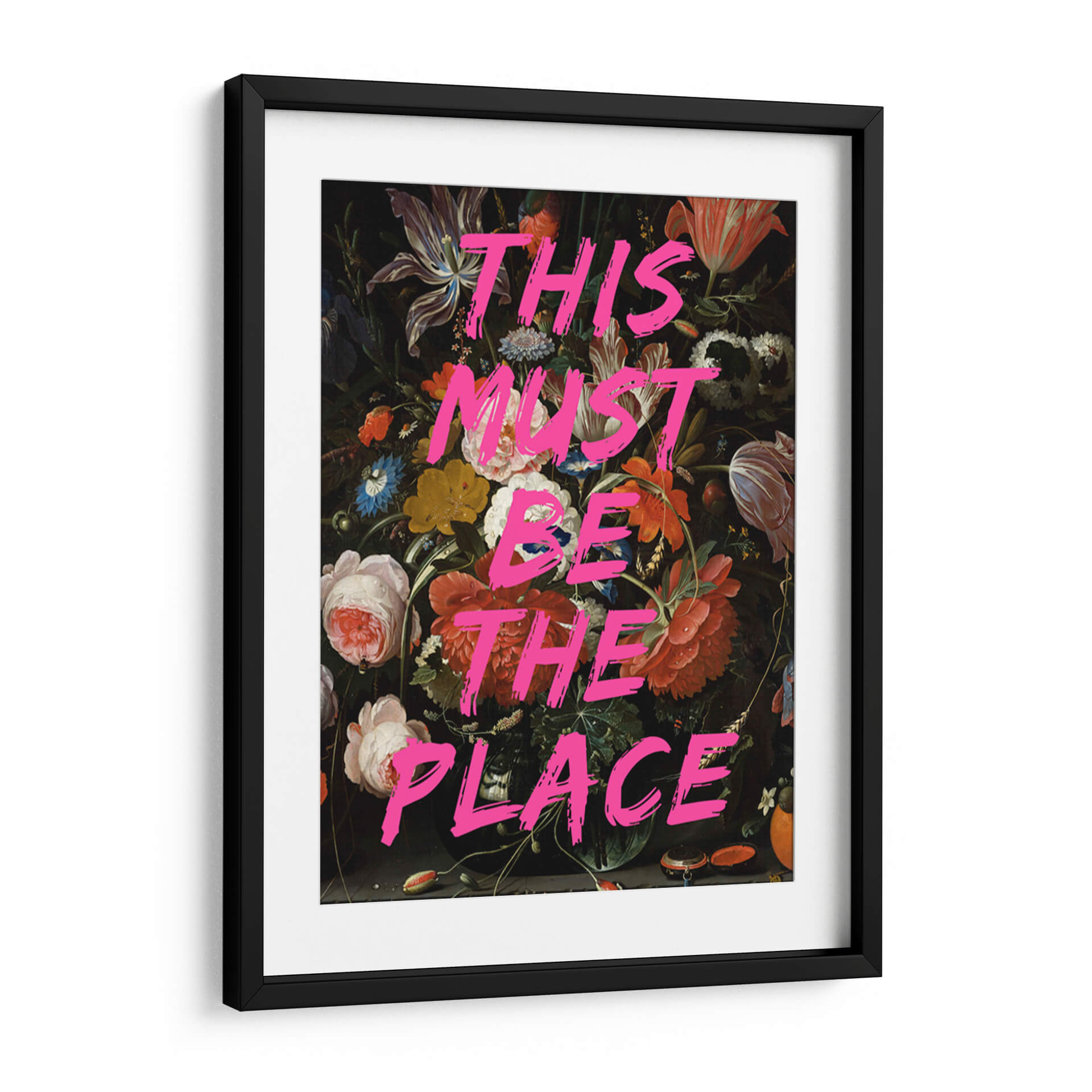 Descubre la cautivadora obra de arte "Este debe ser el lugar", una pieza que fusiona la opulencia de un bodegón clásico con la audacia del arte contemporáneo. La obra presenta un exuberante y detallado arreglo floral sobre un fondo oscuro y profundo, evocando la maestría de los pintores holandeses del siglo XVII. Flores como rosas, tulipanes y otras especies exuberantes se despliegan en una sinfonía de texturas y colores, desde rojos intensos y naranjas vibrantes hasta blancos nacarados y azules delicados. Sin embargo, lo que distingue a "Este debe ser el lugar" es la impactante intervención tipográfica en un vibrante color fucsia. La frase, escrita con una caligrafía enérgica y expresiva, contrasta radicalmente con la sutileza del fondo floral, creando una tensión visual fascinante y un mensaje moderno que resuena en el contexto actual. Esta pieza es perfecta para añadir un toque de personalidad, intriga y conversación a cualquier espacio, ya sea un salón moderno, un estudio creativo o un dormitorio con carácter. Transforma tu hogar u oficina con este cuadro decorativo único que celebra la belleza atemporal y la expresión contemporánea.