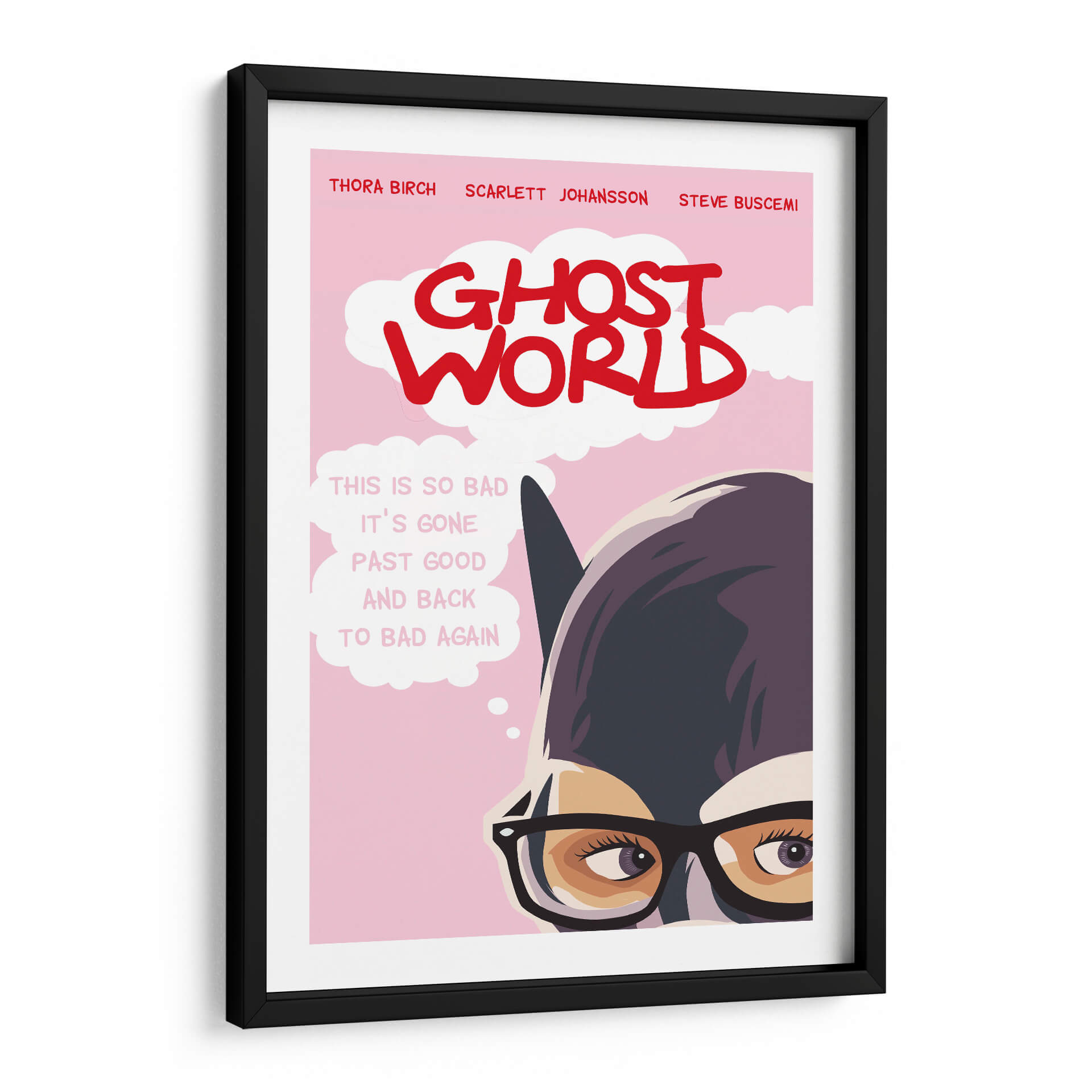Sumérgete en el enigmático universo de "Ghost World" con este cautivador cuadro decorativo, inspirado en la icónica película y su particular estética. La obra presenta una composición audaz y gráfica que evoca una sensación de nostalgia y reflexión adolescente. Predomina una paleta de colores pastel, con el rosa como telón de fondo, contrastando con el vibrante rojo del título y los tonos oscuros de la figura central. Los elementos visuales, que incluyen una figura con gafas gruesas y un aire pensativo, junto a nubes de pensamiento estilizadas, invitan a la contemplación. Este cuadro decorativo es ideal para añadir un toque de originalidad y personalidad a tu sala de estar, dormitorio o espacio de estudio. Su estilo moderno y minimalista se adapta perfectamente a decoraciones contemporáneas, aportando un punto de interés visual sin abrumar el ambiente. La frase "This is so bad it's gone past good and back again" añade una capa de ironía y humor sutil, haciendo de esta pieza un tema de conversación. Perfecto para amantes del cine independiente y el arte gráfico con un toque distintivo.