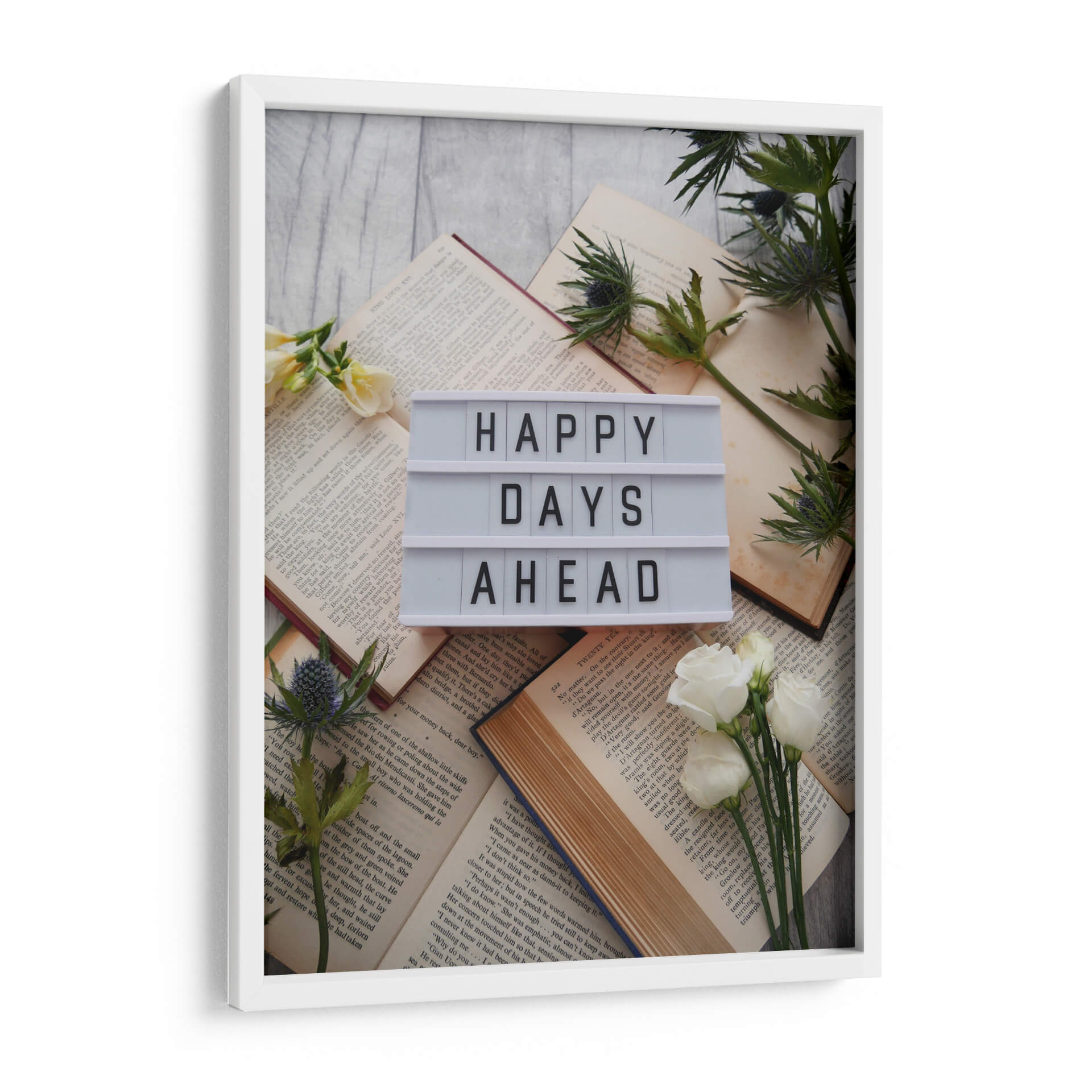 Transmite una onda de optimismo y serenidad con esta cautivadora obra de arte titulada "Happy days ahead". La pieza presenta un diseño minimalista y evocador sobre un fondo de páginas de libros antiguos, creando una atmósfera nostálgica y a la vez esperanzadora. El mensaje central, "Happy days ahead", se muestra en una moderna caja de luz blanca, contrastando elegantemente con la textura de papel envejecido y los suaves tonos de madera del fondo. La delicada adición de flores blancas y espigas verdes aporta un toque de naturaleza y frescura, realzando la sensación de tranquilidad y anticipación positiva. Esta composición, a medio camino entre lo conceptual y lo fotográfico, es perfecta para inspirar paz y motivación en cualquier espacio. Su estilo limpio y el mensaje inspirador la hacen ideal para colgar en la sala de estar, el dormitorio, la oficina o incluso un estudio, aportando un punto de luz y optimismo diario. Una pieza que invita a la reflexión y celebra la belleza de los momentos venideros, añadiendo un toque de encanto contemporáneo a tu decoración.