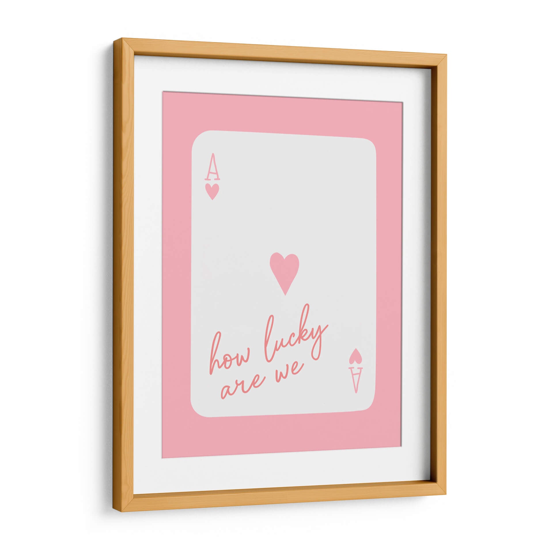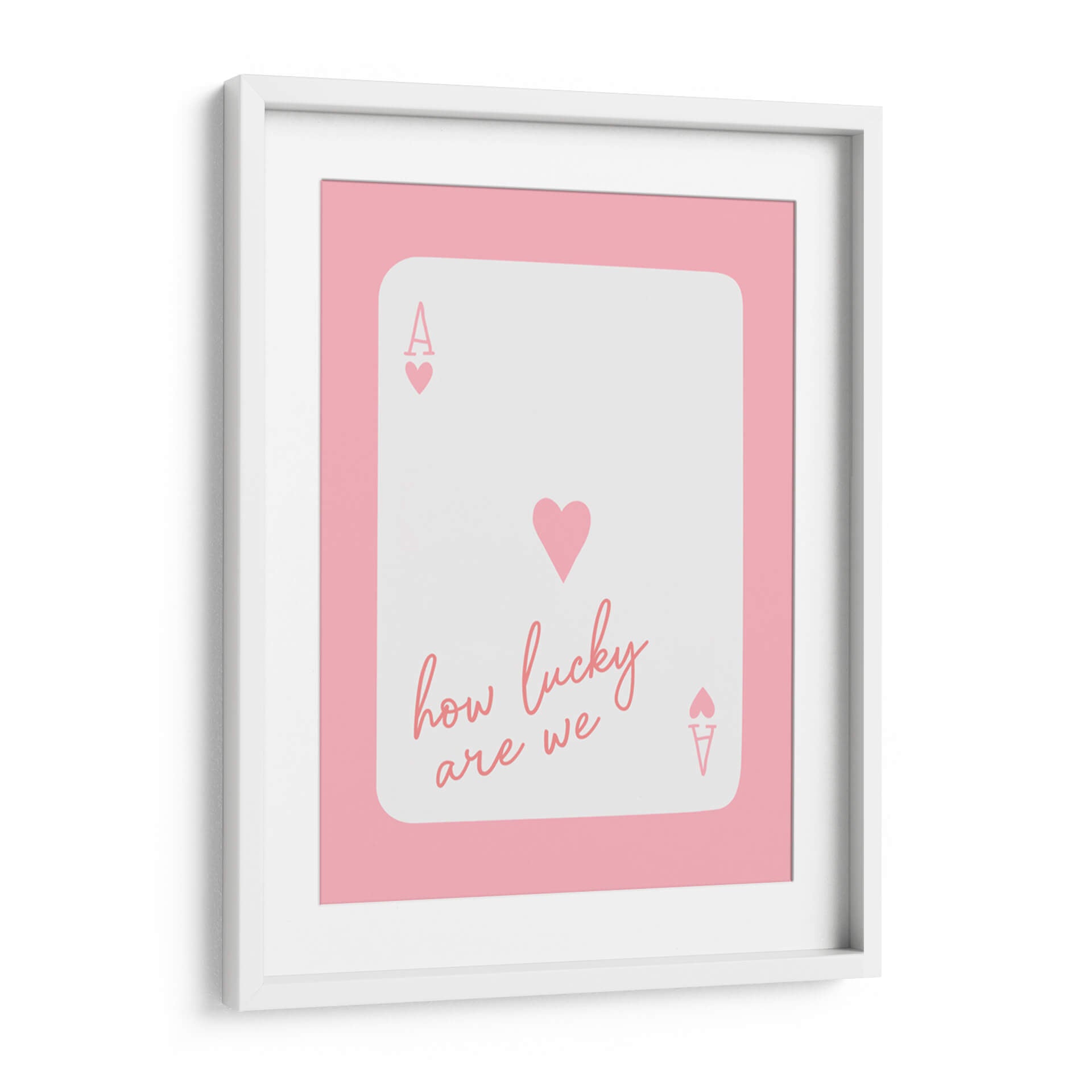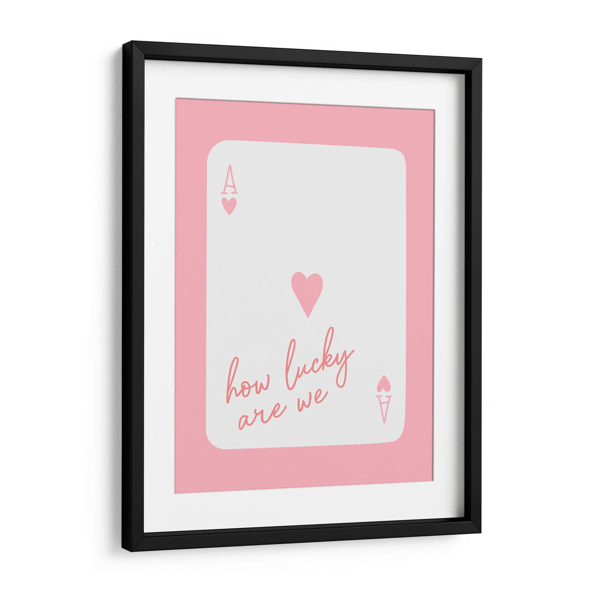 Inyecta una dosis de optimismo y estilo moderno a tu espacio con el cuadro decorativo "How Lucky Are We Ace Pink" del artista Jolly and Dash. Esta obra cautivadora presenta un diseño inspirado en una carta de póker, donde la figura del As se fusiona con un delicado corazón, transmitiendo una sensación de fortuna y afecto. La paleta de colores, dominada por un rosa suave y vibrante, junto con un fondo blanco puro y detalles en el mismo tono pastel, crea una atmósfera alegre y contemporánea. La tipografía manuscrita del lema "how lucky are we" añade un toque personal y cercano, invitando a la reflexión sobre los momentos valiosos de la vida. Su estilo minimalista y conceptual la convierte en una pieza versátil, ideal para salones, dormitorios o espacios de trabajo que busquen un acento de color y positividad. Este cuadro decorativo no solo embellecerá tus paredes, sino que también servirá como un recordatorio constante de la suerte y la alegría que nos rodea. Es una adición perfecta para quienes aprecian el arte moderno con mensajes inspiradores.