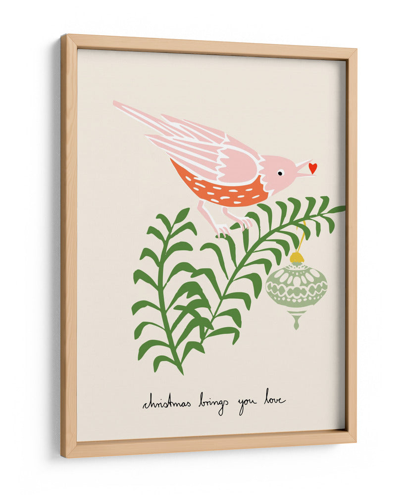 Celebra la temporada con este encantador cuadro decorativo que captura la esencia del amor navideño. La obra presenta un tierno pájaro posado en una rama frondosa, portando un pequeño corazón rojo en su pico, un símbolo universal de afecto y alegría. La paleta de colores, dominada por suaves tonos pastel como el rosa del pájaro y el verde vibrante de las hojas, se complementa con un delicado adorno navideño, creando una atmósfera dulce y acogedora. El estilo minimalista y la composición centrada en la figura del ave hacen de esta pieza un punto focal sutil pero significativo para cualquier espacio. El texto manuscrito 'christmas brings you love' refuerza el mensaje de calidez y unión, ideal para quienes buscan infundir un espíritu festivo y sentimental en su hogar u oficina. Este cuadro decorativo es perfecto para añadir un toque de ternura a tu decoración invernal, una pieza que evoca sonrisas y buenos deseos, perfecta para regalar o para darte un capricho en estas fechas especiales, resonando con la magia de la Navidad.