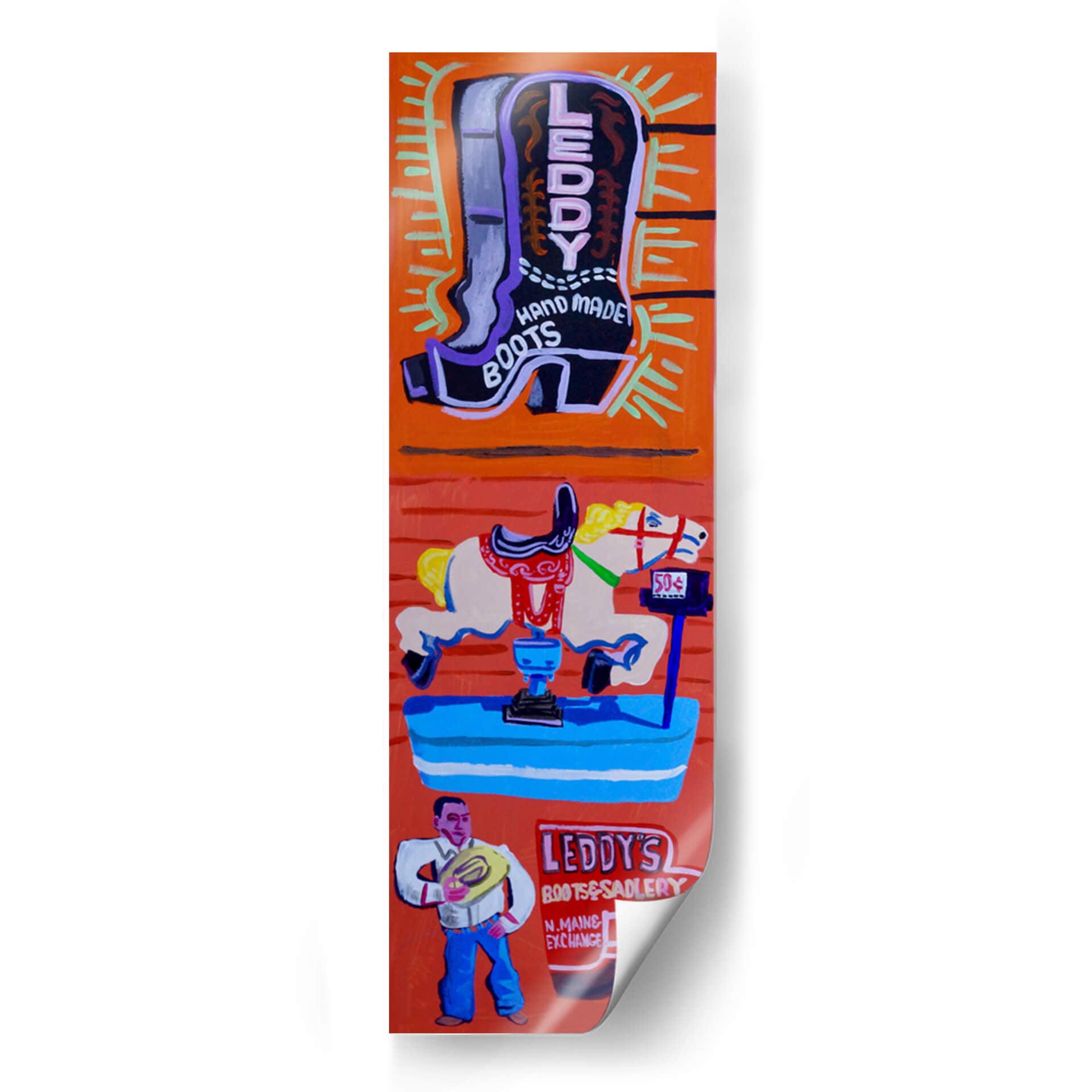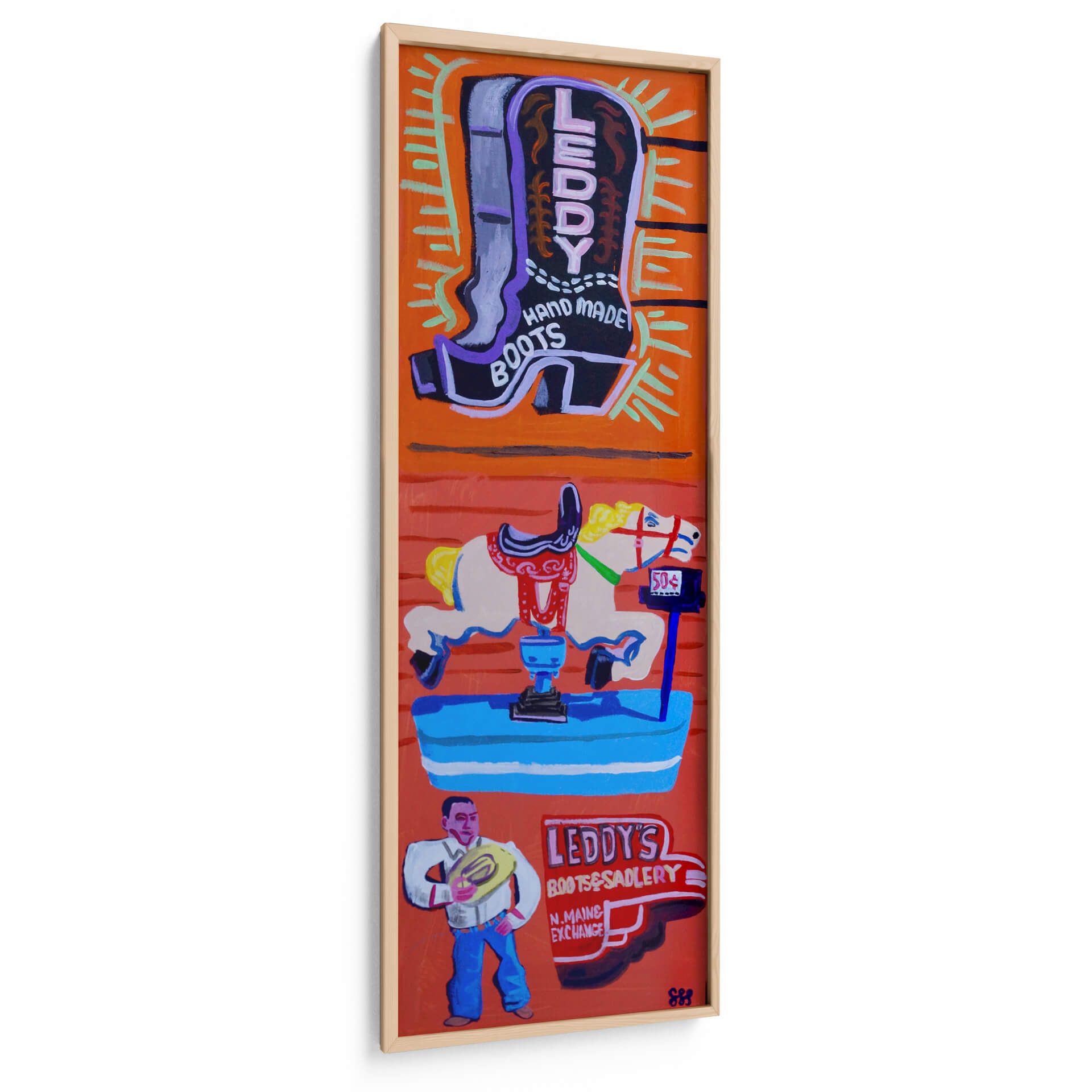 Sumérgete en el vibrante mundo de 'Leddy's', una obra de arte cautivadora del artista Steve Spencer que evoca una nostálgica escena de un viejoAdvertisement. Esta pieza vertical se despliega con una energía rústica y un encanto único, presentando un llamativo letrero de "Leddy's Hand Made Boots" en la parte superior, seguido por la imagen de un caballito de carrusel en movimiento y un hombre ofreciendo un sombrero de vaquero. La paleta de colores, dominada por el naranja intenso y acentuada con toques de púrpura, azul, blanco y amarillo, crea una atmósfera audaz y llena de vida. El estilo pictórico, con pinceladas visibles y una ejecución que recuerda al arte pop o a la pintura de letreros vintage, le confiere una autenticidad y un carácter inconfundible. "Leddy's" es más que un cuadro decorativo; es una ventana a una época pasada, perfecta para añadir un toque de personalidad y conversación a cualquier espacio, ya sea una sala de estar moderna, un estudio de diseño o un rincón con aire retro. Su composición vertical la hace ideal para pasillos o espacios estrechos, transformando paredes deslucidas en puntos de interés visual. Ideal para amantes del arte con un gusto por lo auténtico y lo nostálgico, esta obra promete ser un punto focal que incite a la reflexión y al disfrute visual, aportando calidez y carácter a tu decoración.