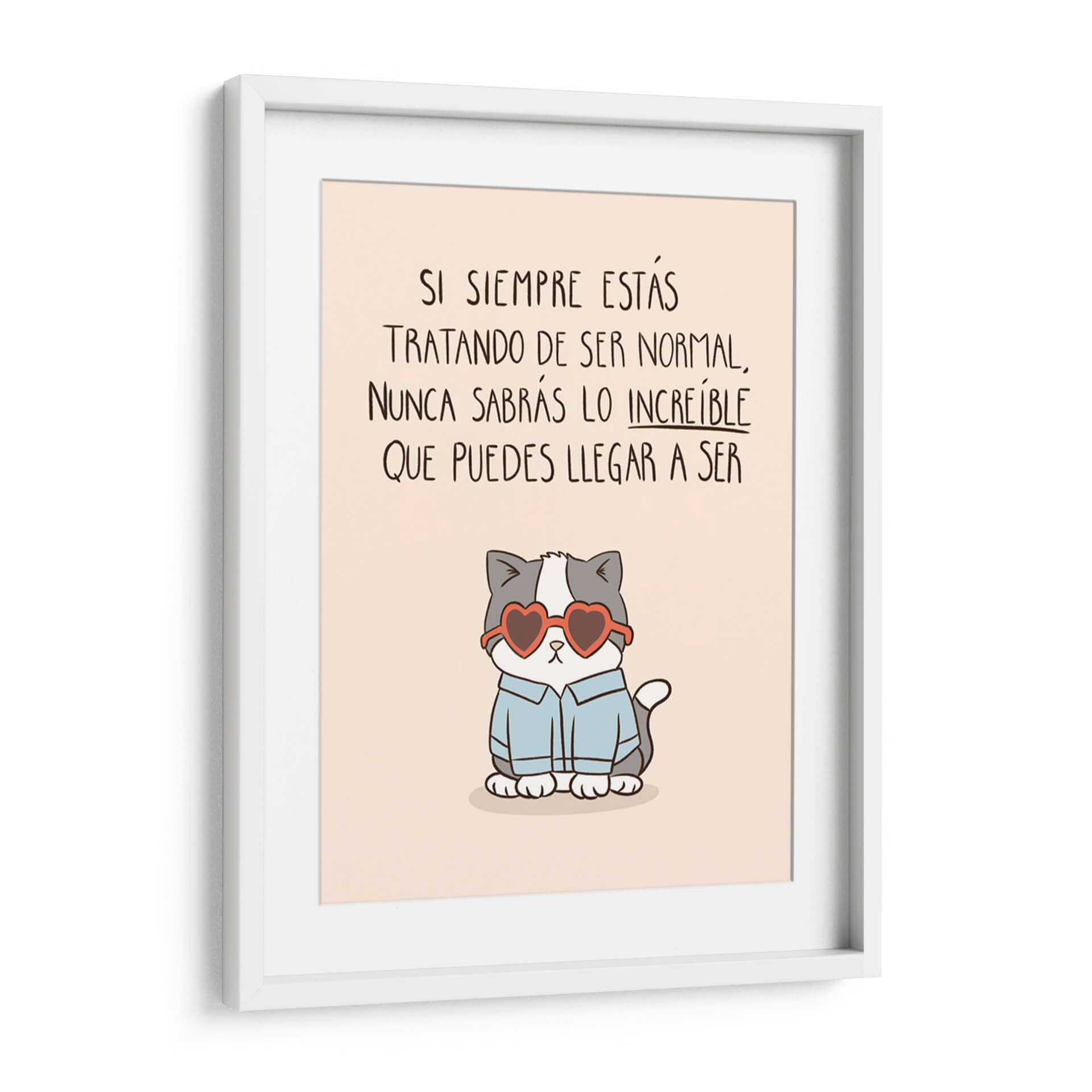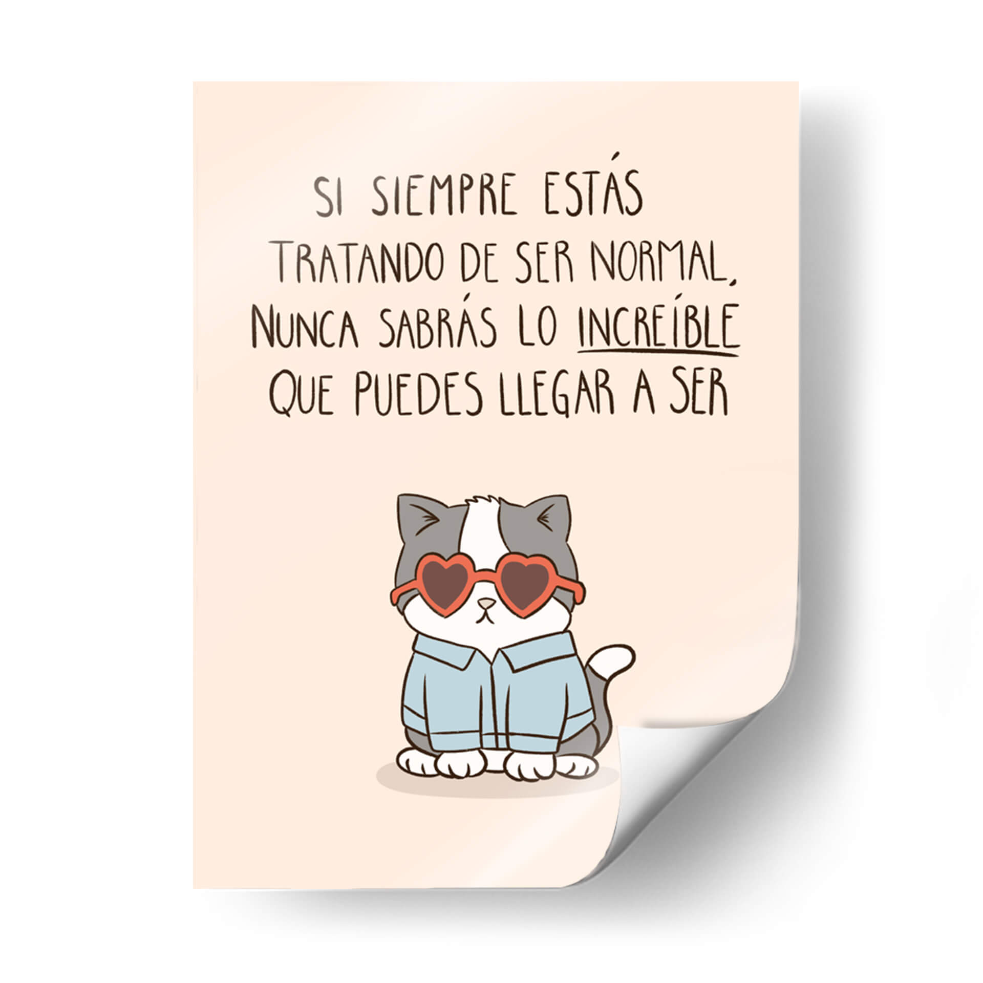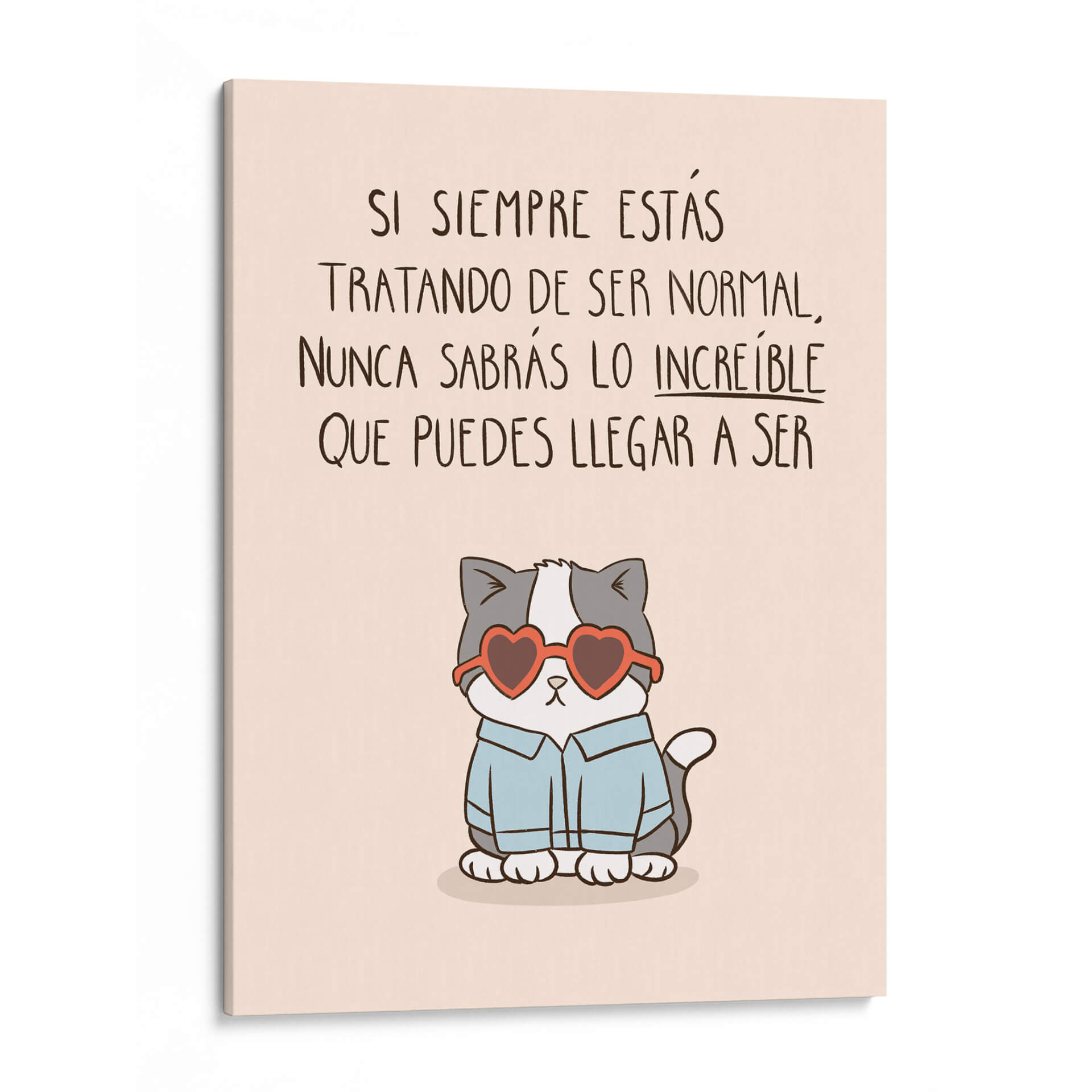 Inyecta una dosis de inspiración y originalidad en tu espacio con el cuadro "Lo increíble que puedes llegar a ser" de Maita San. Esta cautivadora obra presenta un adorable gato atigrado con gafas en forma de corazón y una chaqueta de tono pastel, irradiando una personalidad única y un estilo inconfundible. Sobre un fondo de color suave y neutro, la ilustración cobra vida con su diseño distintivo y simpático. El mensaje central, escrito en una tipografía manuscrita y audaz, es un poderoso recordatorio: "SI SIEMPRE ESTÁS TRATANDO DE SER NORMAL, NUNCA SABRÁS LO INCREÍBLE QUE PUEDES LLEGAR A SER". Esta pieza es perfecta para aquellos que celebran la individualidad y buscan rodearse de arte que motive y eleve el espíritu. Su paleta de colores sutiles y su composición centrada la hacen versátil para cualquier ambiente, desde una oficina moderna hasta un dormitorio acogedor o una sala de estar llena de carácter. Dale un toque de humor, audacia y positividad a tu decoración con este cuadro que inspira a abrazar lo extraordinario y a nunca dejar de explorar nuestro propio potencial. Es una adición fantástica para quienes buscan arte motivacional, citas inspiradoras o simplemente una pieza con un encanto felino inigualable y un mensaje profundo.