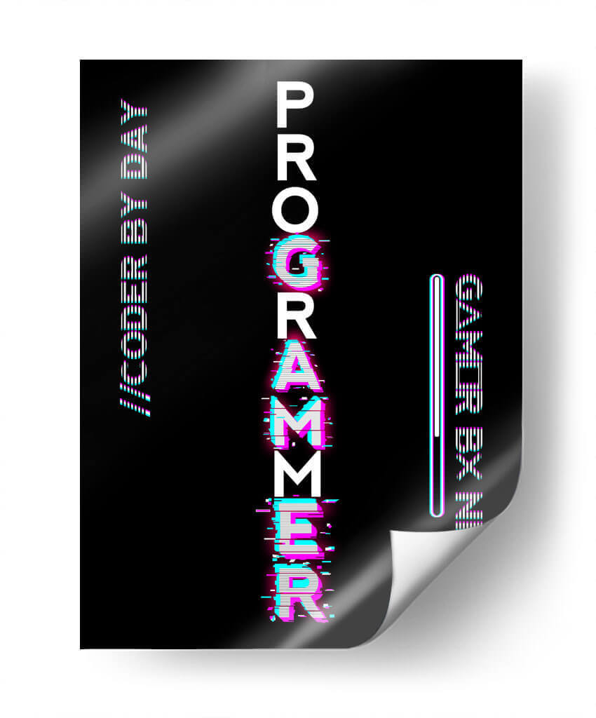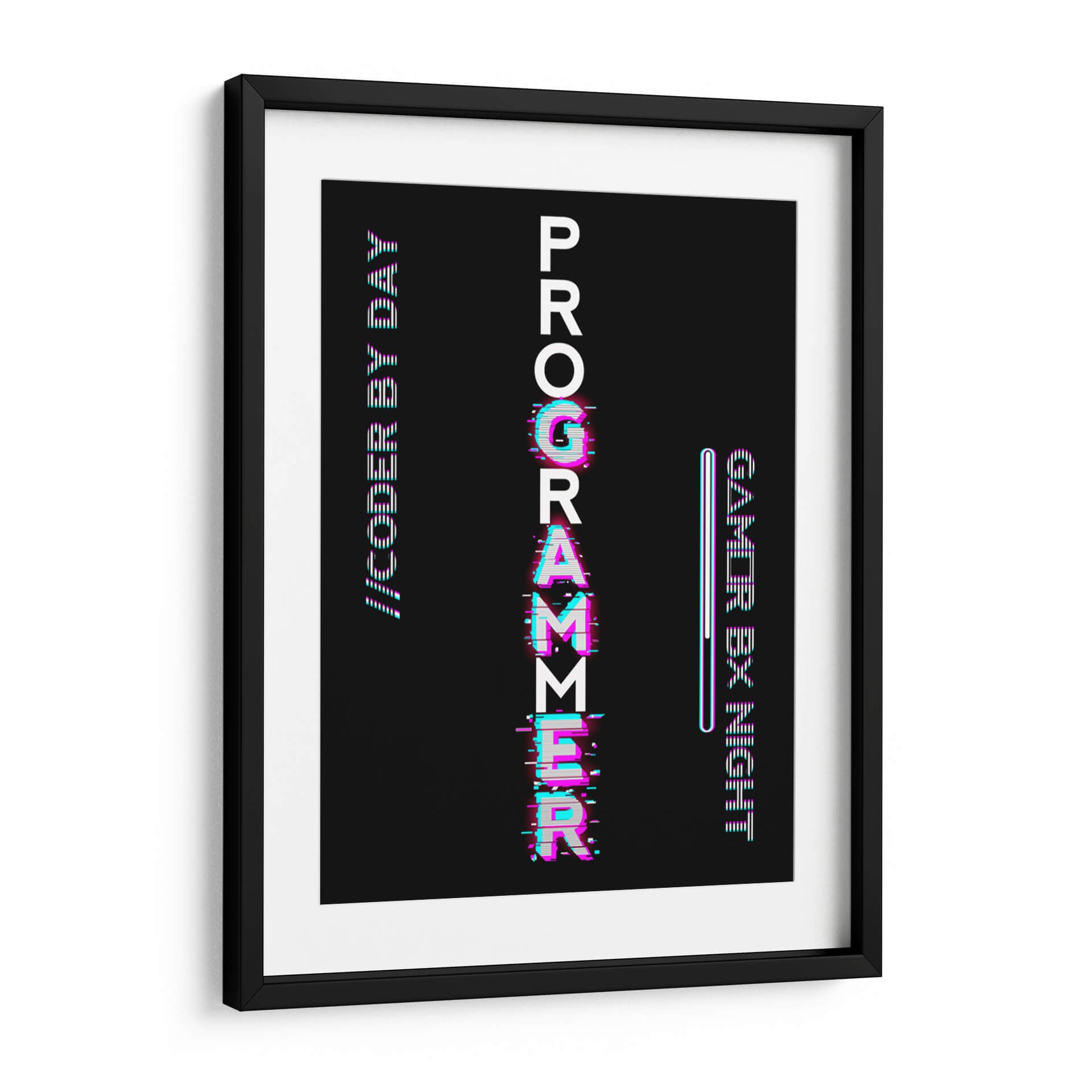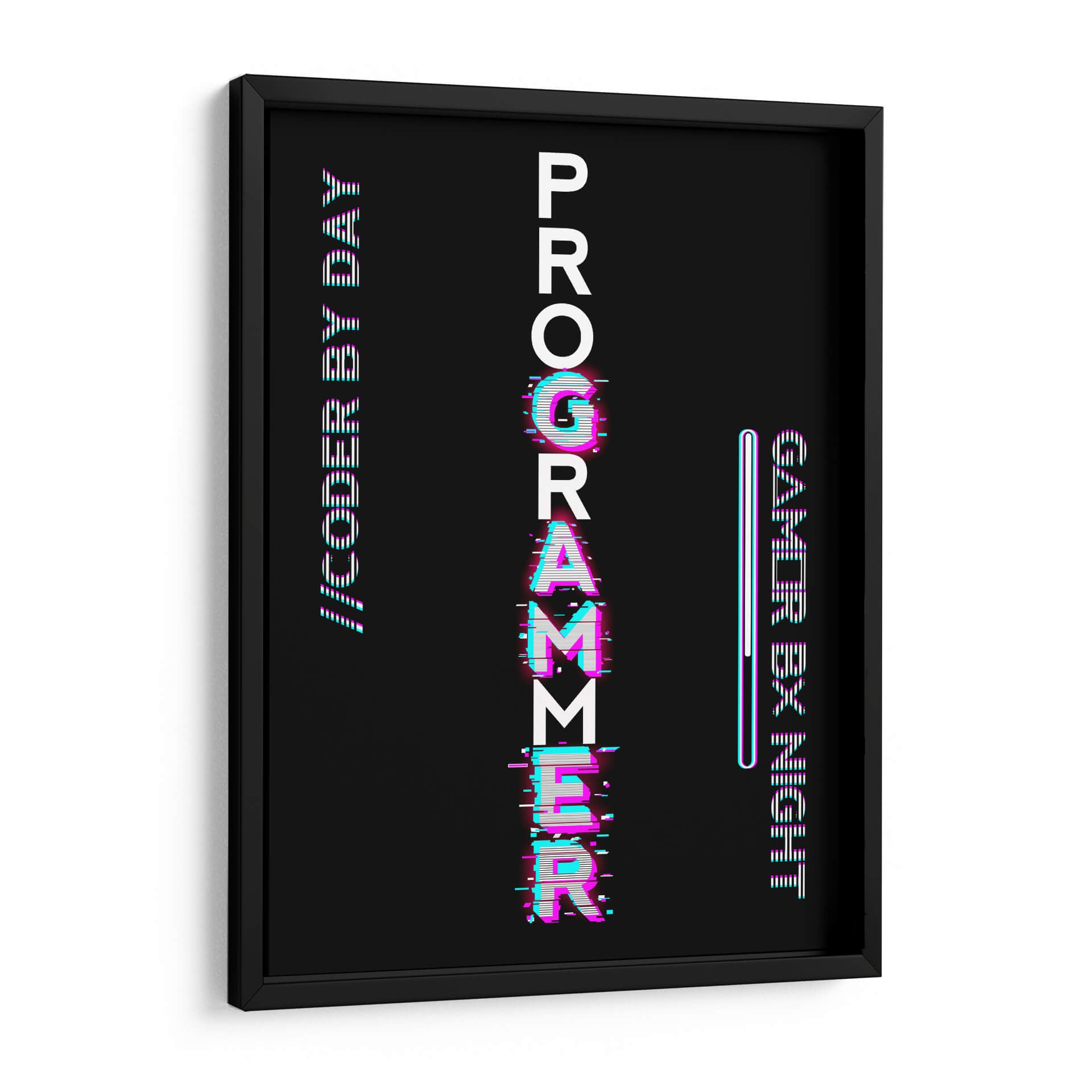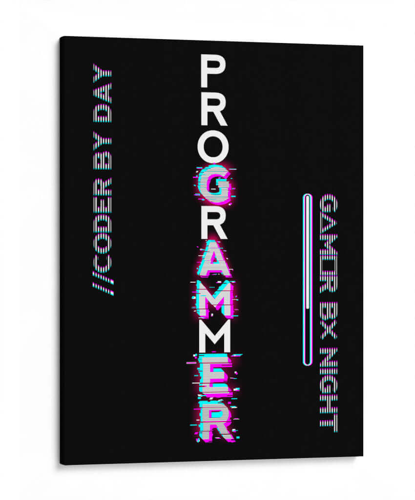 Transforma tu espacio con este cautivador cuadro decorativo "Programador y Gamer", una obra que rinde homenaje a la dualidad de la vida moderna con un estilo visual impactante. La pieza presenta un diseño tipográfico audaz sobre un fondo negro profundo, donde la palabra "PROGRAMMER" se despliega verticalmente, adornada con un efecto glitch vibrante en tonos fucsia y cian. A su lado, la frase "GAMER BY NIGHT" se complementa con una línea estilizada, evocando la energía y el enfoque de estas pasiones. Las sutiles distorsiones visuales añaden un toque contemporáneo y dinámico, perfecto para aquellos que aprecian la estética digital y la cultura geek. Este cuadro decorativo es ideal para personalizar oficinas en casa, salas de juego o cualquier rincón que necesite una inyección de personalidad y un guiño a la tecnología. Su diseño minimalista pero lleno de carácter lo convierte en un punto focal que dialoga con la estética moderna, industrial o incluso urbana. Añade un toque de ingenio y estilo a tu decoración con esta pieza única que celebra el mundo de la programación y los videojuegos.