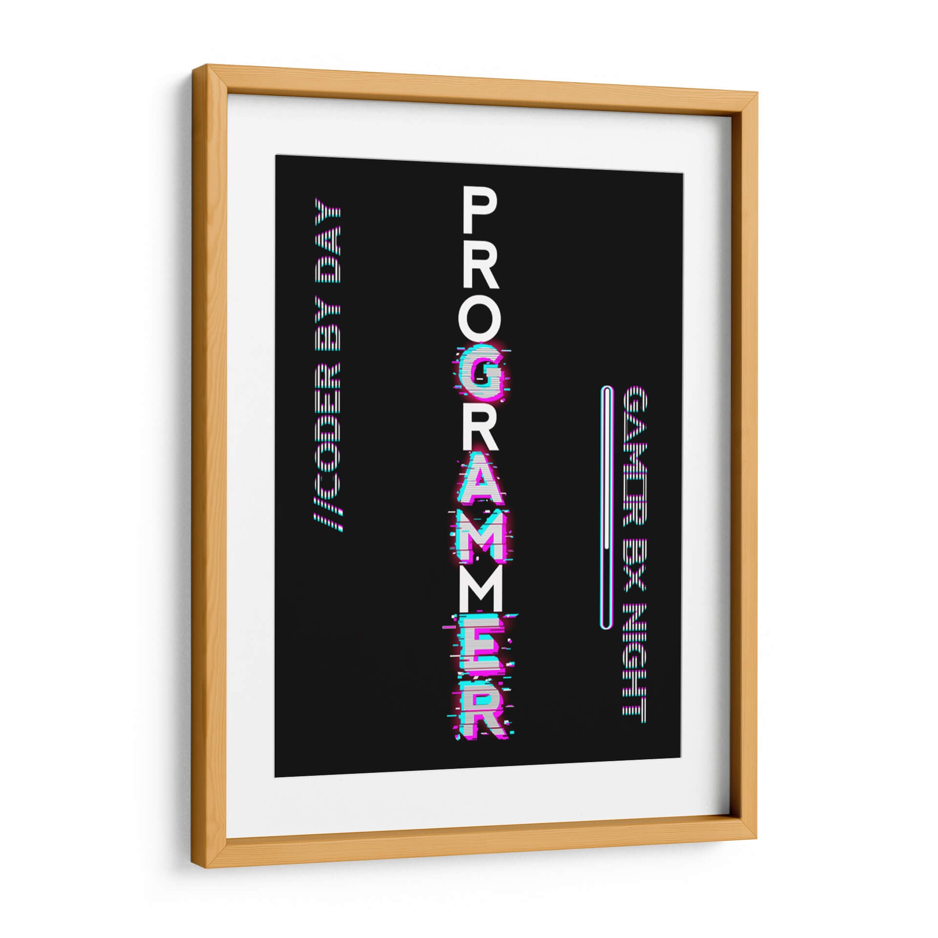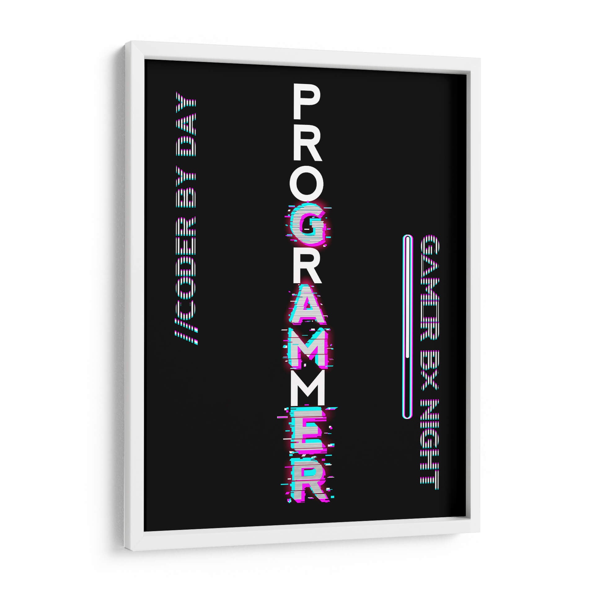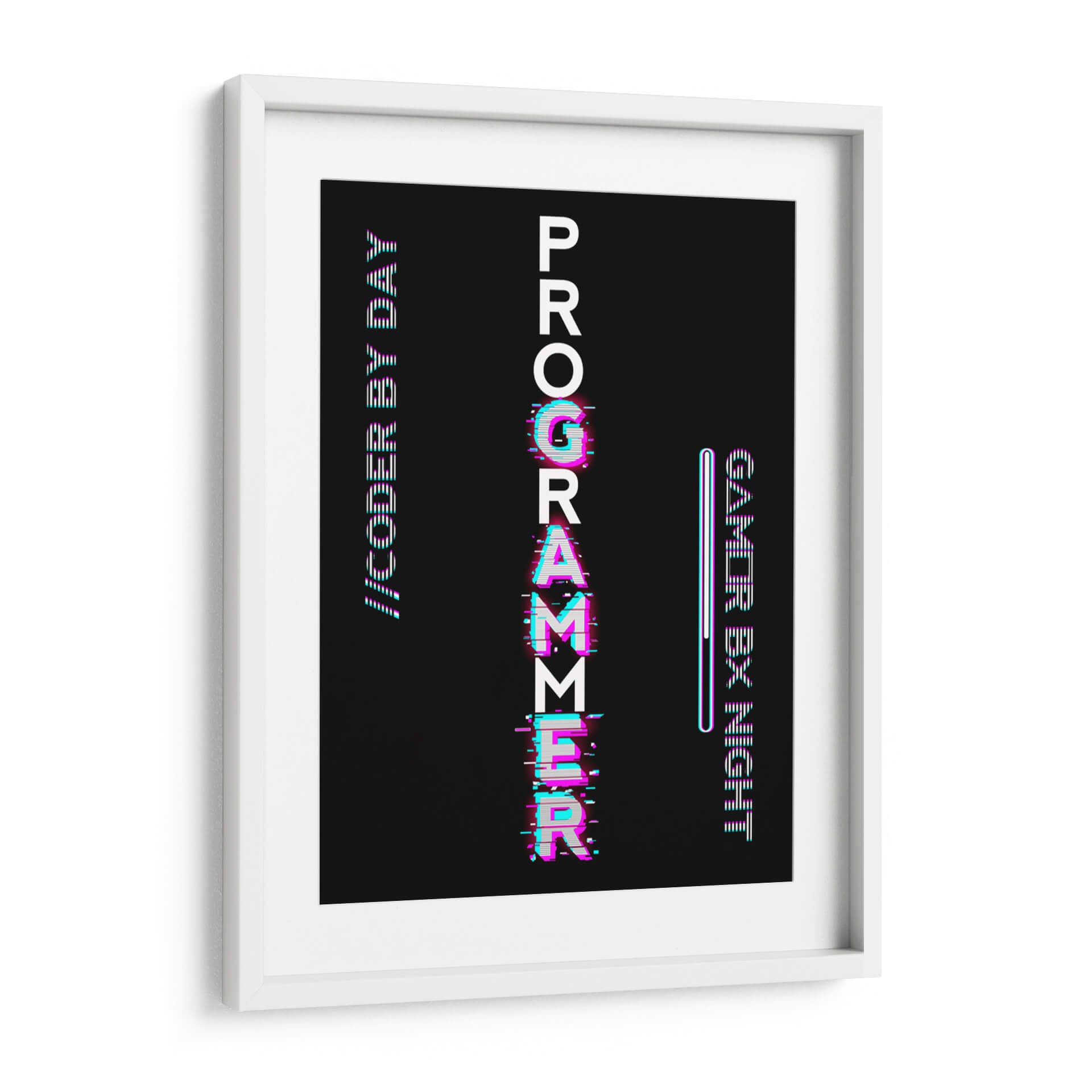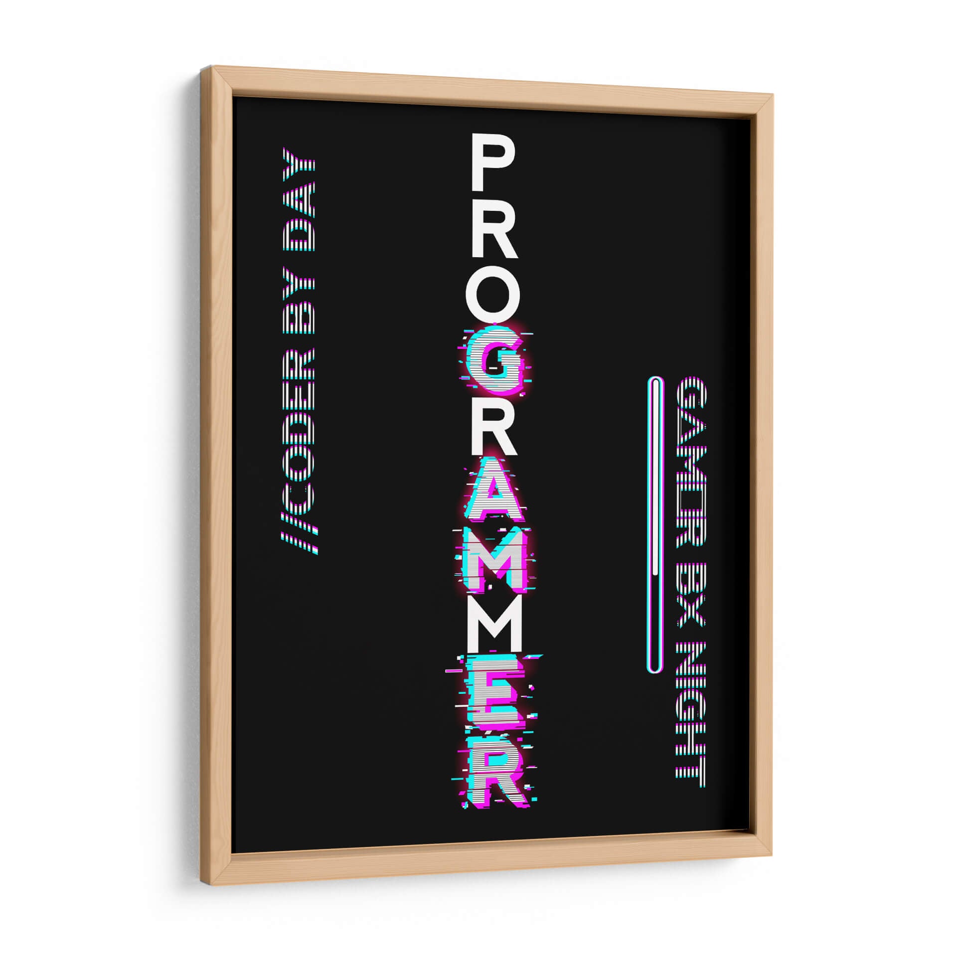 Transforma tu espacio con este cautivador cuadro decorativo "Programador y Gamer", una obra que rinde homenaje a la dualidad de la vida moderna con un estilo visual impactante. La pieza presenta un diseño tipográfico audaz sobre un fondo negro profundo, donde la palabra "PROGRAMMER" se despliega verticalmente, adornada con un efecto glitch vibrante en tonos fucsia y cian. A su lado, la frase "GAMER BY NIGHT" se complementa con una línea estilizada, evocando la energía y el enfoque de estas pasiones. Las sutiles distorsiones visuales añaden un toque contemporáneo y dinámico, perfecto para aquellos que aprecian la estética digital y la cultura geek. Este cuadro decorativo es ideal para personalizar oficinas en casa, salas de juego o cualquier rincón que necesite una inyección de personalidad y un guiño a la tecnología. Su diseño minimalista pero lleno de carácter lo convierte en un punto focal que dialoga con la estética moderna, industrial o incluso urbana. Añade un toque de ingenio y estilo a tu decoración con esta pieza única que celebra el mundo de la programación y los videojuegos.